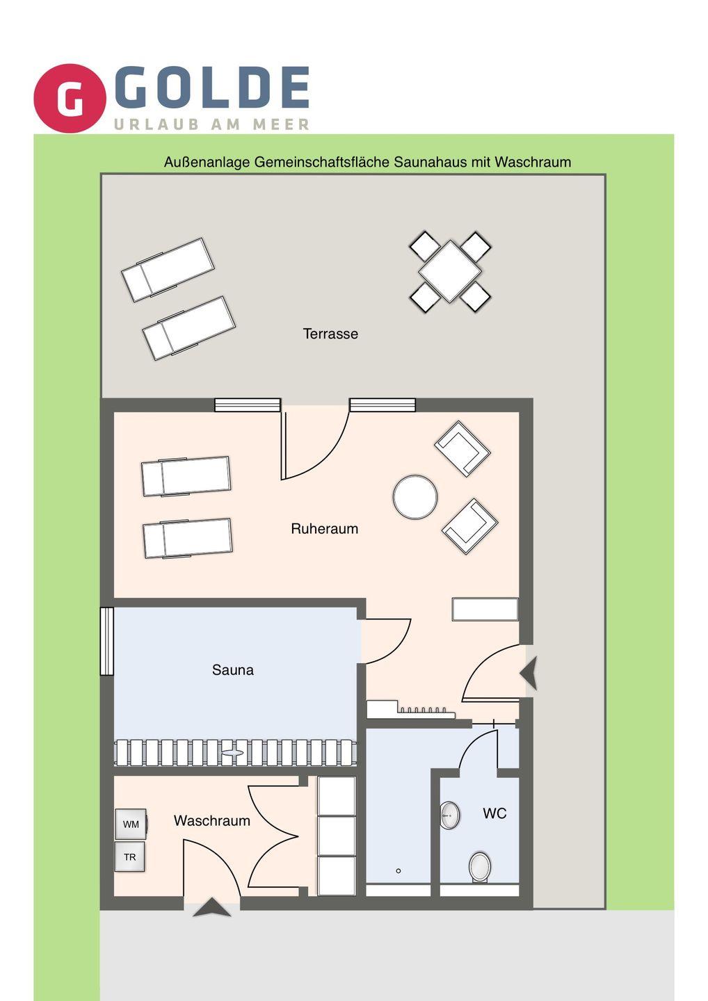 Auf dem Grundstück befindet sich eine hochwertige Außensauna mit Ruheraum für genügend Freiraum zur Erholung. Die Gemeinschaftssauna ist von allen 15 Appartements aus dem Haus nutzbar, sowie die Waschmaschinen und der Trockner im Waschraum.