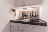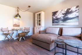 Die Wohnung für 2 Personen hat eine Größe von 36 qm und bietet Ihnen einen traumhaften Blick auf den Deich. Der Wohnbereich der Ferienunterkunft verfügt über einen gemütlichen Sitzbereich und einen Esstisch mit 2 Stühlen. Vom Wohnbereich gelangen Sie auf den Balkon wo ebenfalls ein Tisch mit 2 Stühlen steht. Die Küche ist ausgestattet mit einem 2 Plattenherd, Dunstabzugshaube, Garderobe, Geschirr, Kaffeemaschine, Kochtöpfe, Küchenzeile, Kühlschrank, Toaster, und einem Wasserkocher.