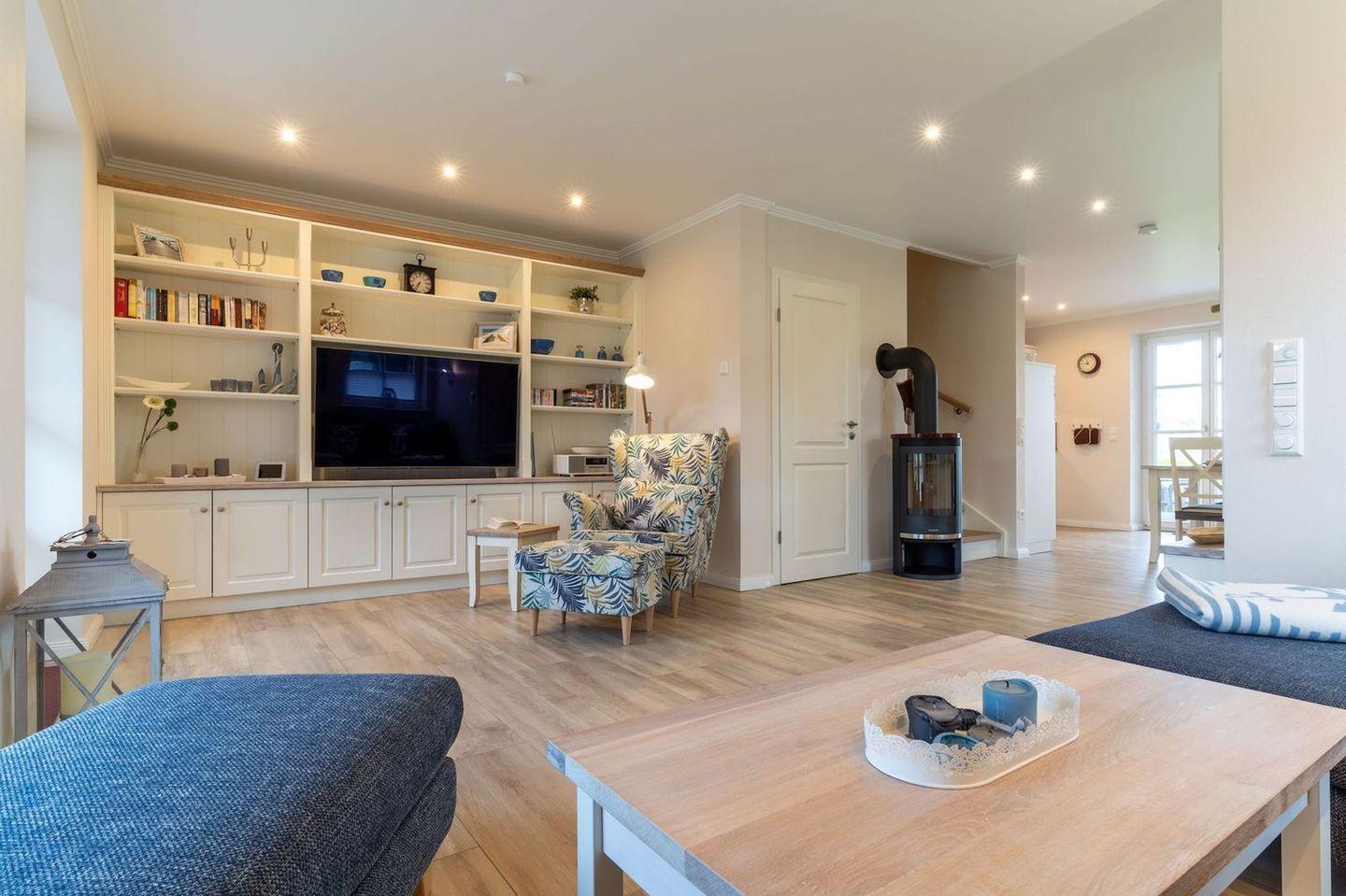 Im Erdgeschoss befindet sich der lichtdurchflutete Wohnraum mit TV, Kamin, einer offenen Küche sowie einem stilvollen Essbereich.