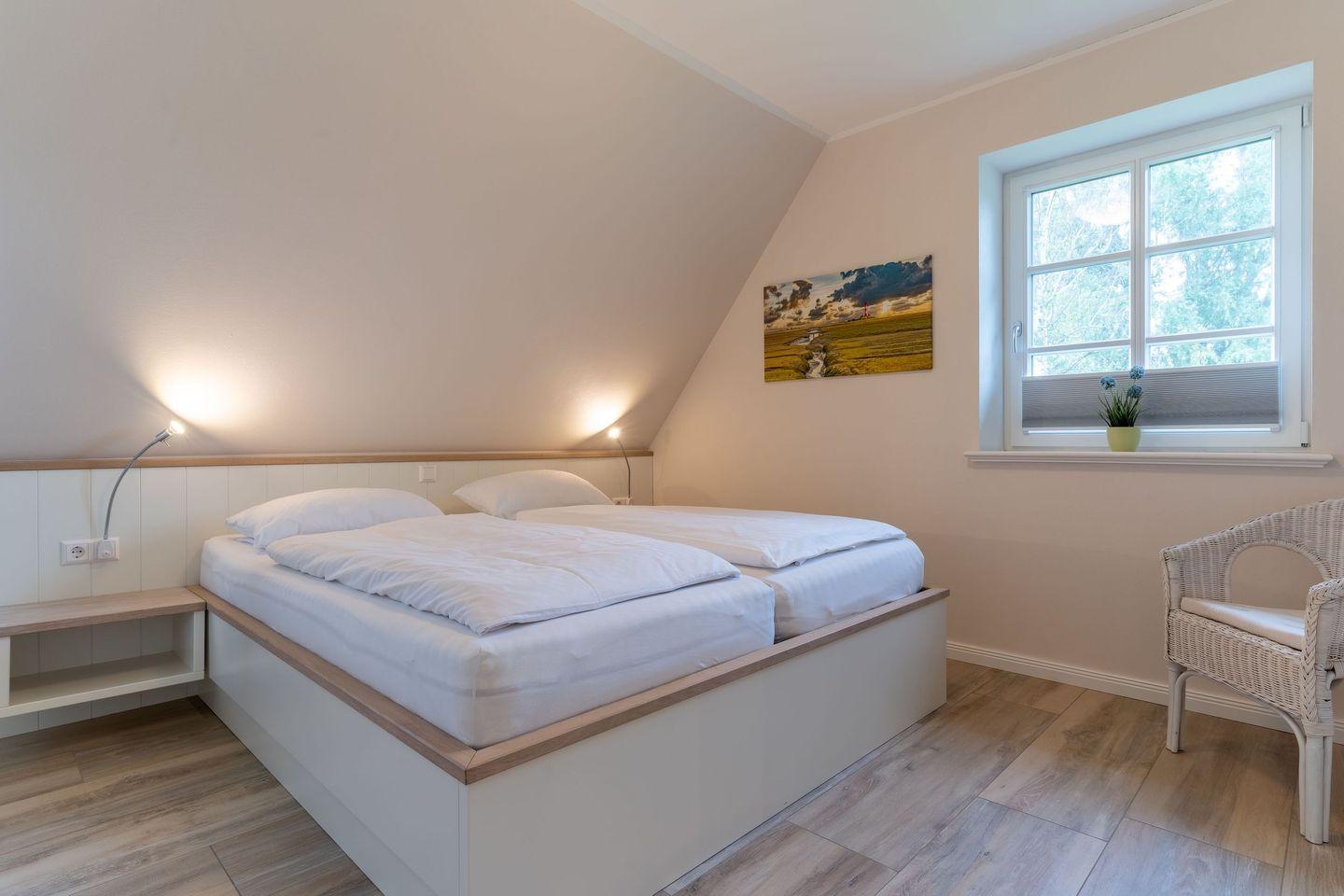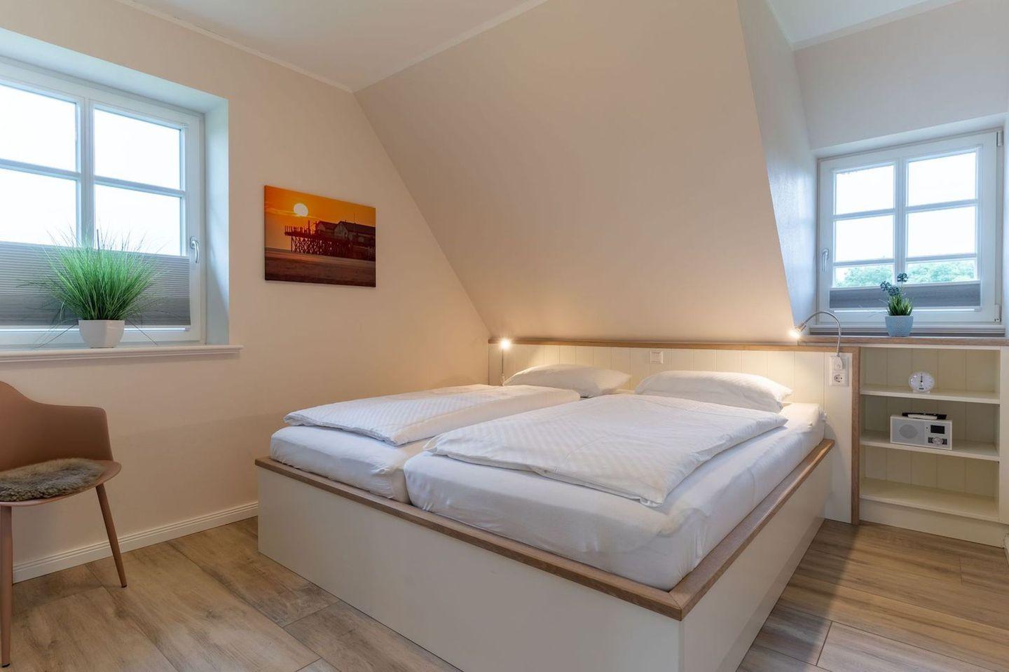 Über eine Holztreppe gelangt man in das Obergeschoss. Die beiden Schlafzimmer, jeweils mit einem Doppelbett sorgen für ruhevolle Erholung. Einbauschränke gewähren Ihnen hinreichend Ablageflächen.