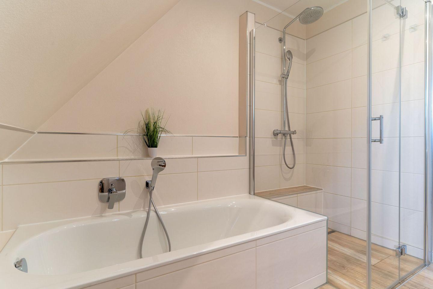 Darüber hinaus befindet sich im Obergeschoss ein weiteres, geräumiges Bad mit Dusche und Badewanne.