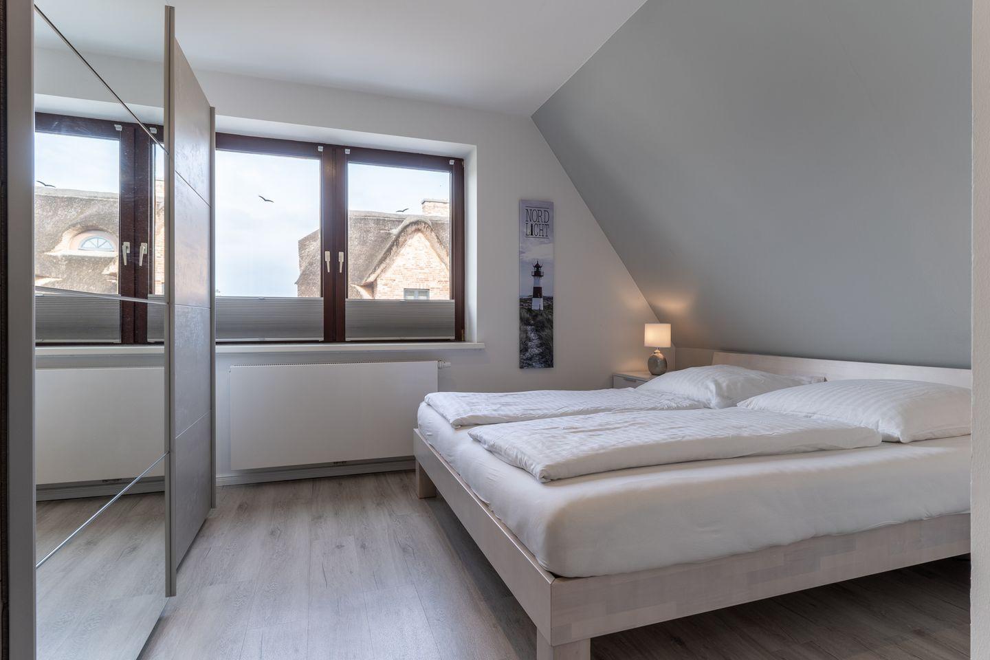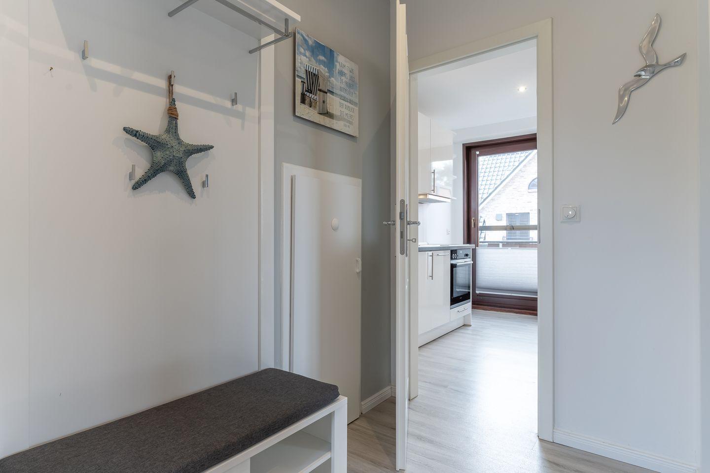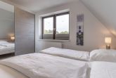 Die 45m² große Ferienwohnung welche im Jahr 2020 vollständig saniert wurde, liegt im Obergeschoss und bietet bis zu 4 Personen Platz für einen unvergesslichen Urlaub in St. Peter-Ording. Durch die Lage und Ausstattung ist die Ferienwohnung besonders familienfreundlich, Kinder sind hier herzlich willkommen. Die Ferienwohnung verfügt über einen nach Südwesten hin ausgerichteten, vollständig möblierten Balkon, der Abendsonne für ein herrliches Beisammensein bietet. Auch Urlaub mit Hund in St. Peter-Ording ist hier möglich. Das moderne Wohnzimmer ist hell und freundlich gestaltet. Zur Ausstattung gehören eine komfortable Couch und der große Esstisch, an dem die ganze Familie Platz findet. Die Couch lässt sich zum komfortablen Schlafplatz für 2 Personen umfunktionieren. Für die multimediale Unterhaltung sorgen ein großer Flachbild-TV, Radio mit Bluetooth und kostenfreies W-LAN. Für die Versorgung im Urlaub sorgt die vollumfassend ausgestattete, angrenzende Küche der Ferienwohnung. Hier stehen neben Cerankochfeld und Backofen noch Kühlschrank, Mikrowelle und Nespresso-Maschine bereit. Ein Waschtrockner steht für Gäste kostenfrei zur Verfügung. Orangenpresse und Milchaufschäumer gehören ebenfalls zum Inventar. Im hellen, einladenden Schlafzimmer steht ein komfortables 170x200cm Doppelbett zur Verfügung. Zur edlen Ferienwohnung gehören weiterhin Duschbad mit WC und Haartrockner. Die meisten Fenster der Ferienwohnung sind mit Fliegenschutzgitter und Verdunklungsplissees ausgestattet. Die große Fensterfront ist mit elektrischem Außenrollo ausgestattet, um Licht und Sichtschutz nach Belieben regulieren zu können.