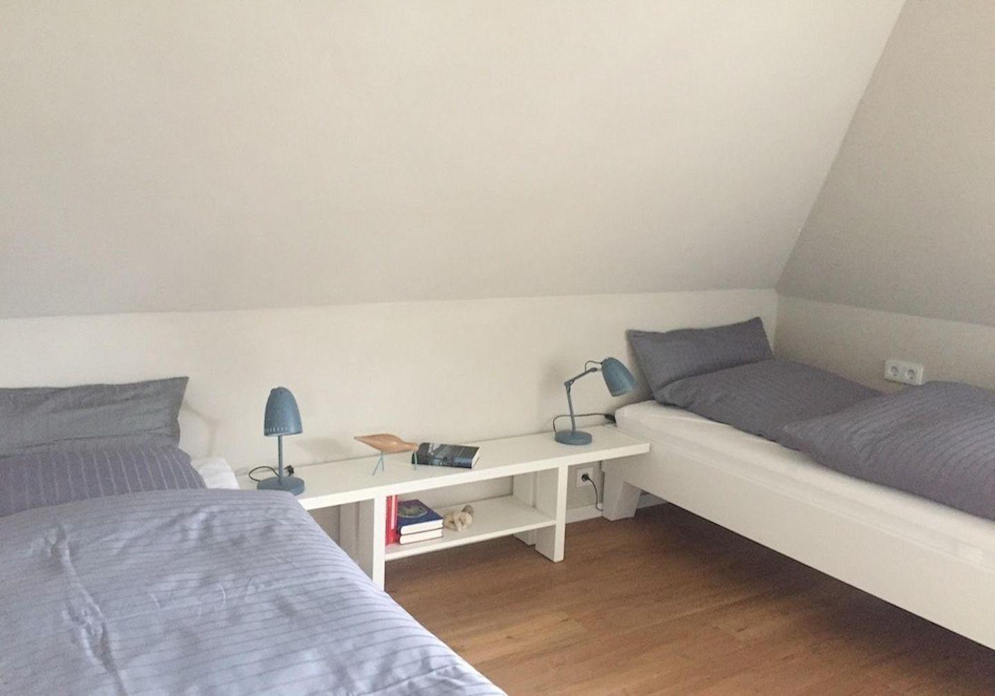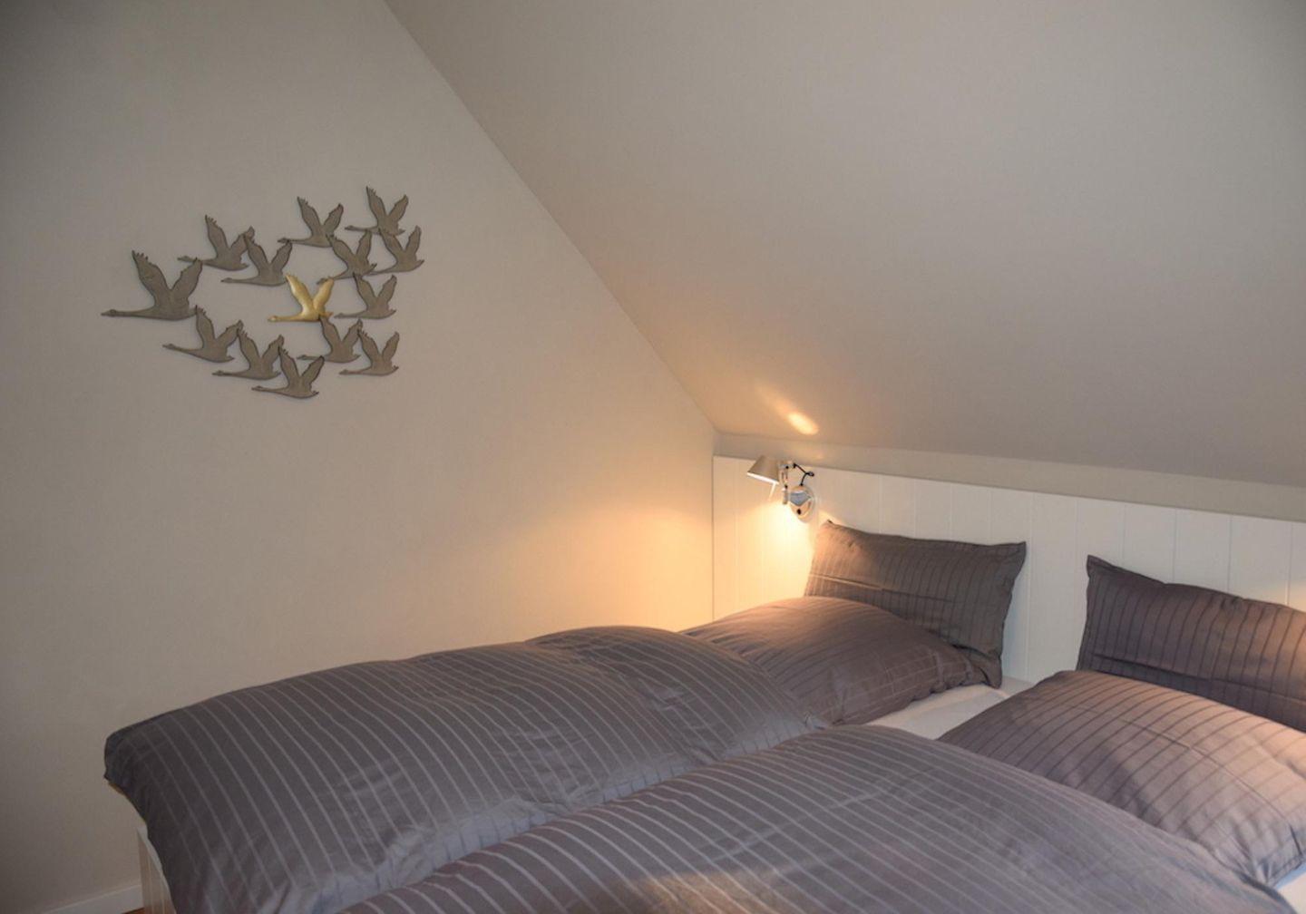 Obergeschoss: Zwei großzügige Doppelschlafzimmer - eines mit einem 180er breiten Doppelbett und kleinem Balkon, das andere mit zwei Einzelbetten - jeweils mit hochwertigen Einzel-Matratzen ausgestattet und offenem Fußende; Verdunkelungsrollos oder verdunkelnde Vorhänge und Fliegengitter.