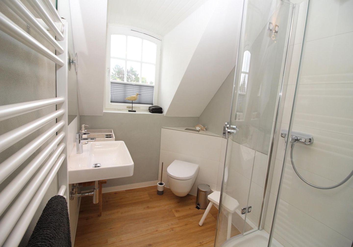 Vom Flur aus gelangen Sie in das helle Duschbad.