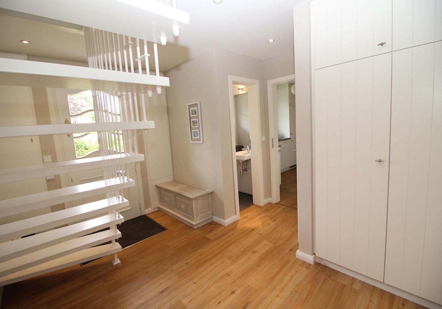 Ein großzügiger Umkleideraum mit großem Einbauschrank, Spiegel und kleinem Schreibtisch