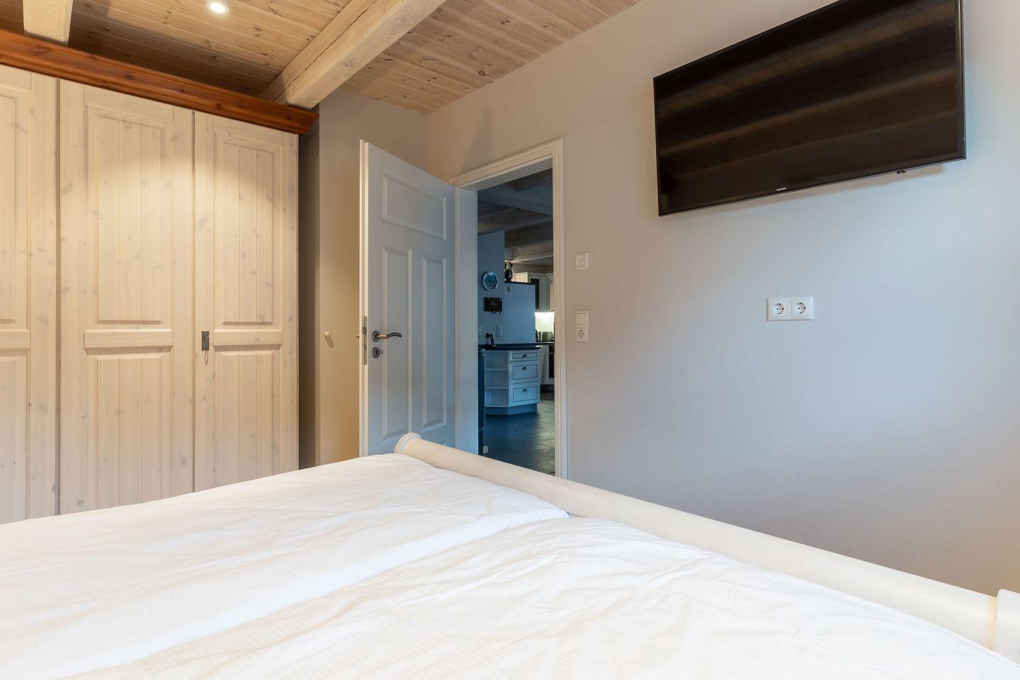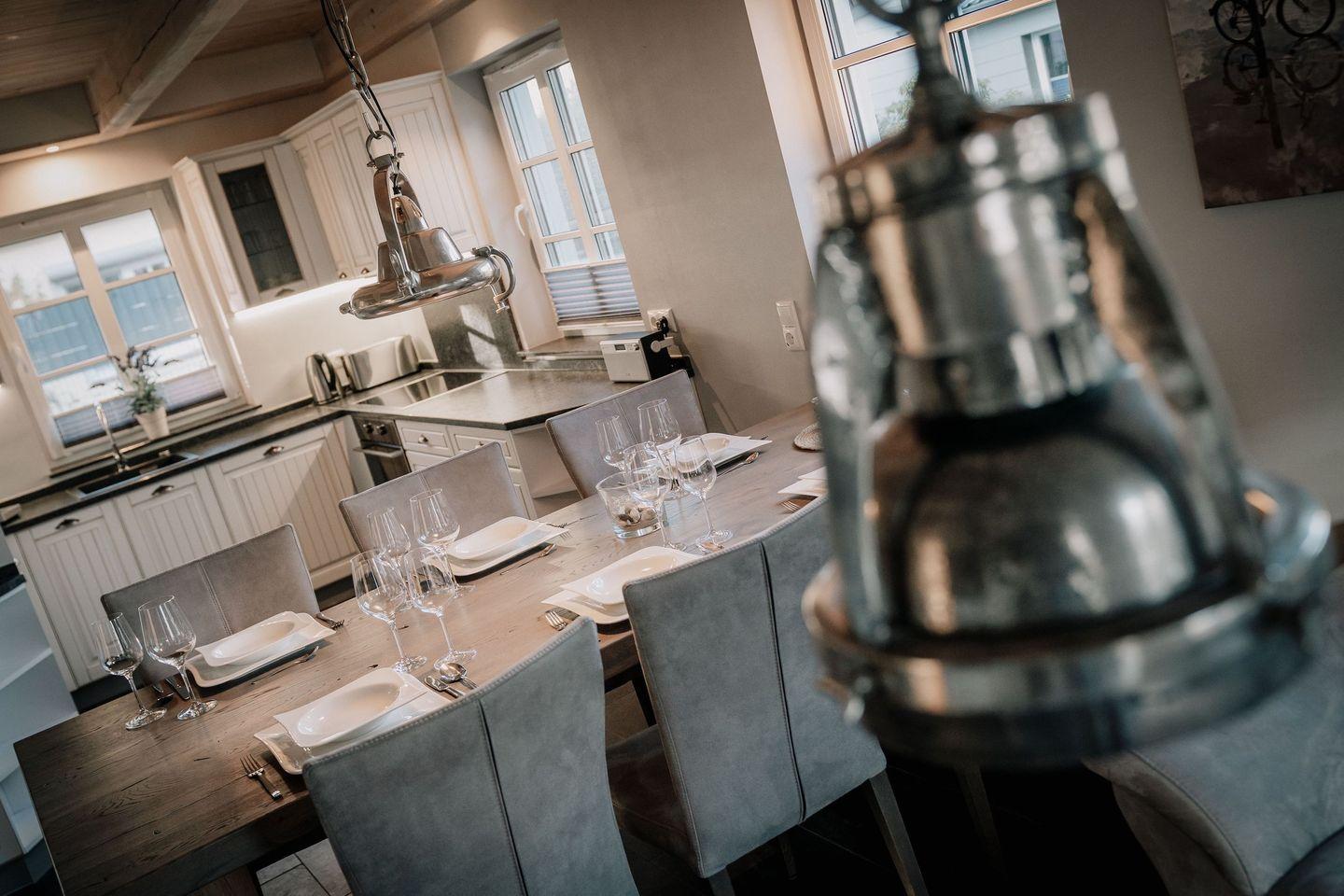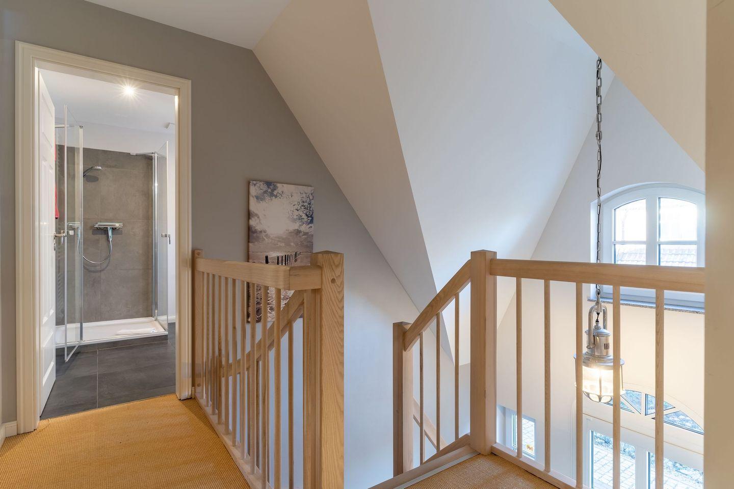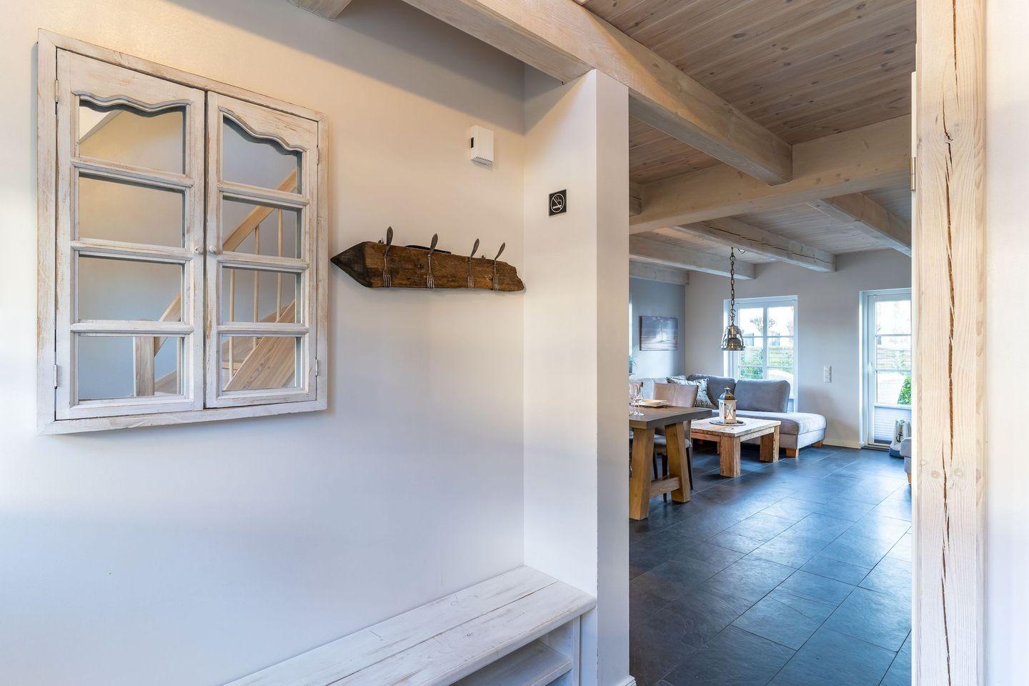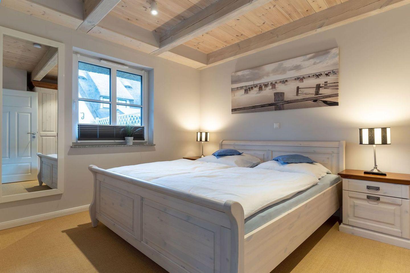 Die wunderschöne Haushälfte unter Reet verfügt über ca. 130 m² und bietet Platz für 1-6 Personen.Im Erdgeschoss befindet sich der lichtdurchflutete Wohnraum mit TV, Kamin, einer offenen Küche sowie einem stilvollen Essbereich.Die Küche ist ausgestattet mit Backofen und Geschirrspüler, sowie einem Esperto-Caffè-Automat, Toaster, Wasserkocher und den üblichen Küchenutensilien.An den Wohnbereich schließen sich ein Flur, ein Duschbad und ein Doppelschlafzimmer an.Das Erdgeschoss ist rollstuhlfreundlich.Über eine Holztreppe gelangt man in das Obergeschoss. Die beiden Schlafzimmer, jeweils mit einem Doppelbett sorgen für ruhevolle Erholung.Im ersten Stock befindet sich ausserdem ein weiteres Duschbad sowie eine Sauna.