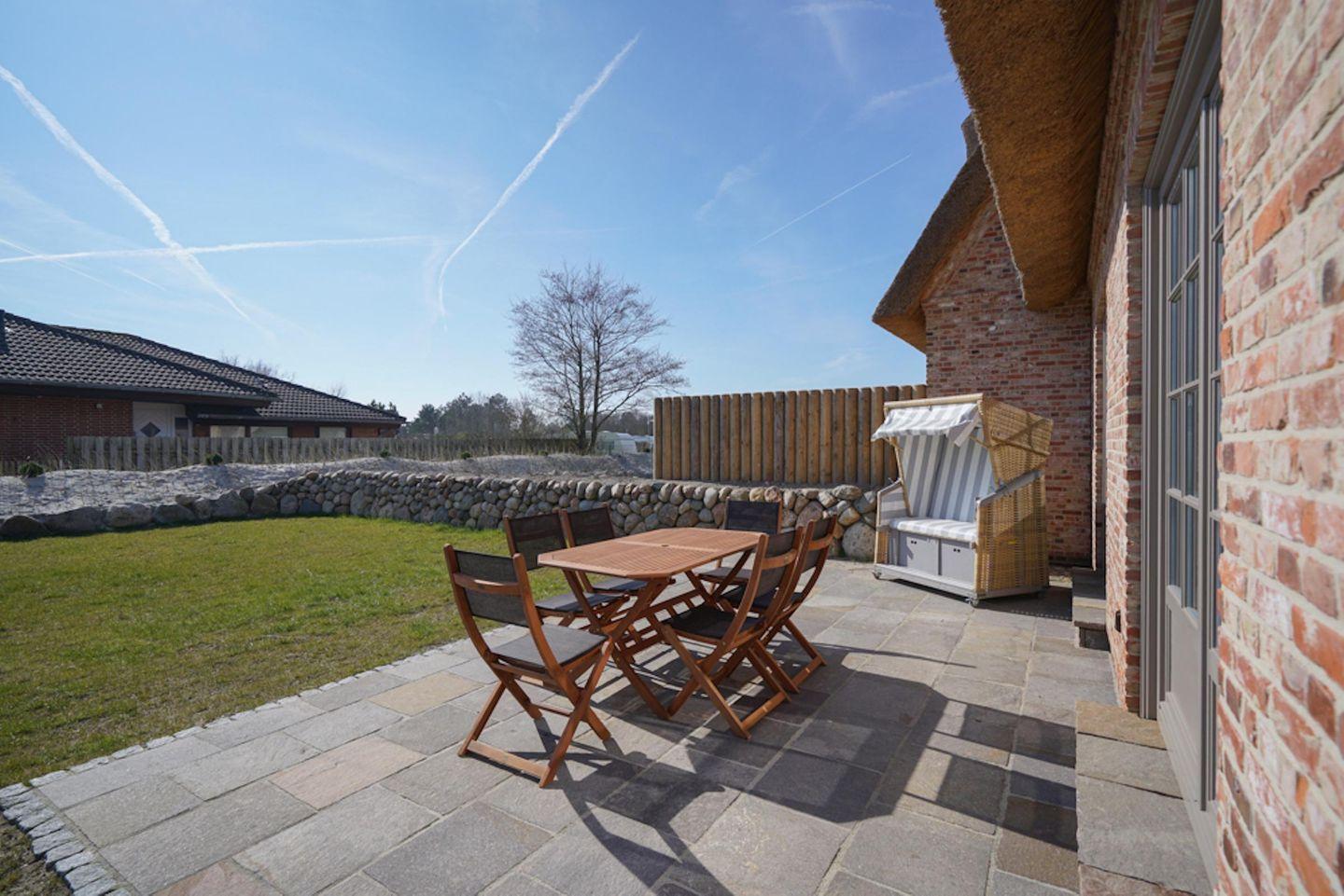 Das Grundstück mit 2 Autostellplätzen, großer Rasenfläche und einer geschützten, sonnigen Süd-West Terrasse ist mit heimischen Pflanzen und einer Düne angelegt.Aus einem Strandkorb können Sie den Blick auf die Düne genießen. Nur wenige Minuten ist bereits der Südstrand.