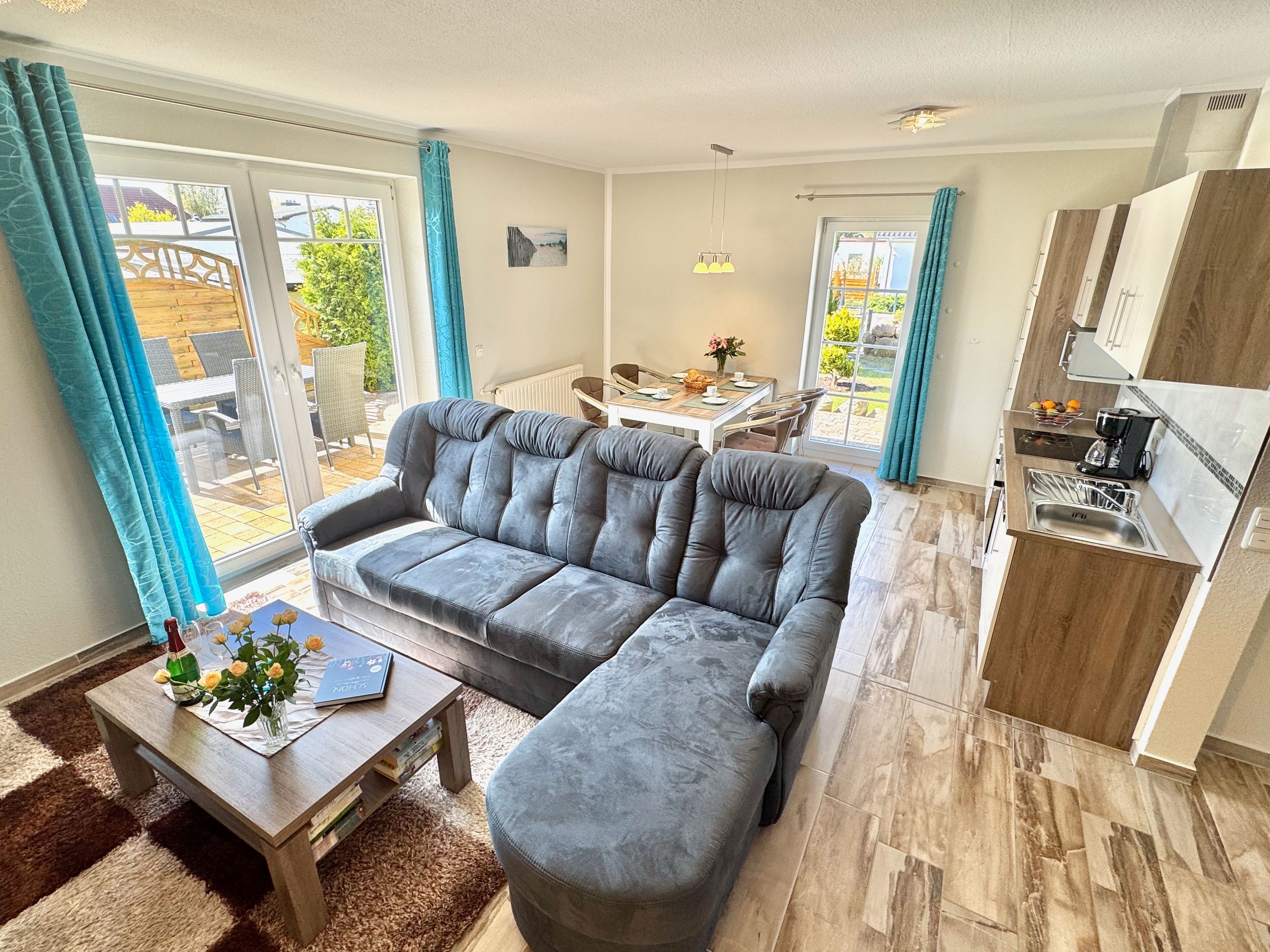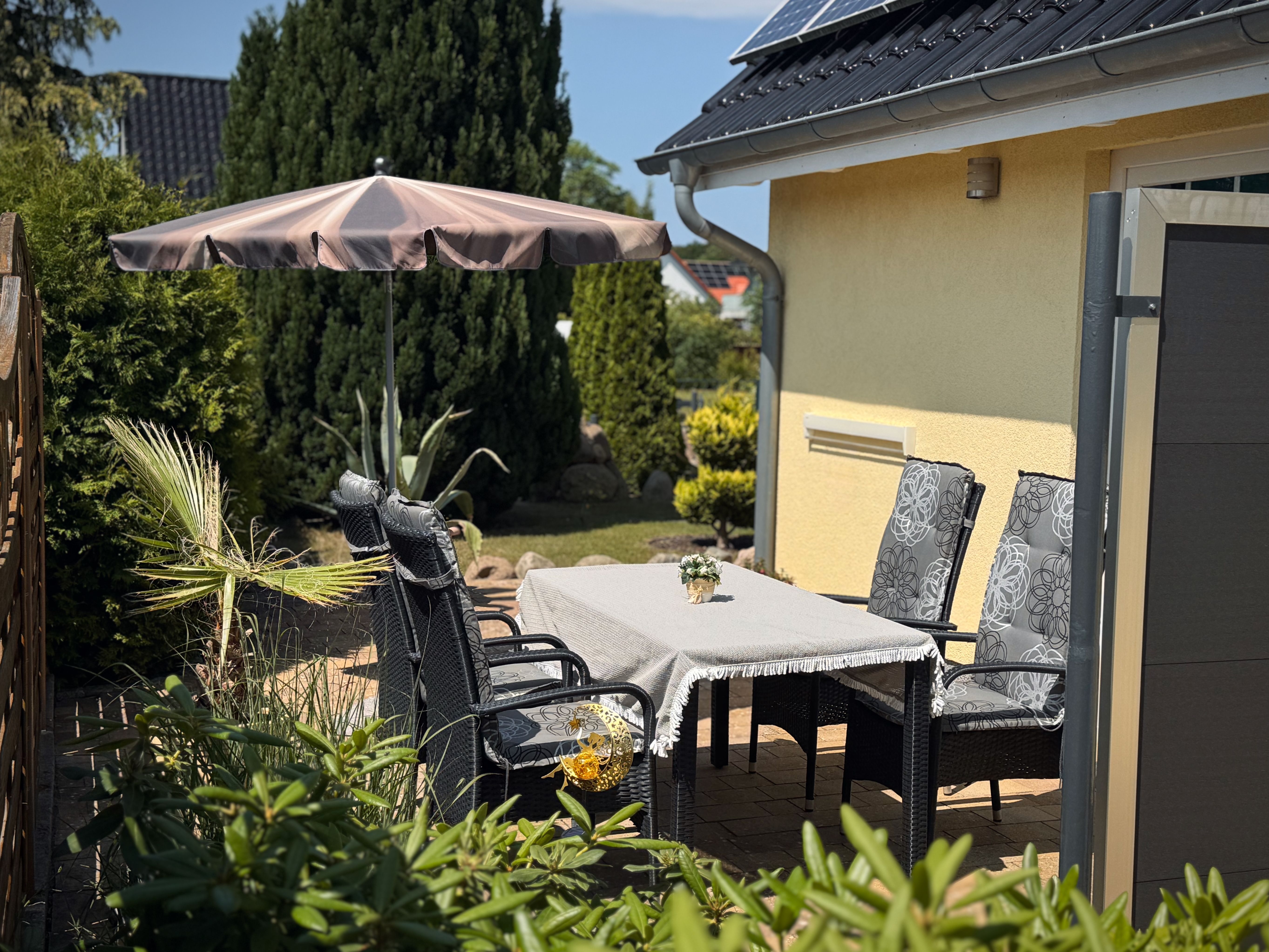 Die Ferienwohnung Malin ist eine 60 m² große, modern ausgestattete Wohnung. Im Obergeschoss befinden sich 1 Schlafzimmer mit Doppelbett (Babybett kostenfrei möglich) und 1 Kinderzimmer mit einem Einzelbett. Im Erdgeschoss befinden sich der Wohn- und Kochbereich sowie das Bad mit Dusche/WC. Das Wohnzimmer ist mit Couchgarnitur, TV u. Radio ausgestattet. Der Kochbereich besteht aus einer Einbauküche mit Geschirrspüler, Backofen, Kühlschrank mit Gefriermöglichkeit, Kaffeemaschine, Wasserkocher, Toaster und Mikrowelle sowie einem Essbereich. Die Terrasse ist mit Sitzmöbeln ausgestattet, im Garten befindet sich eine Sitzecke mit Grillmöglichkeit. Ein PKW-Stellplatz und Unterstellmöglichkeit für Fahrräder sind auf dem Grundstück vorhanden. Bettwäsche, Geschirrhandtücher, Nebenkosten, Endreinigung und WLAN sind im Preis inklusive. Handtücher bringen Sie bitte mit. Die Ferienwohnung ist eine Nichtraucherwohnung, Haustiere sind nicht erlaubt.