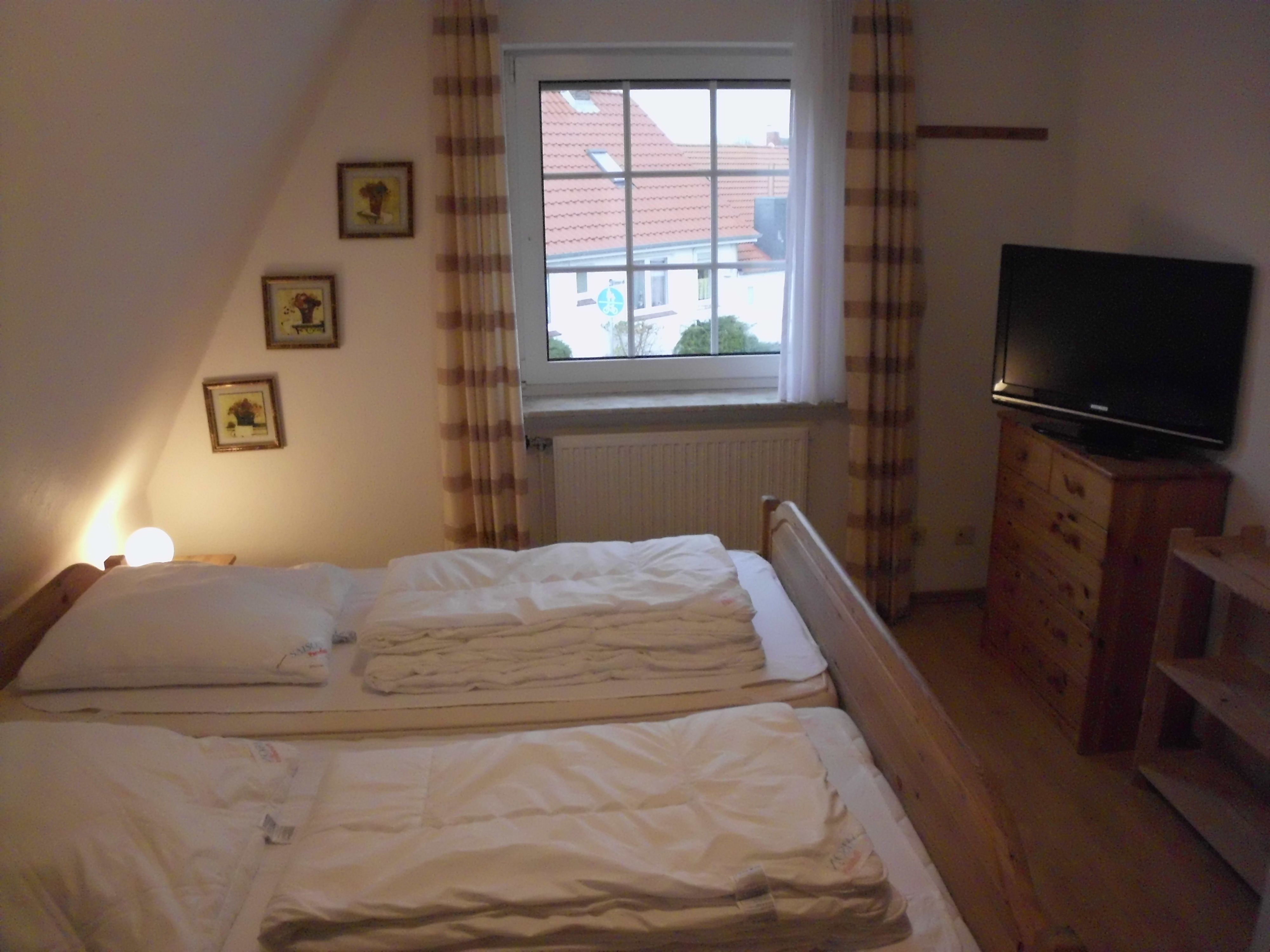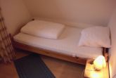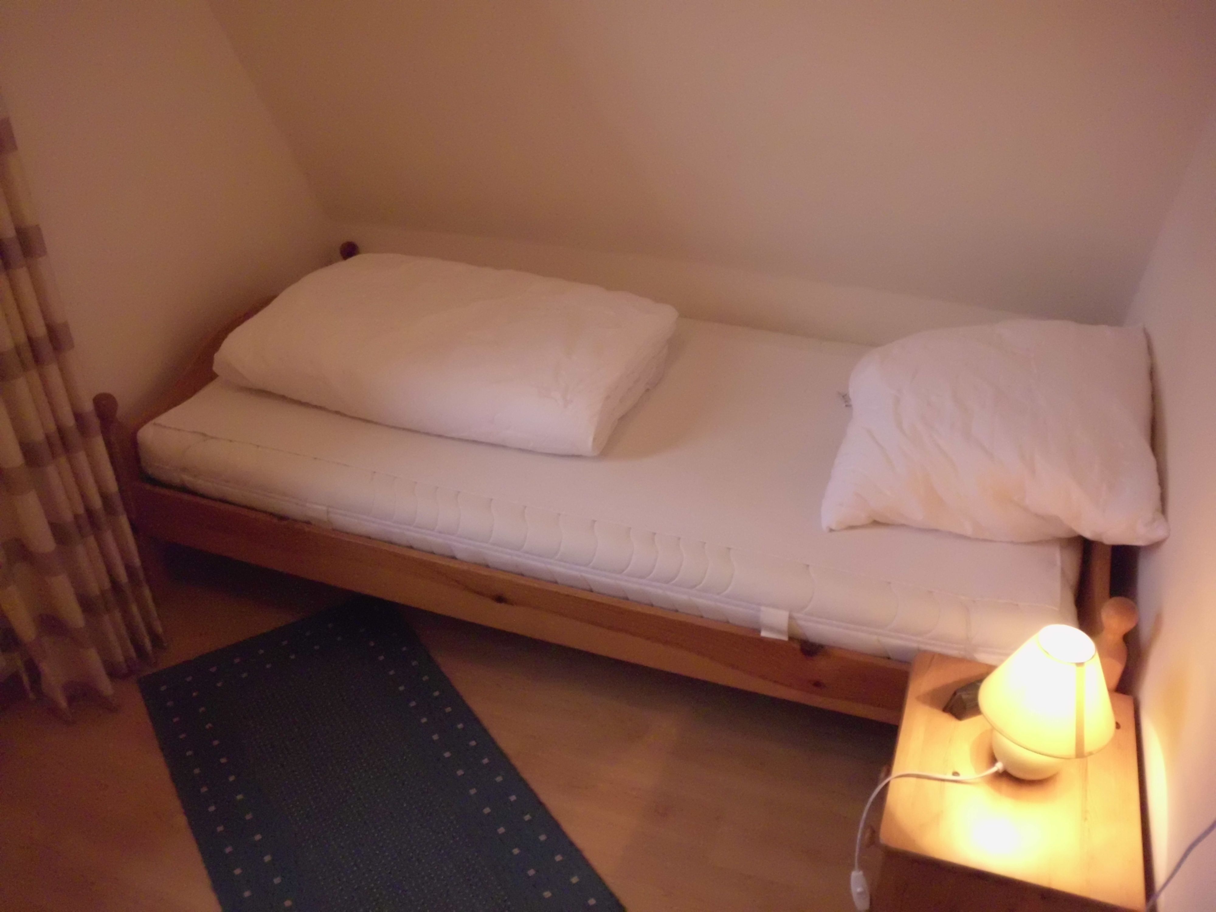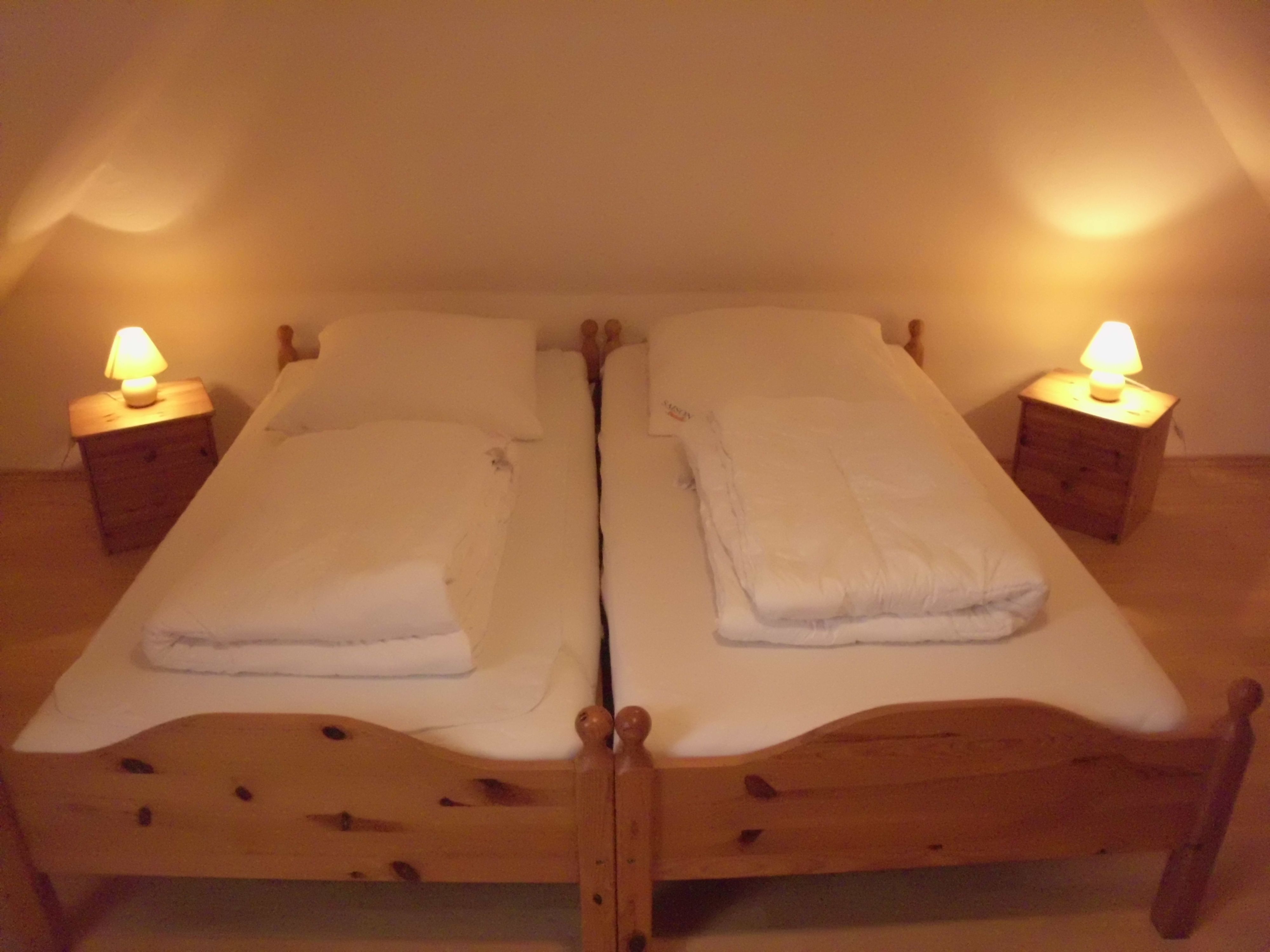 Im 1. Obergeschoss befindet sich das Badezimmer mit Dusche, WC und Waschmaschine. Auch finden Sie hier zwei Schlafzimmer, zum einen mit Doppelbett und Flachbild-TV und einen Schlafraum mit einem Einzelbett. Über den Flur gelangen Sie über eine steile Raumspartreppe in den offenen Schlafraum im Dachgeschoss, dort finden Sie zwei Einzelbetten und einen weiteren Flachbild-TV. Zum Haus gehört eine Garage, das Gartengrundstück ist vollständig eingezäunt und somit für kleine Kinder und Hunde (erlaubt 1 Hund, 2ter Hund nur mit Absprache) gut geeignet.