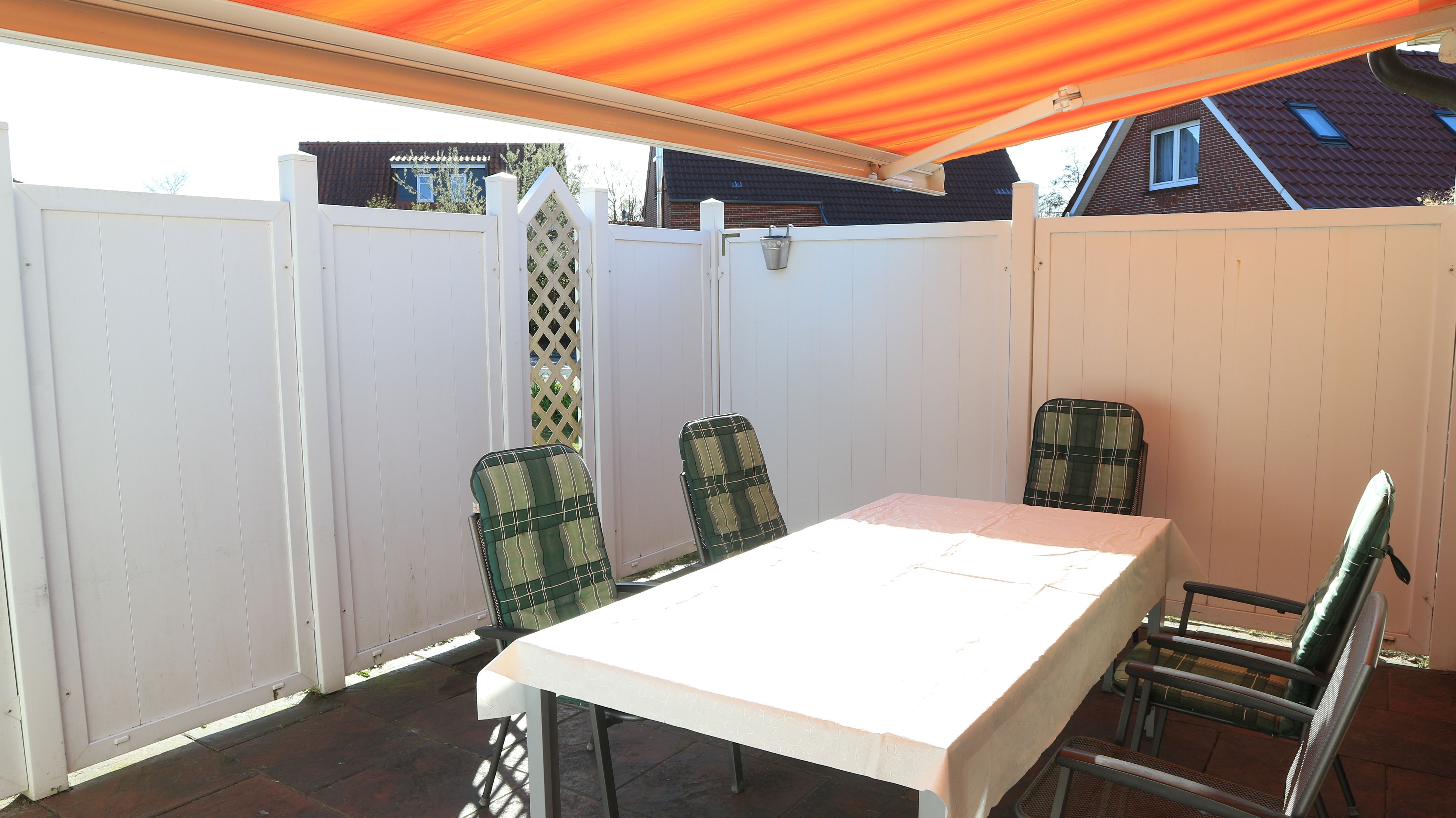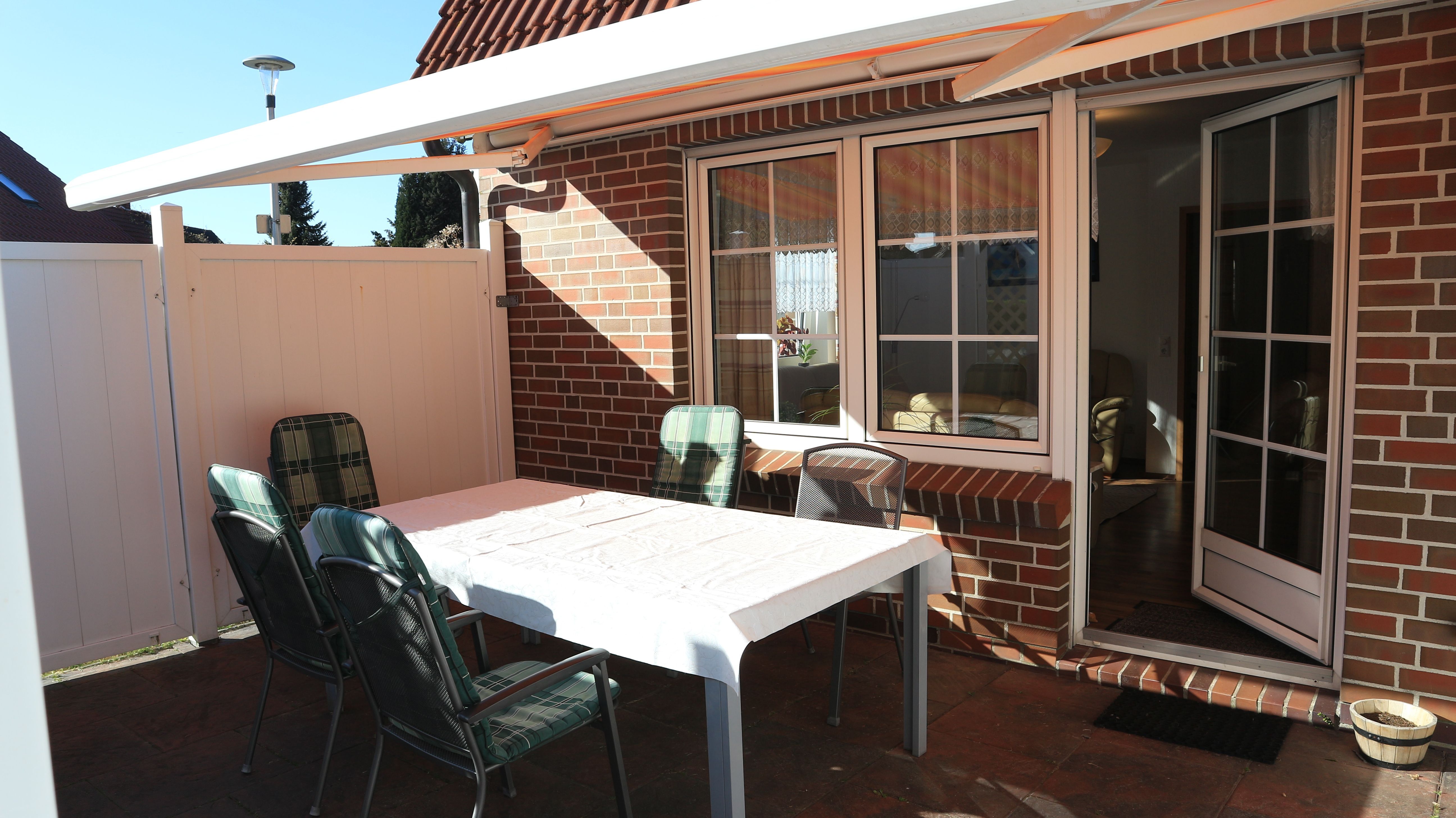 Im Erdgeschoss befindet sich das Wohnzimmer mit Sofagarnitur und Flachbild-TV, die Küche mit Eßplatz, Ceran-Kochfeld, Geschirrspüler, Backofen, Kühlschrank, Mikrowelle, Kaffeemaschine, Toaster sowie ausreichend Koch- und Eßgeschirr. Auch befindet sich ein Gäste-WC im Erdgeschoss. Über das Wohnzimmer gelangen Sie auf die vollständig sichtgeschützte und mit Gartenmöbeln, Sonnenliegen und Markise ausgestattete Terrasse.