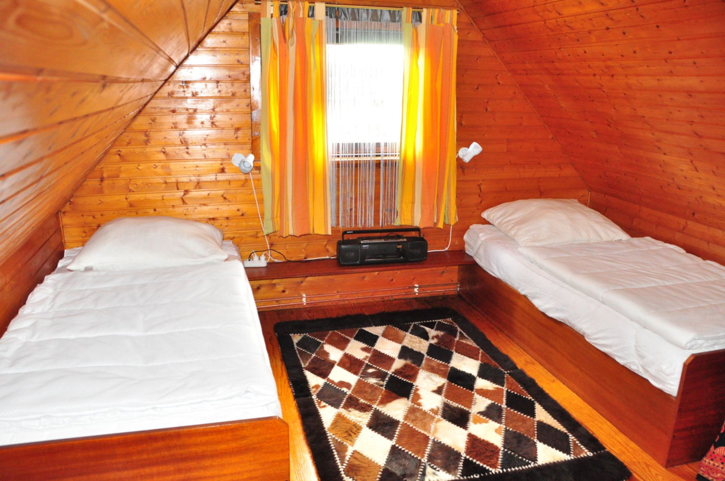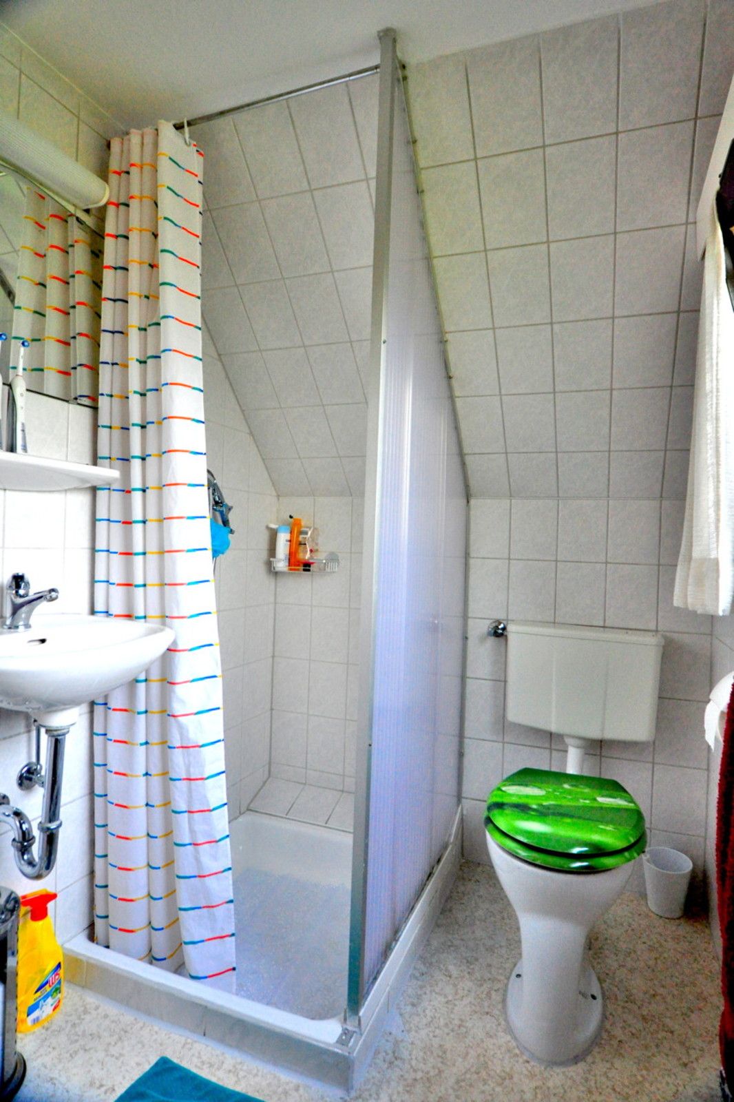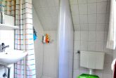 Ins Obergeschoss zu Bad und Schlafzimmer führt eine etwas steilere Treppe. Dort befindet sich das lichtdurchflutete Duschbad mit WC und das urige Piratenschlafzimmer.