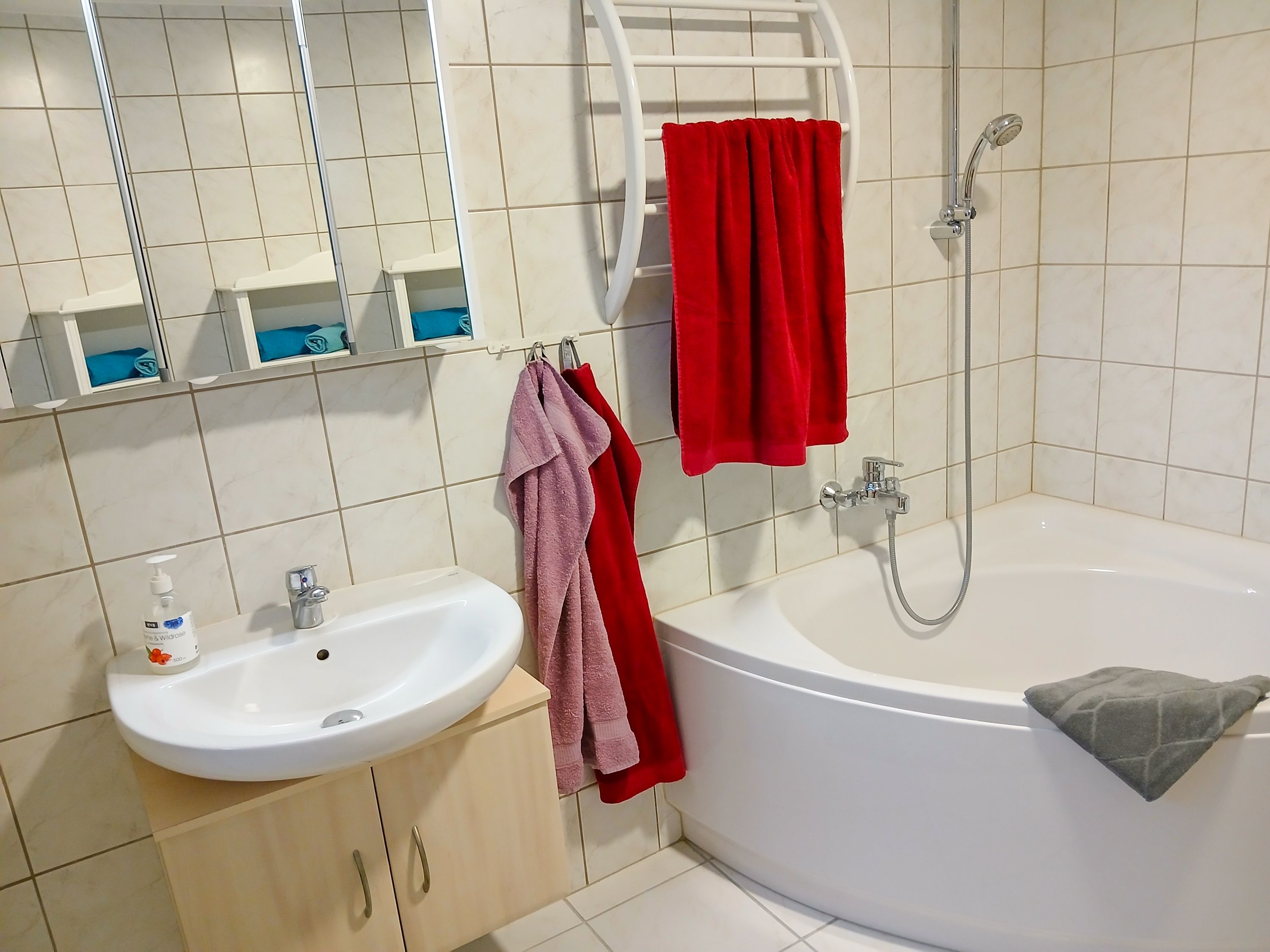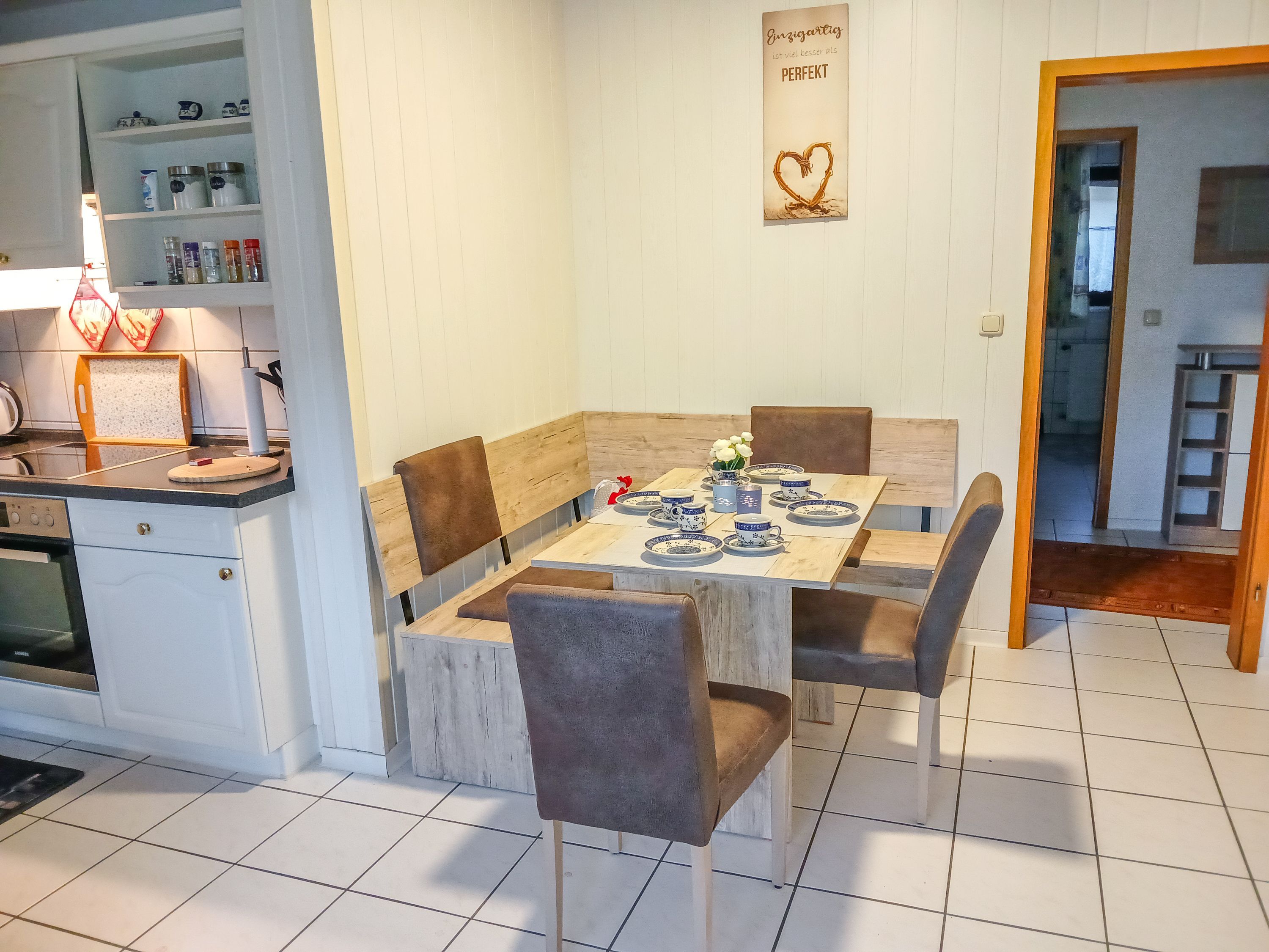 Die separate, voll ausgestattete Küche ist der perfekte Ort für eure kulinarischen Abenteuer. Hier findet ihr einen Herd mit Backofen, eine Kaffeemaschine, einen Kühlschrank, eine Spülmaschine, einen Wasserkocher und einen Toaster. Ein gemütlicher Essbereich in der Küche lädt dazu ein, gemeinsam zu speisen und den Tag zu planen. Das Bad verfügt über eine entspannende Badewanne sowie ein WC ideal, um nach einem ereignisreichen Tag zur Ruhe zu kommen.