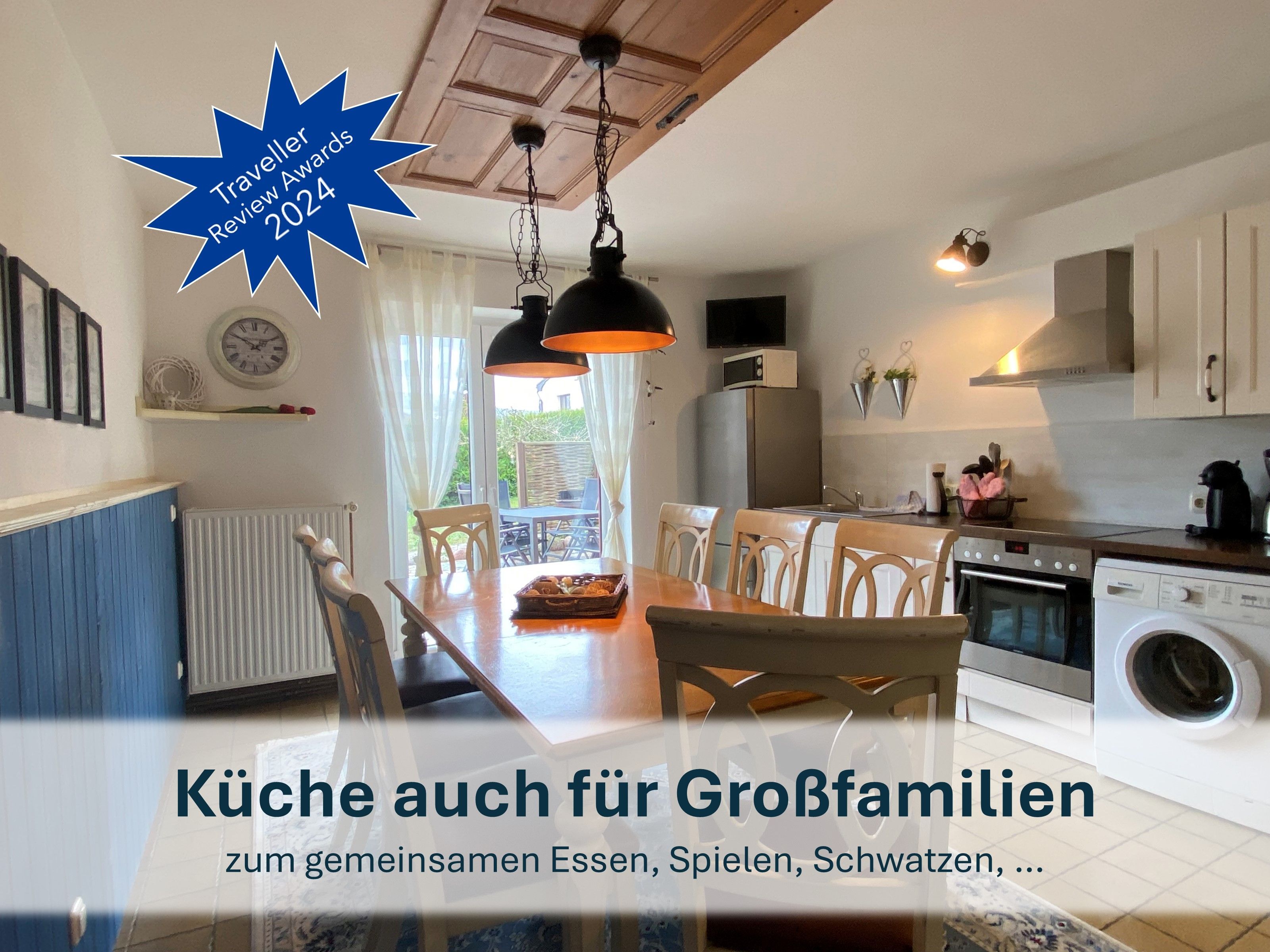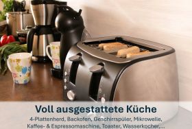 - Voll ausgestattete Küche mit Backofen, Kühlschrank mit Gefrierfach, Geschirrspüler, Waschmaschine sowie umfangreichem Geschirr (auch für Kleinkinder).