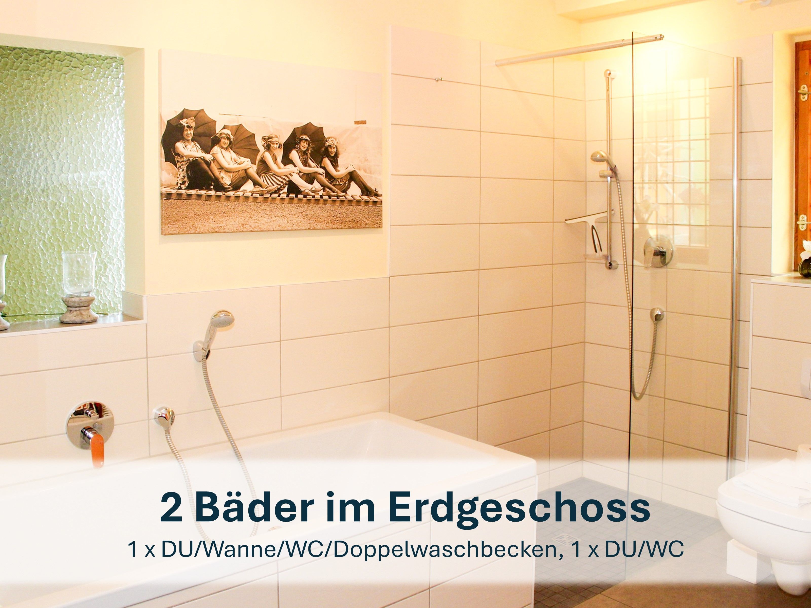 - Großes Badezimmer mit Dusche, Badewanne, WC und Doppelwaschbecken.