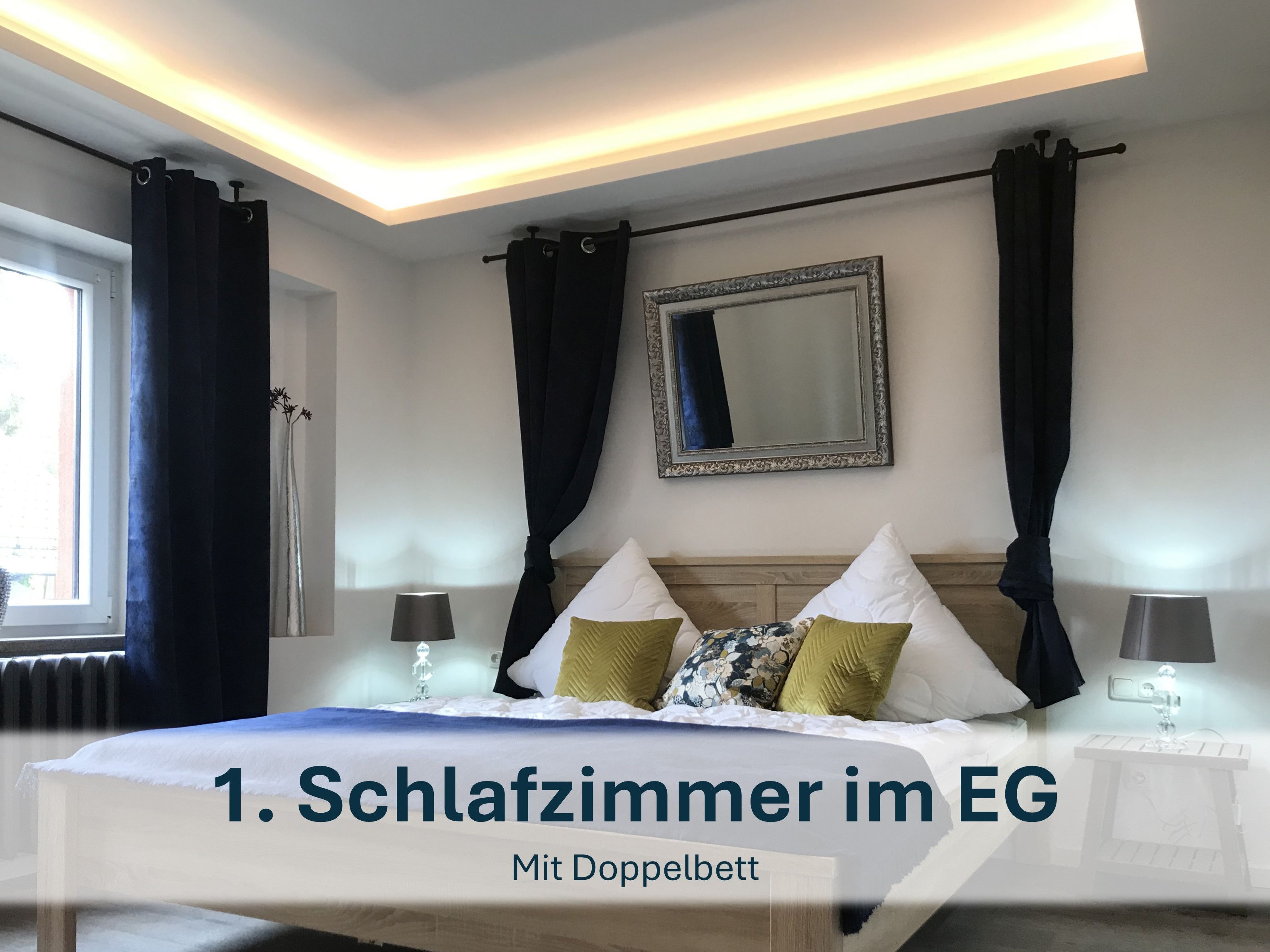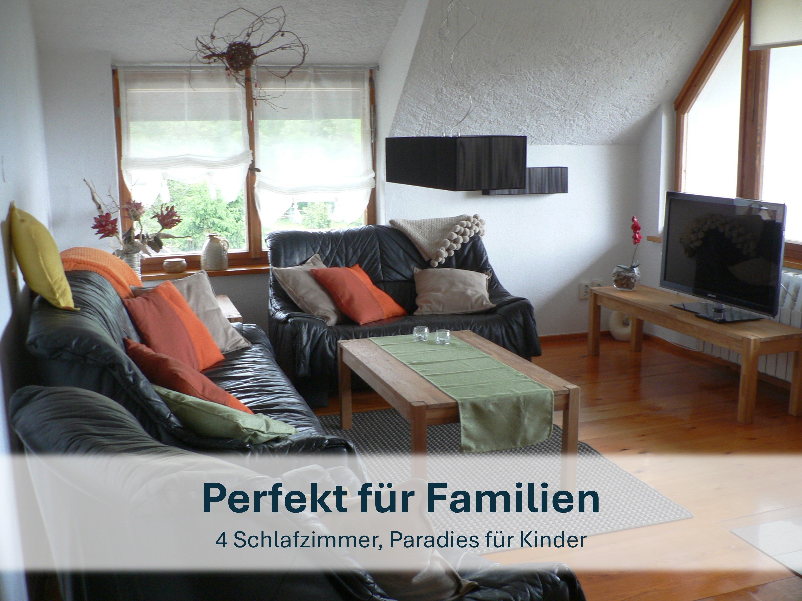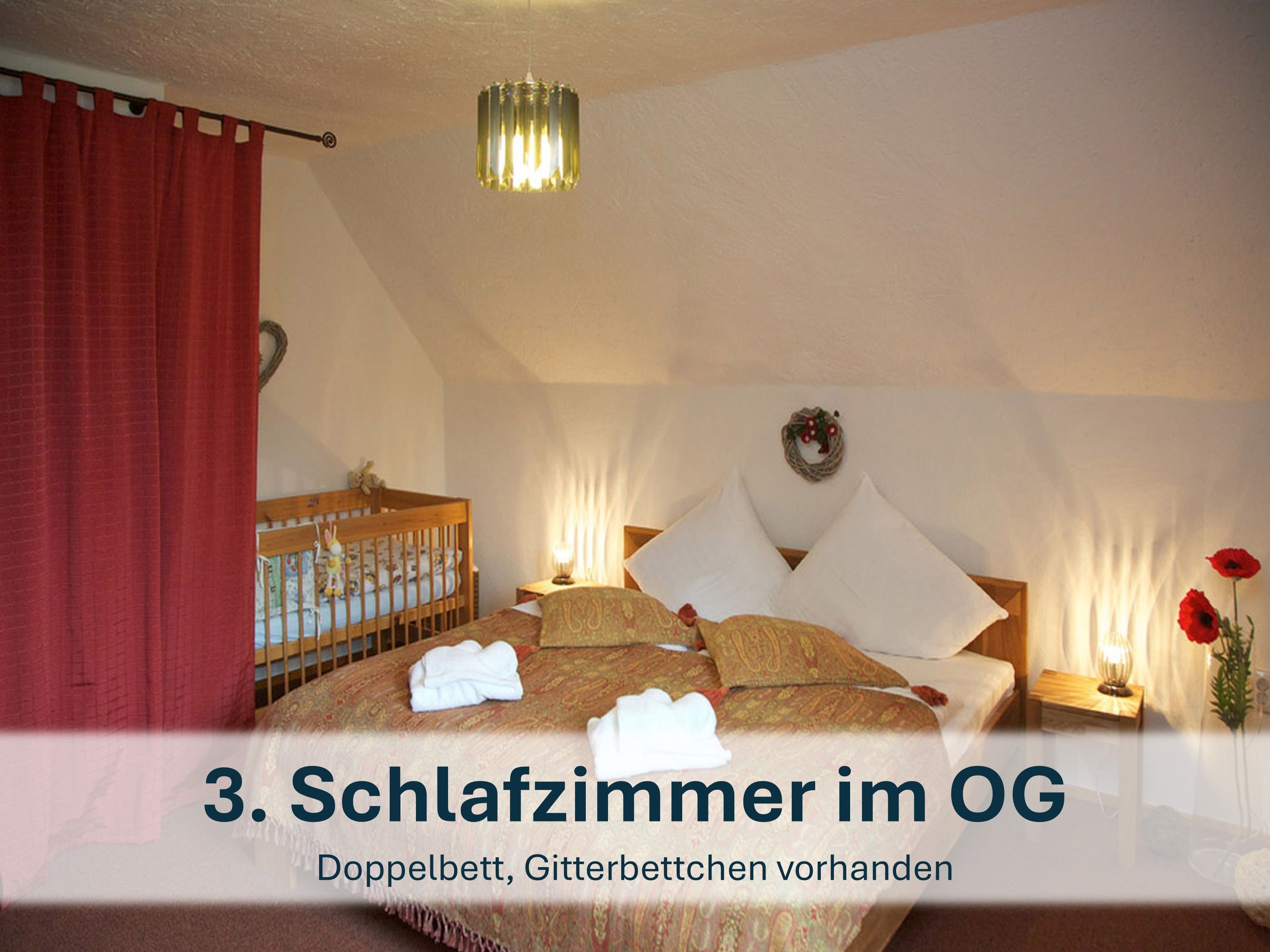- Schlafzimmer mit gemütlichem Doppelbett und Kinderholzbett (inkl. Wickelauflage & Bettwäsche).