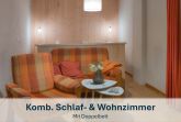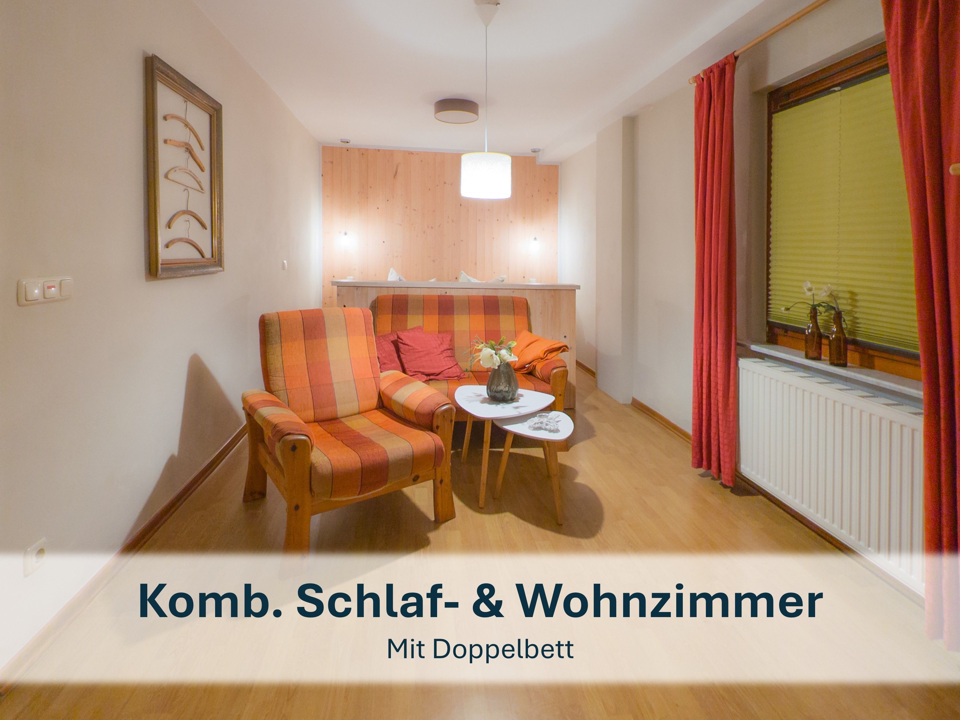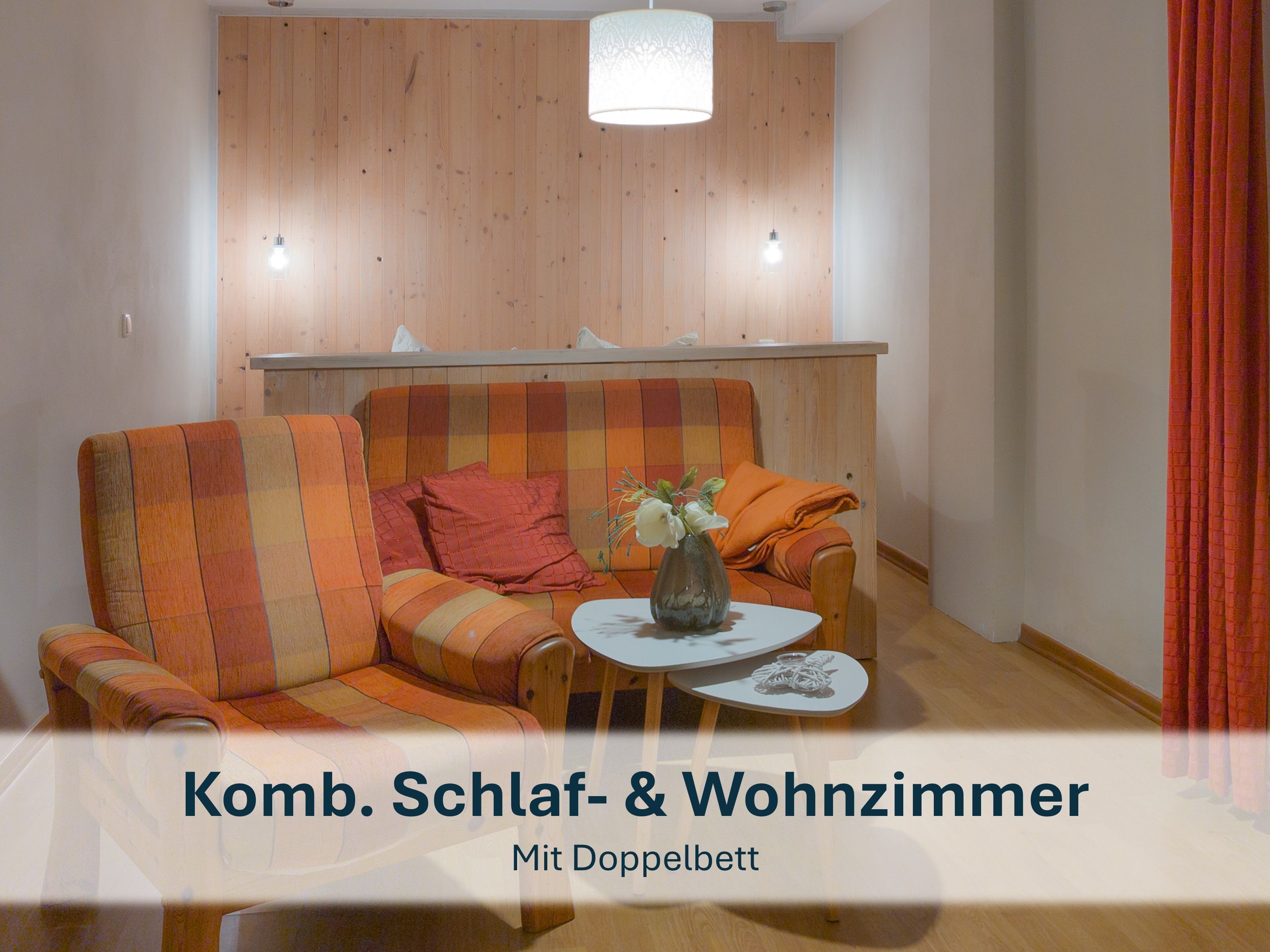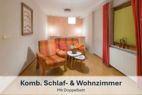 Die moderne 1-Raum-Wohnung bietet Ihnen eine durchdachte Kombination aus Schlaf-, Wohn- und Küchenbereich. Das bequeme Doppelbett, die gemütliche Couchsitzecke mit Flachbild-TV, Radio und kostenfreiem WLAN schaffen beste Voraussetzungen für entspannte Tage und Abende.