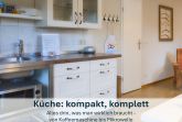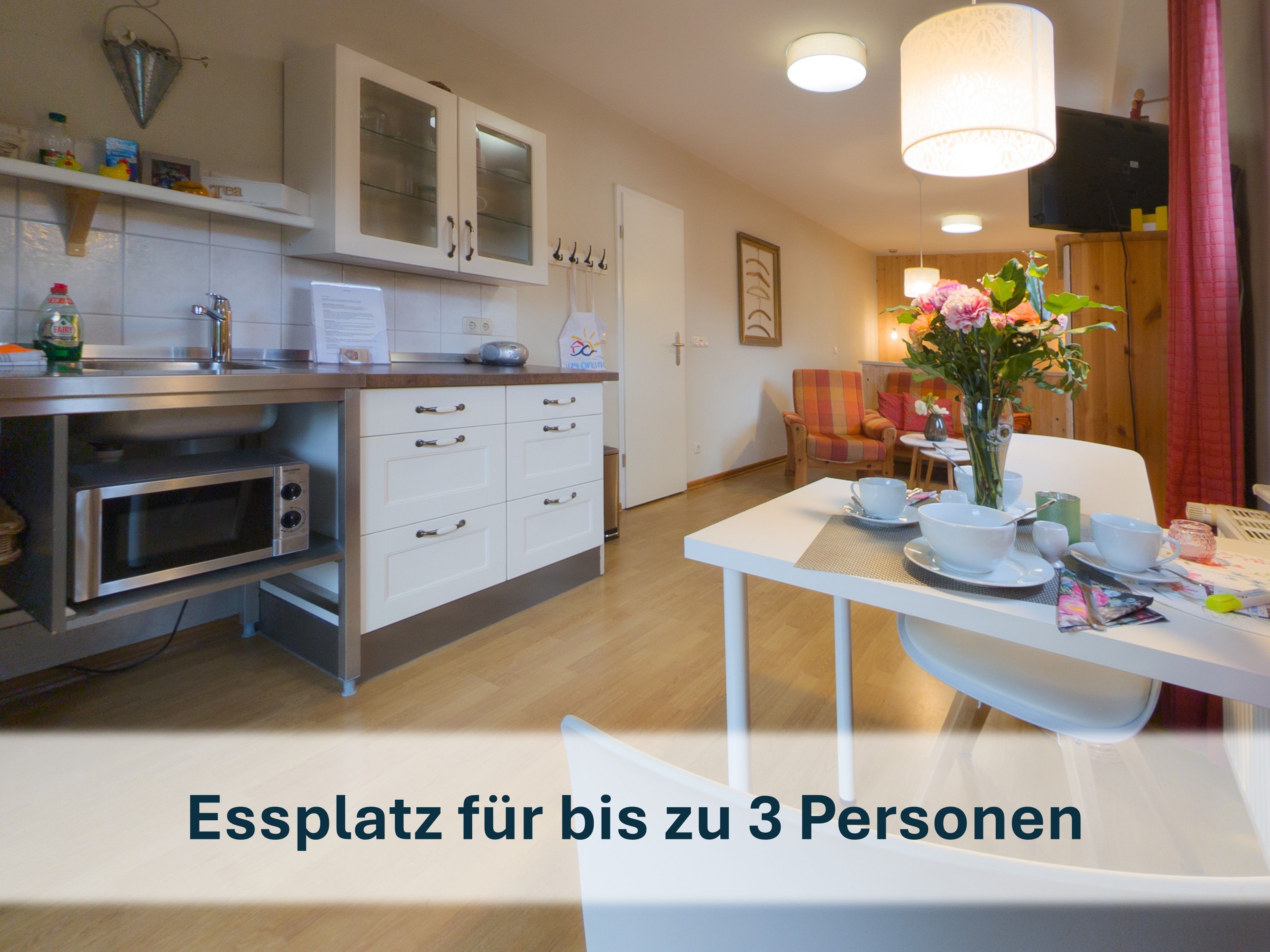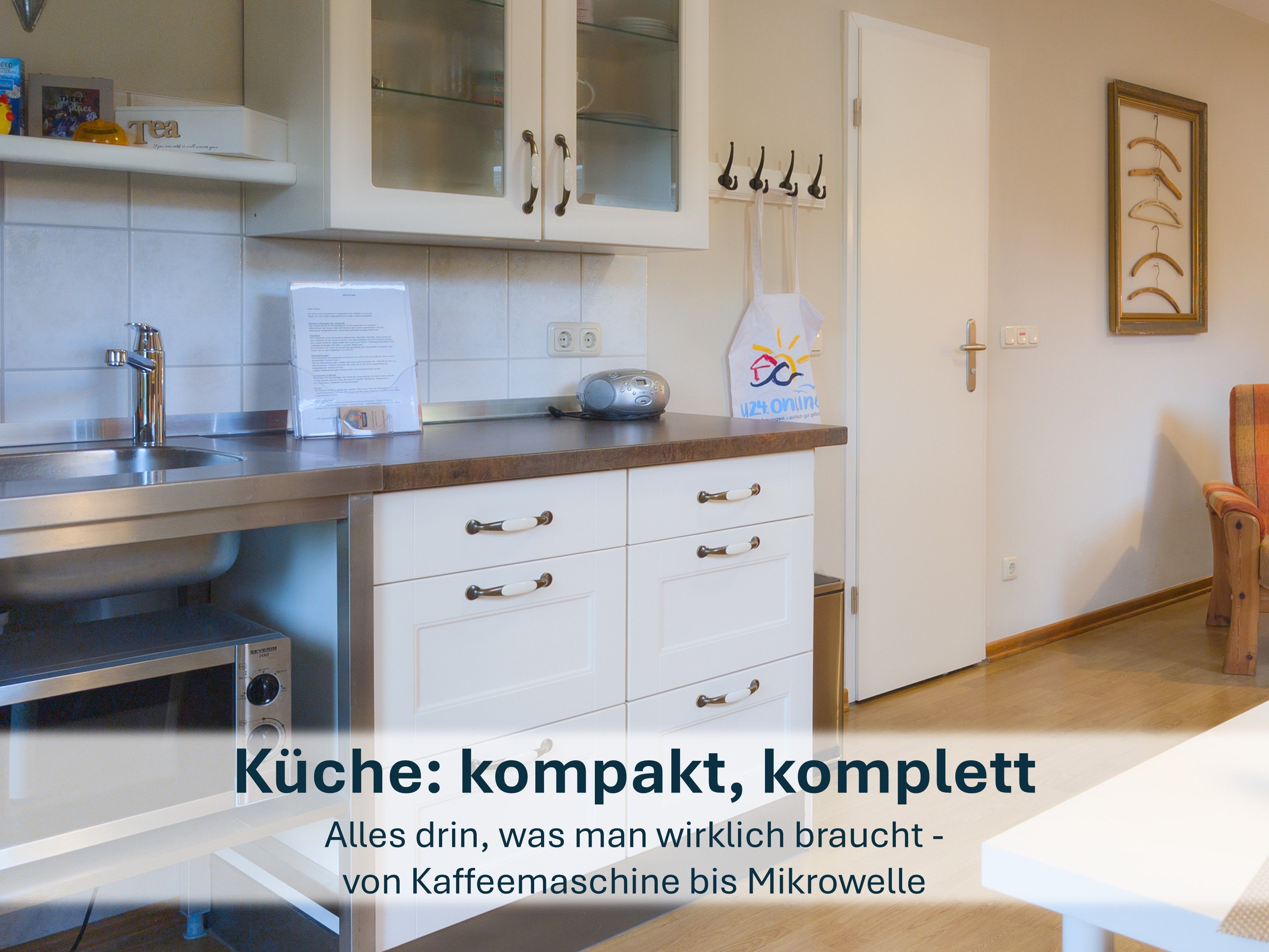 Die Einbauküche verfügt über ein 2-Platten-Kochfeld, Kühlschrank mit Gefrierfach, Kaffeemaschine, Wasserkocher und Toaster. In der angrenzenden Essecke genießen Sie Ihre Mahlzeiten in ruhiger Atmosphäre.