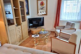Im dazugehörigen Wohnzimmer kann man vor dem Flachbildfernseher entspannen.