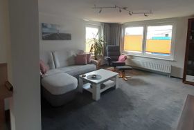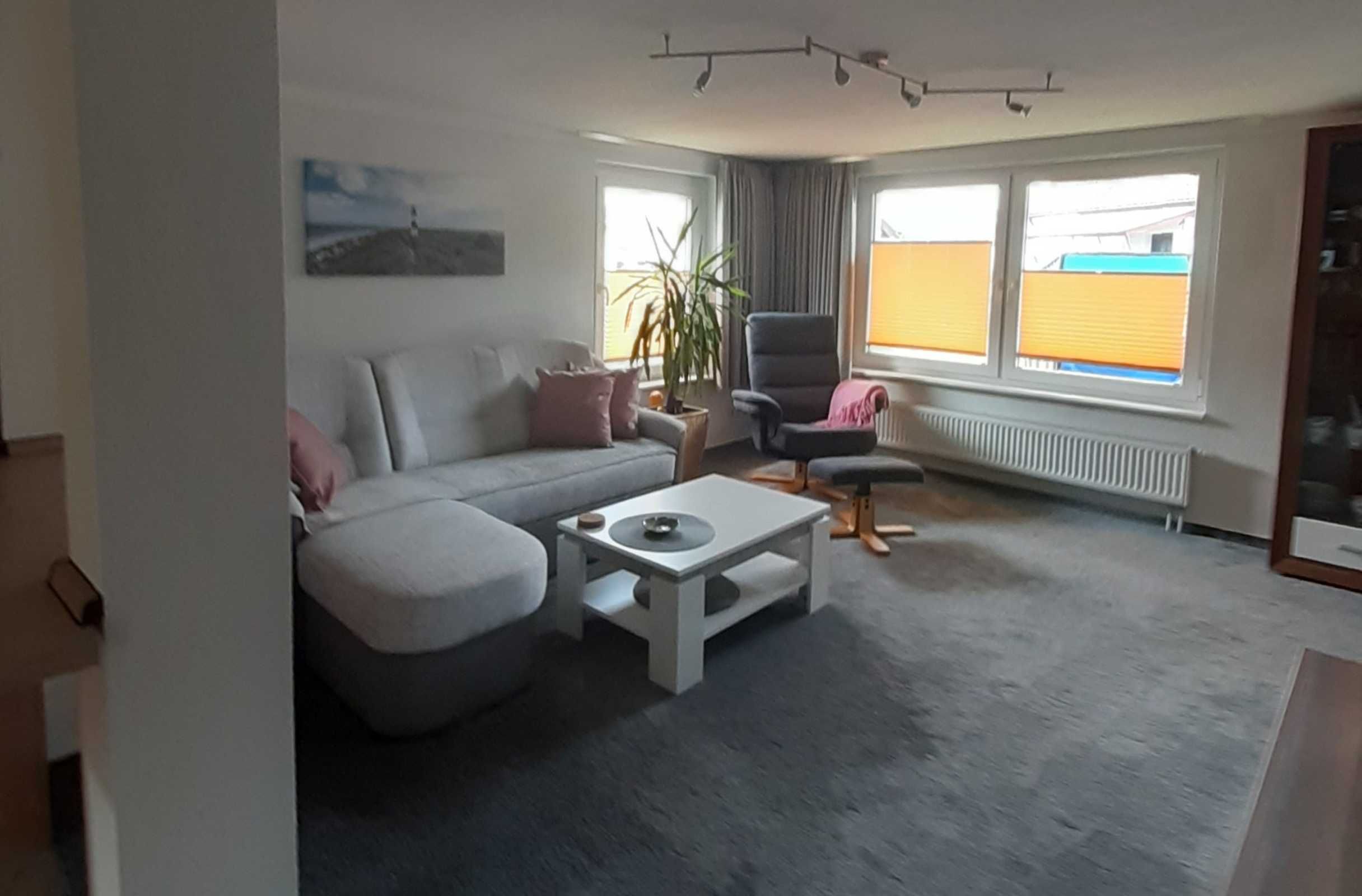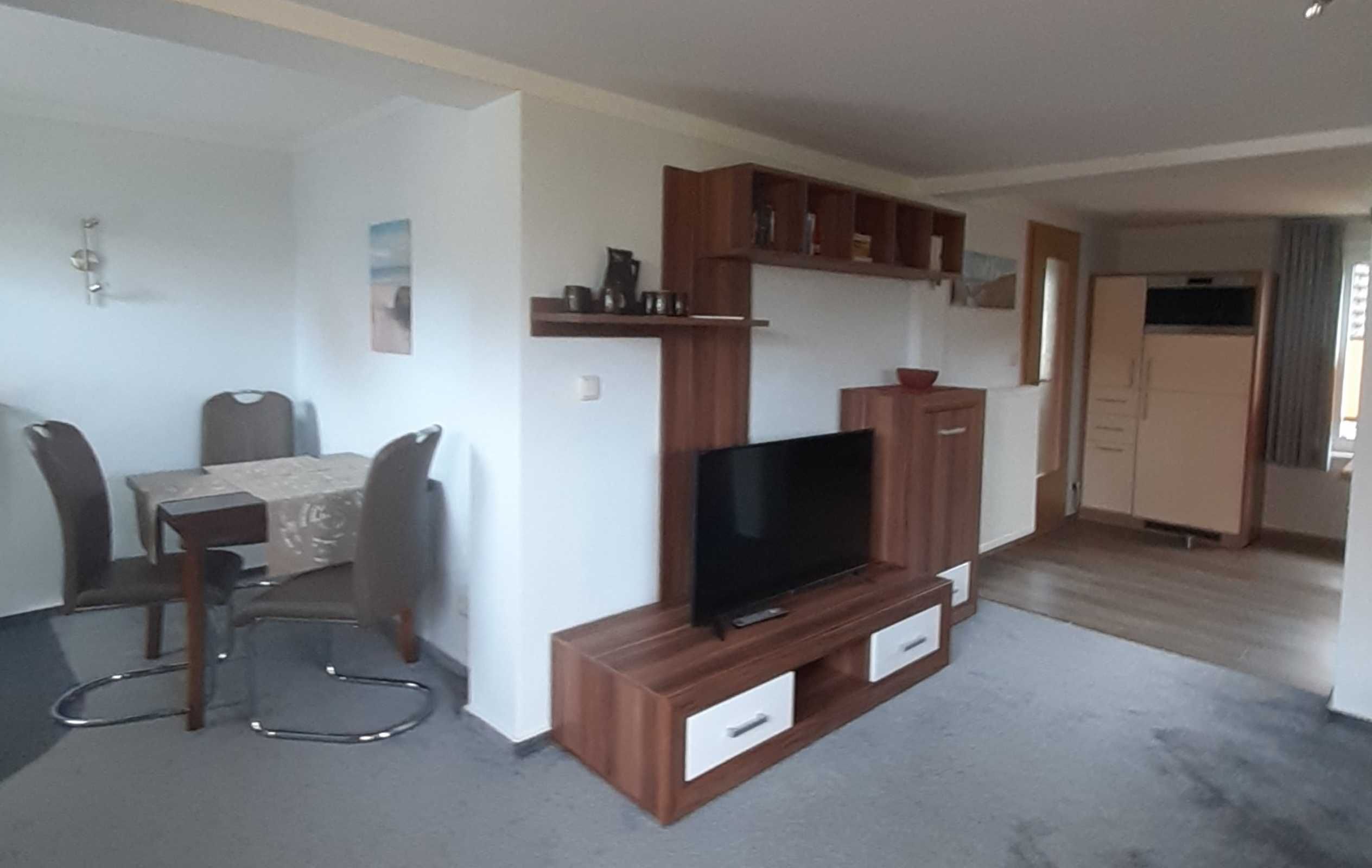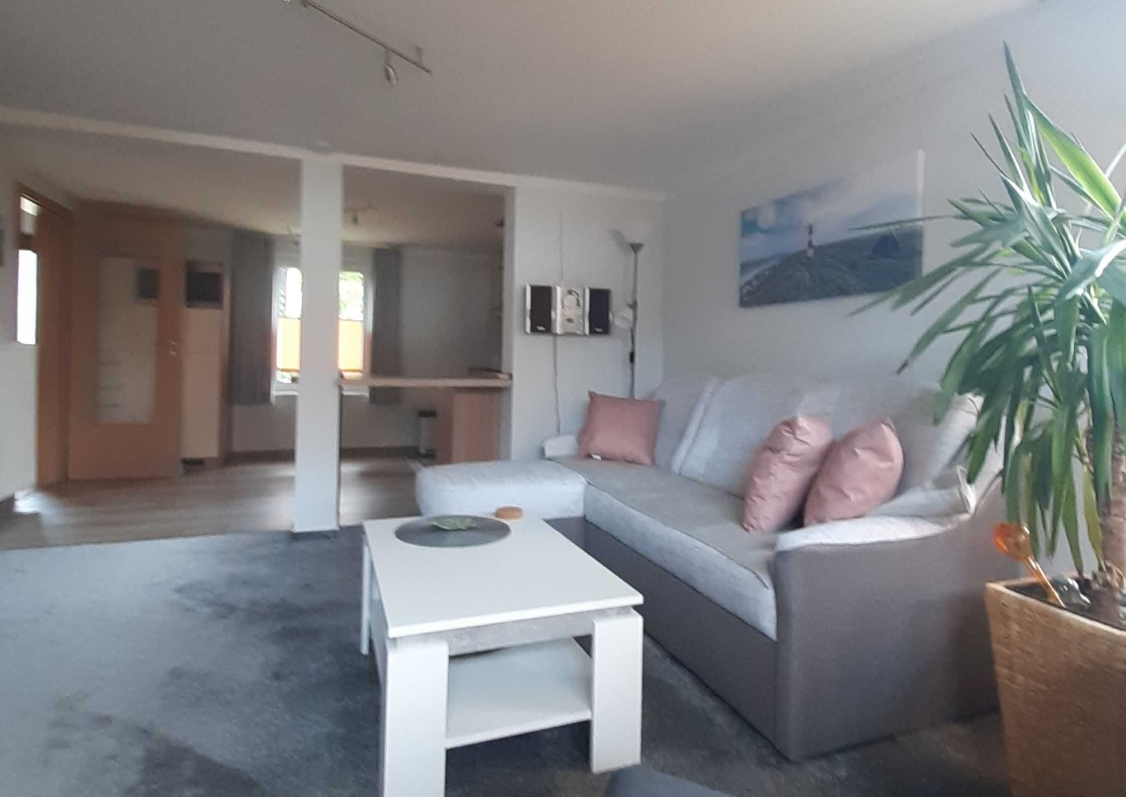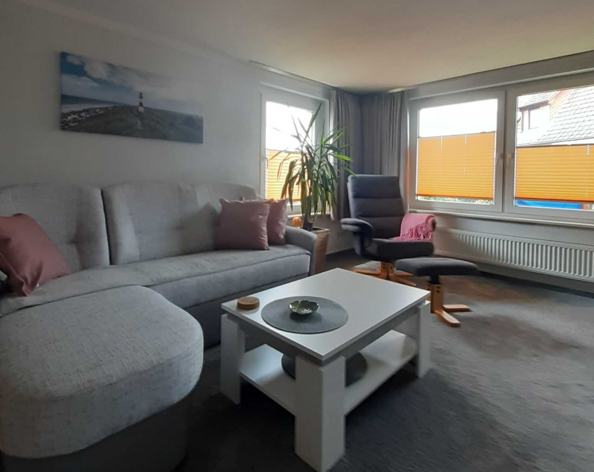Im Erdgeschoss befindet sich der hell und freundlich eingerichtete Wohnbereich mit gemütlicher Couchecke, Couchtisch, Anrichte und Sat-TV.
