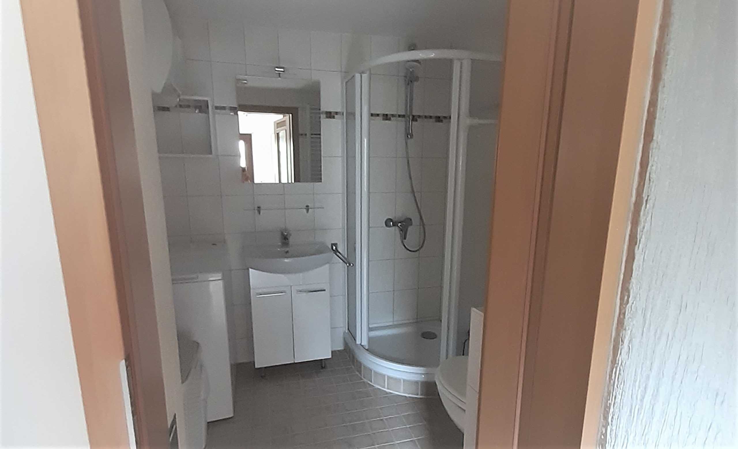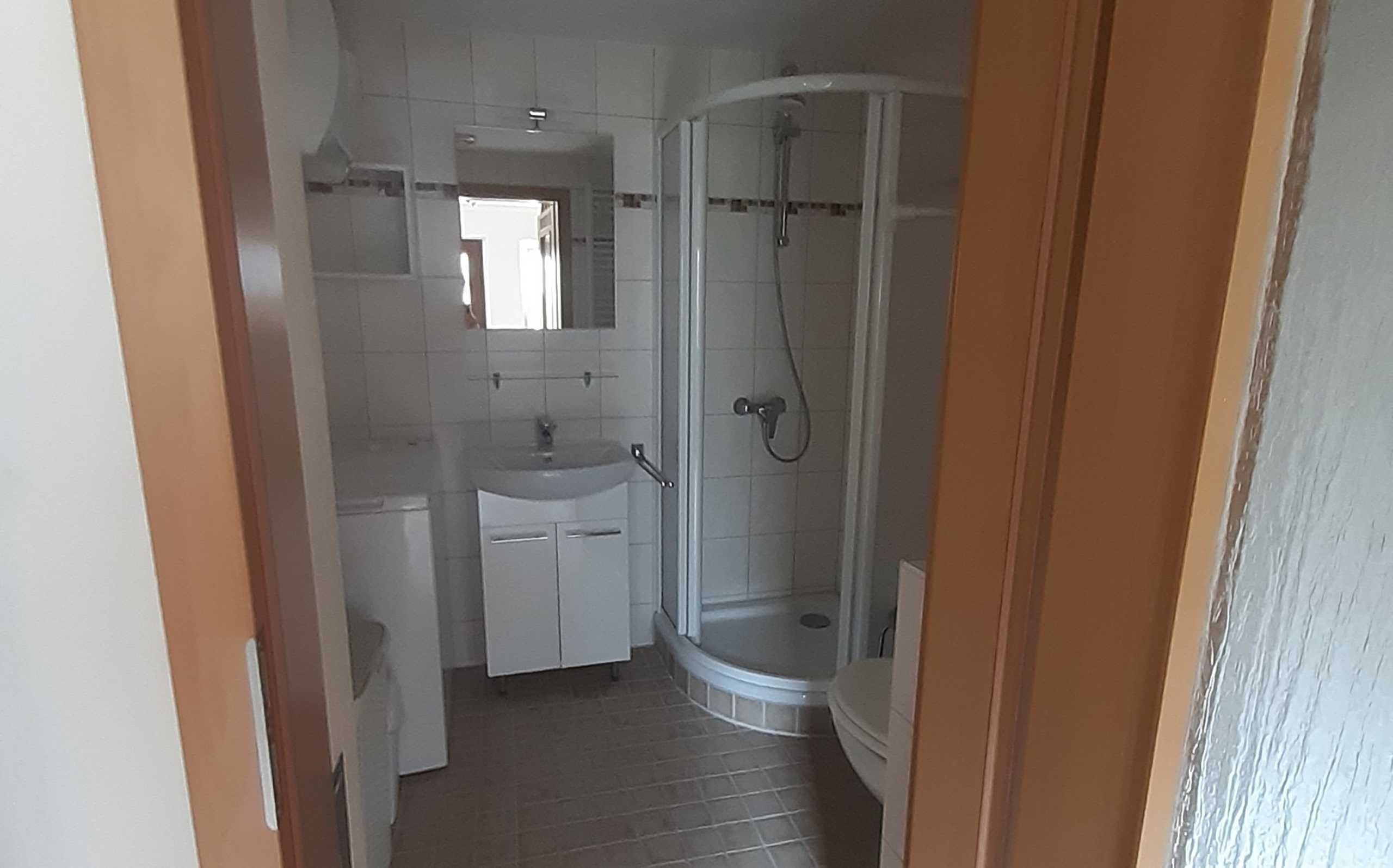 Das Badezimmer ist ausgestattet mit Dusche und WC.