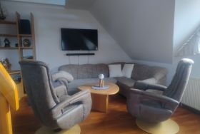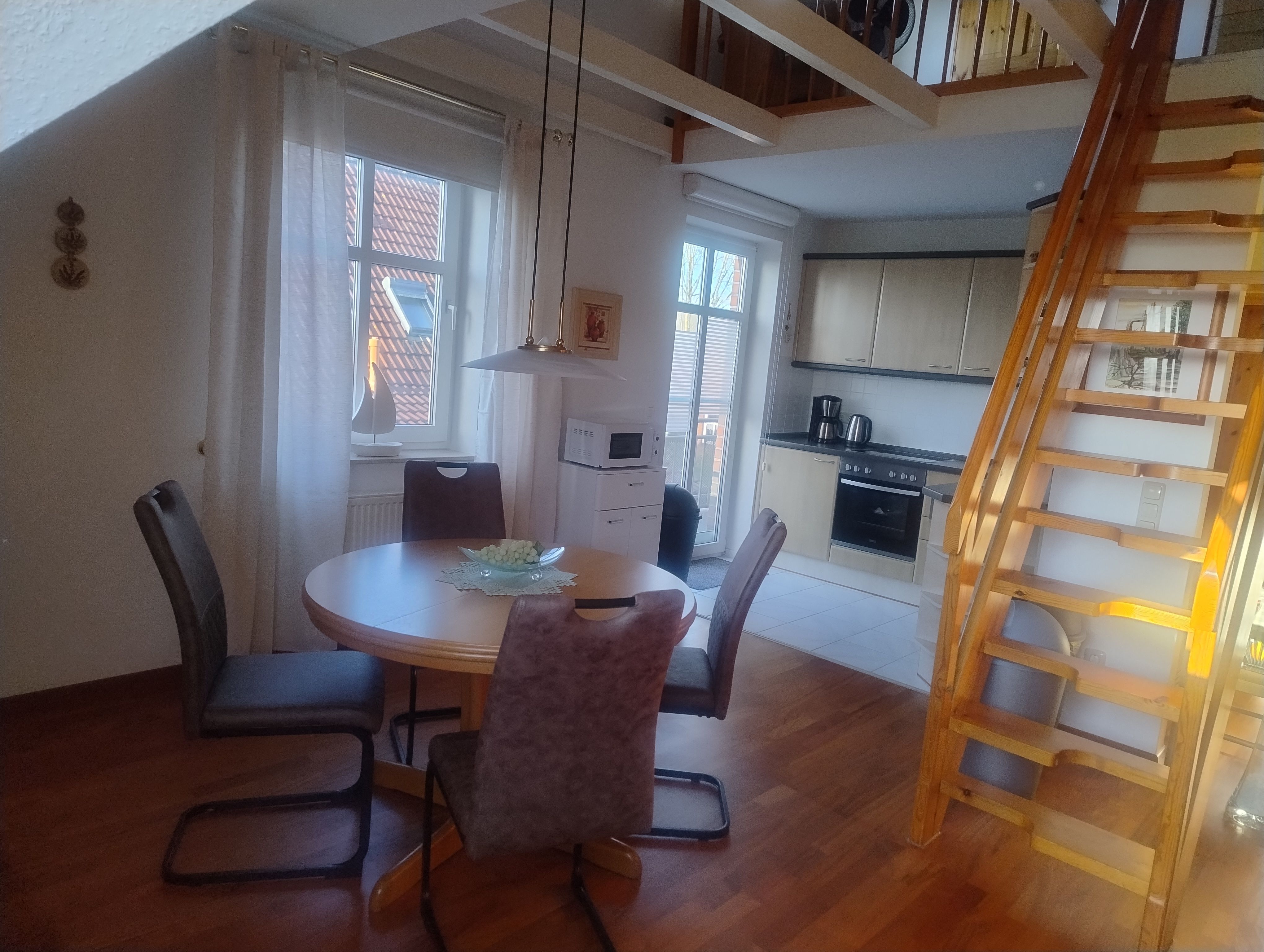 Unsere FeWo bietet eine voll ausgestattete Küche. Entspannen Sie auf dem Balkon oder im gemütlichen Wohnzimmer mit Relaxsesseln, TV und freiem W-Lan. Die Wohnung hat ein Tageslichtbad mit Dusche/WC, im Schlafzimmer befindet sich ein Boxspringbett (2x2m). Oben in der offenen Galerie lädt eine gemütliche Leseecke am Fenster zum Verweilen ein. Sollten Sie beruflich unterwegs sein, ist oben ein Schreibtisch vorhanden.