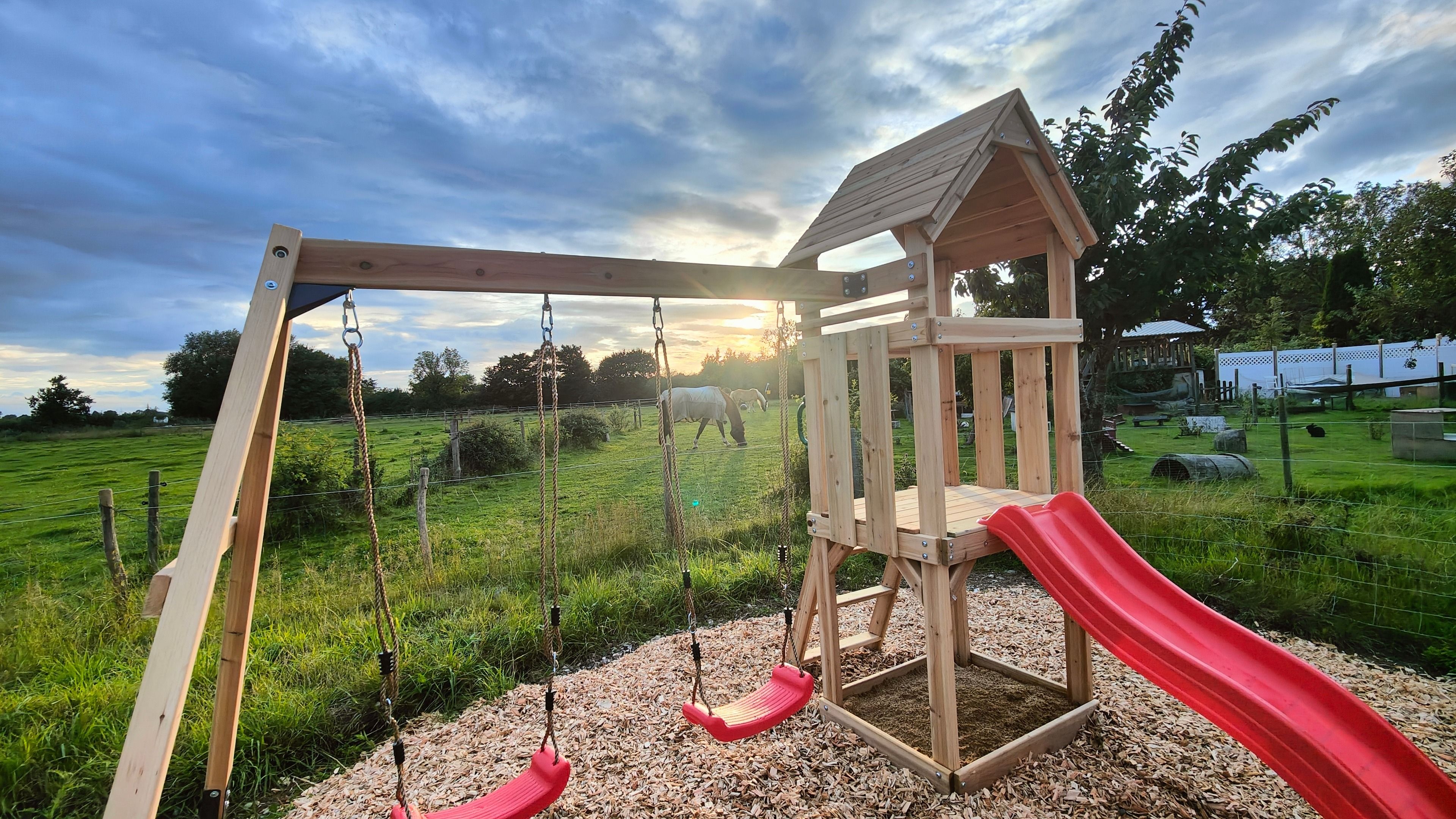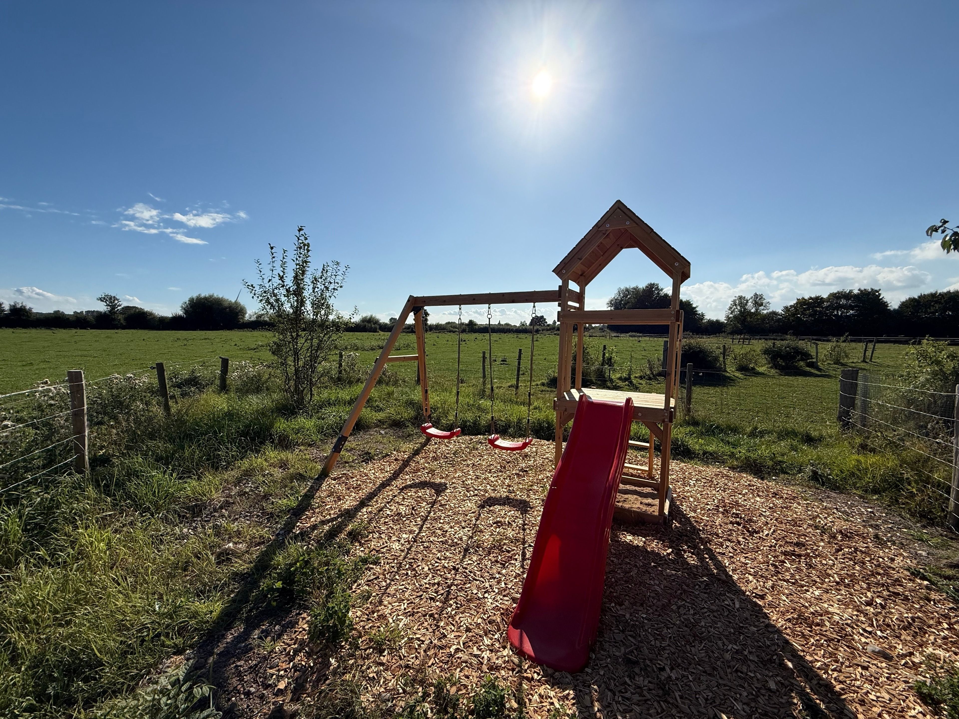 Flur, Essbereich, Duschbad, Badezimmer, Wohn-/Esszimmer mit offener Küche, Sofaecke, TV und Zugang zur Terrasse mit großen Garten und Spieleturm. Schlafzimmer 1 mit Doppelbett (2x90x200), Plissees, Kleiderschrank und Nachttischleuchten. Schlafzimmer 2 mit Etagenbett (90x200) und einem Einzelbett (90x200), Plissees und Nachttischleuchten.