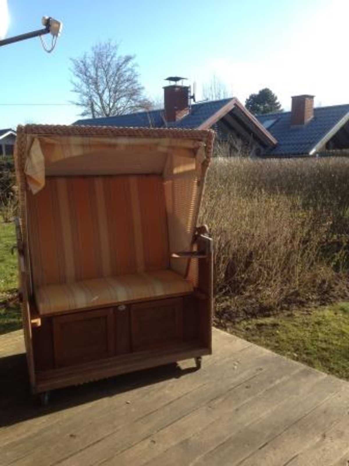 • 1 große Terrasse mit Gartenmöbeln, Strandkorb und Sonnenschirm