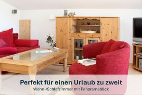 Im Obergeschoss: ein heller Wohn-/Schlafbereich mit gemütlichem Doppelbett, Couch und traumhaftem Ausblick.