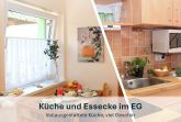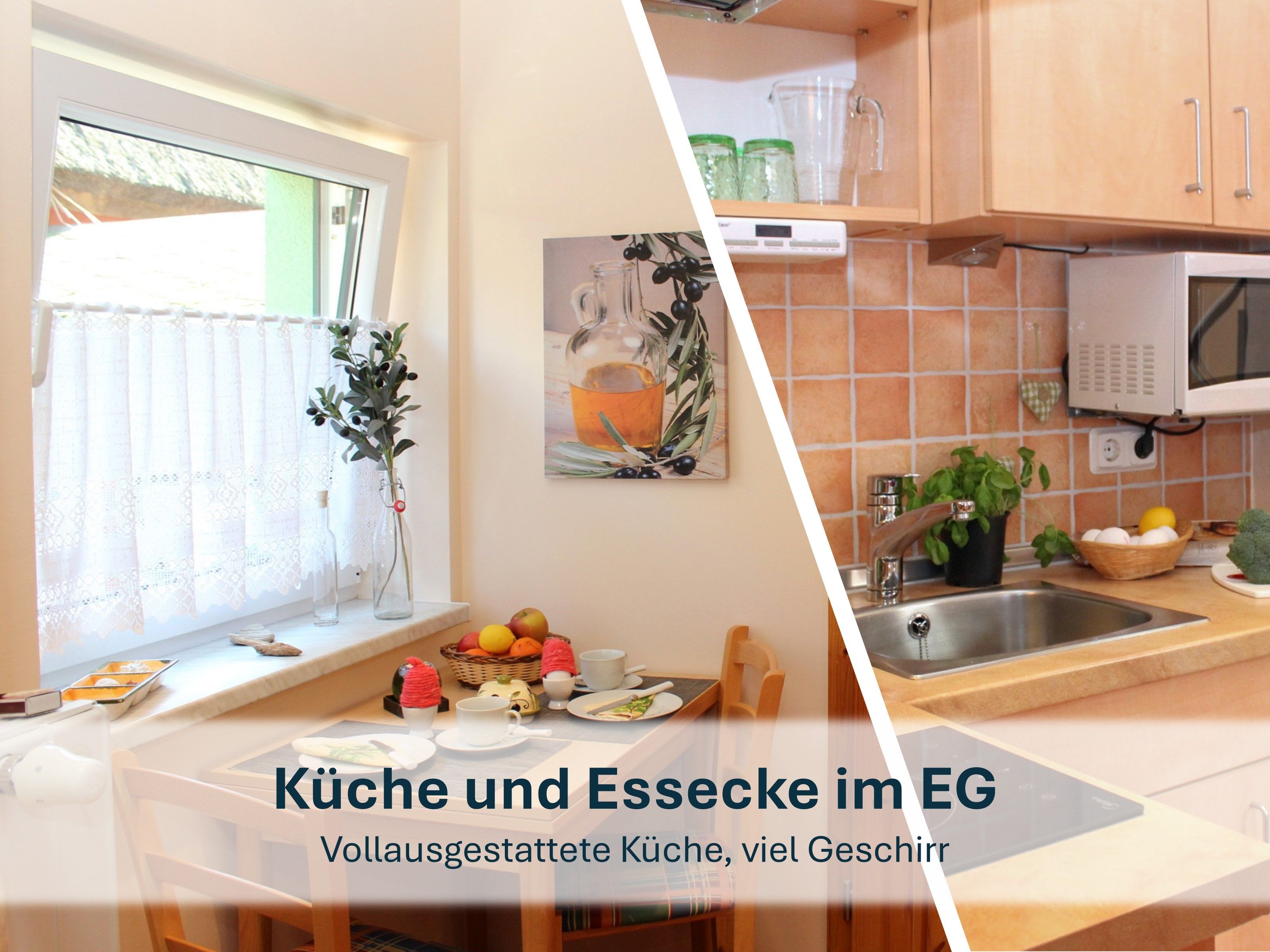 Im Erdgeschoss: moderne Küche und Badezimmer mit Dusche.