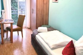 Gästezimmer mit Einzelbett, Kleiderschrank und Schreibtisch