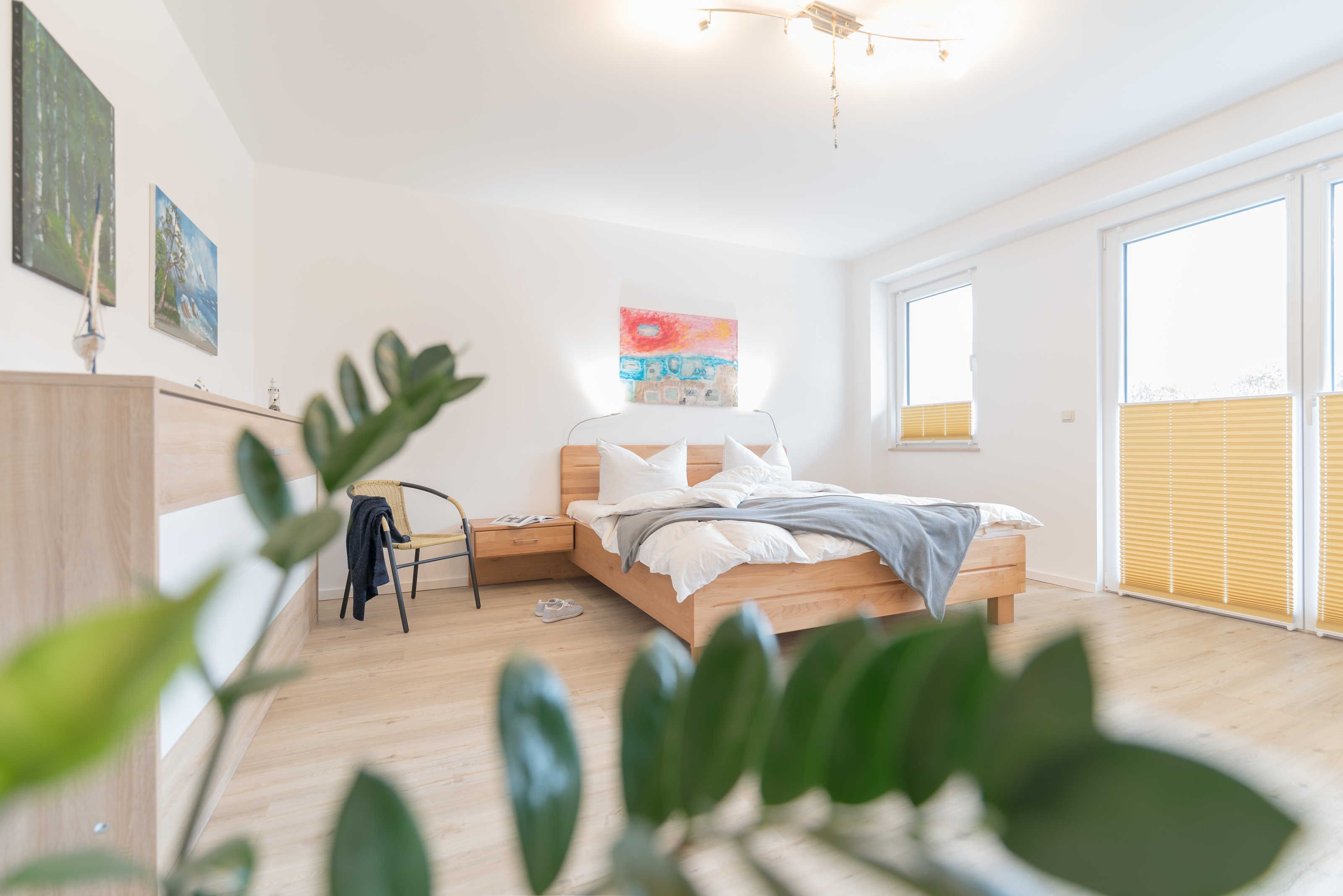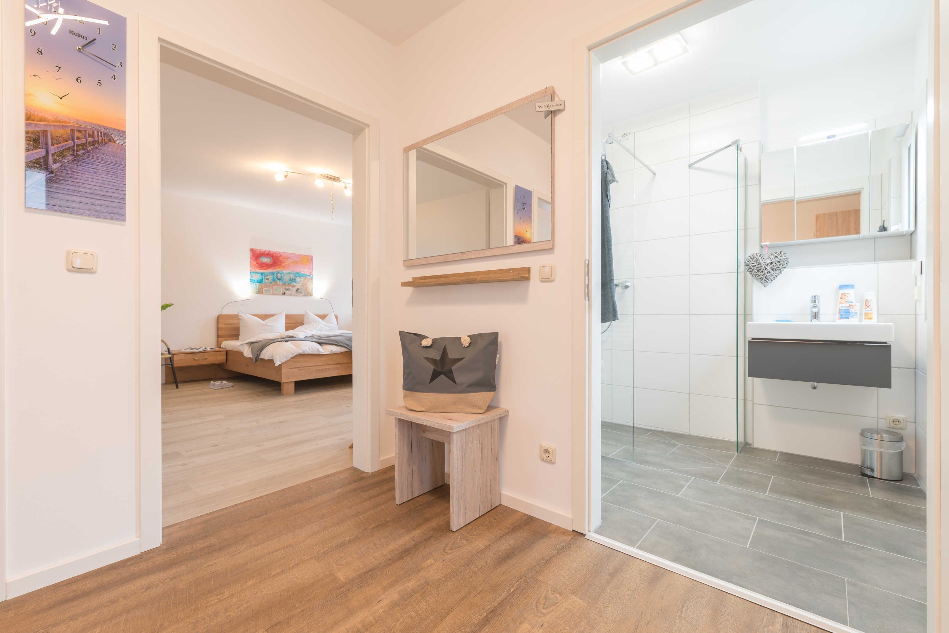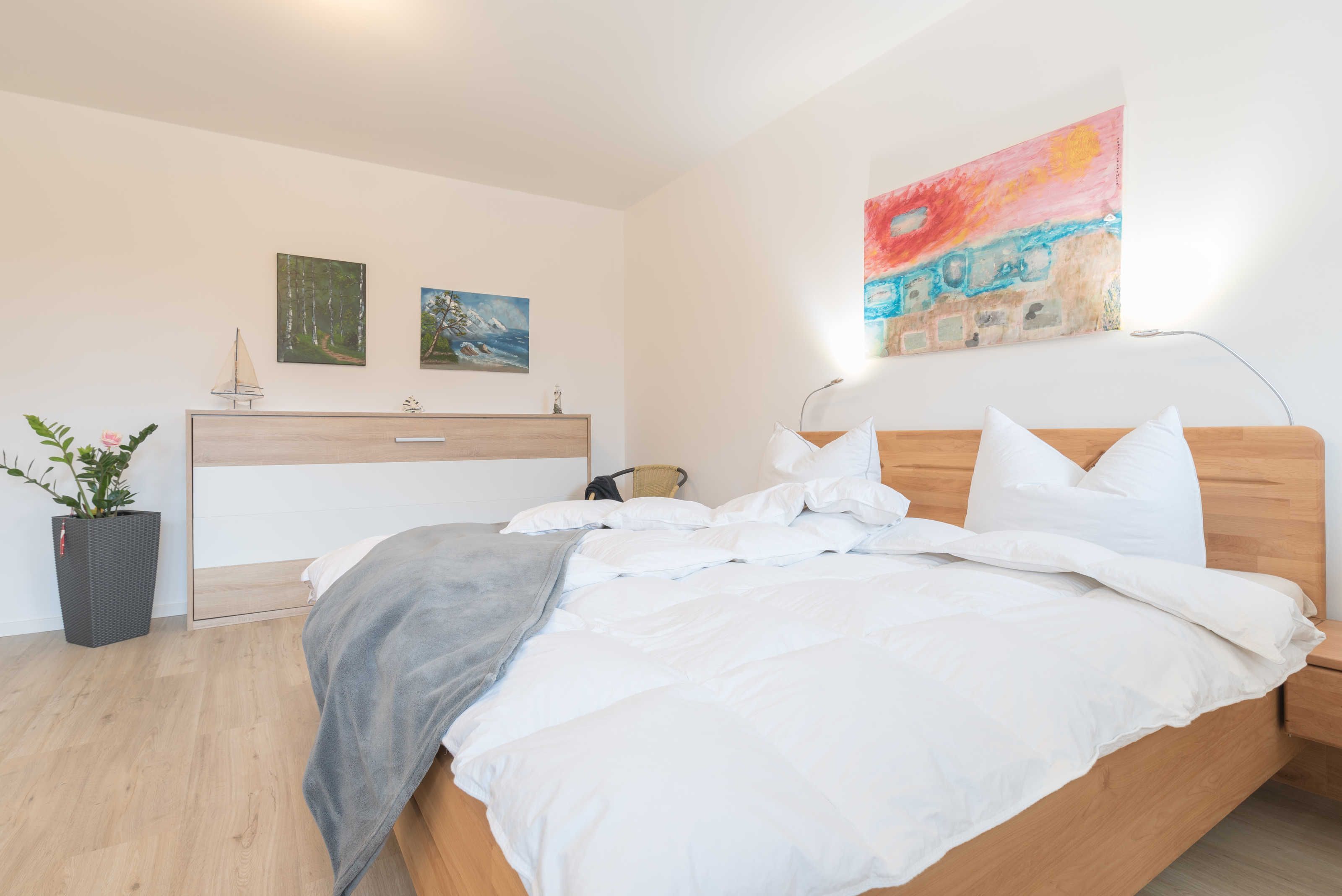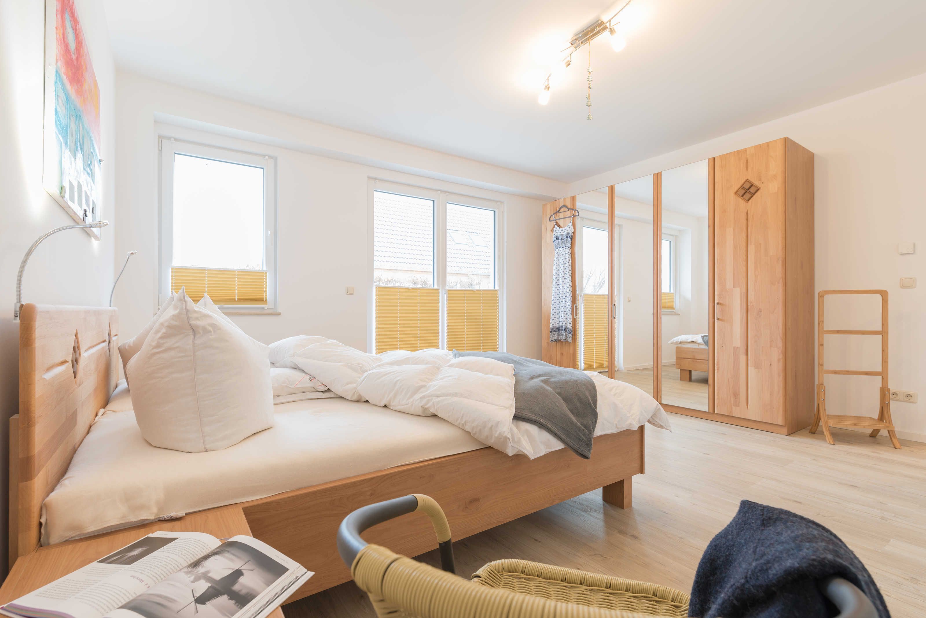 Ein geräumiges Schlafzimmer, Bett (180 x 200 cm) mit zwei Einzel- Federkernmatratzen und einem Klappbett (0,90x200 cm). Ein geräumiger Kleiderschrank, in dem ein Staubsauger und ein kl. Bügelbrett mit Bügeleisen unter gebracht sind. Das Bad ist mit einer ebenerdigen, offenen Dusche, einem Handtuchheizkörper und Fön ausgestattet. Alle Türen sind 1 m breit, alle Räume ohne Schwellen.