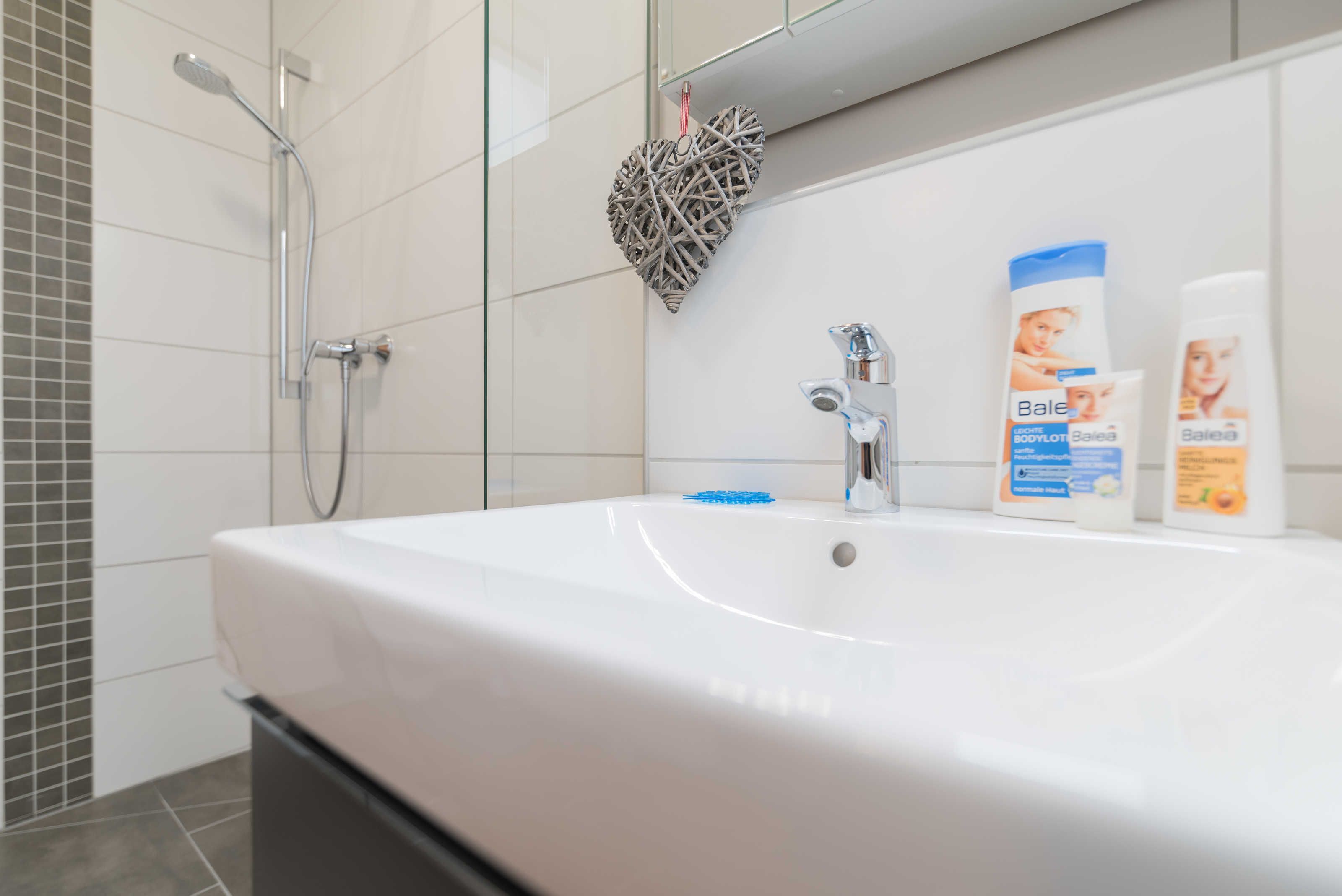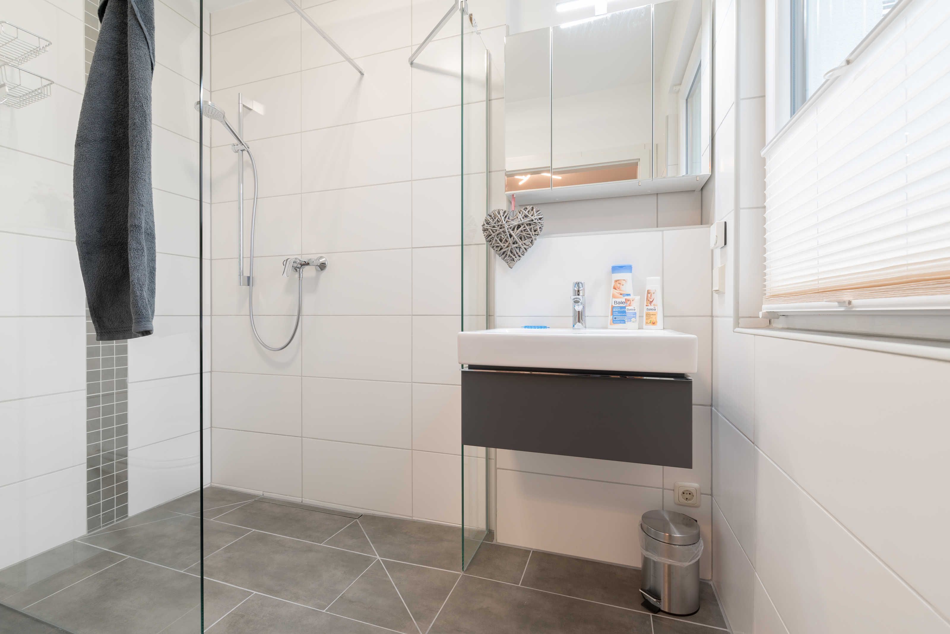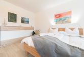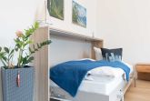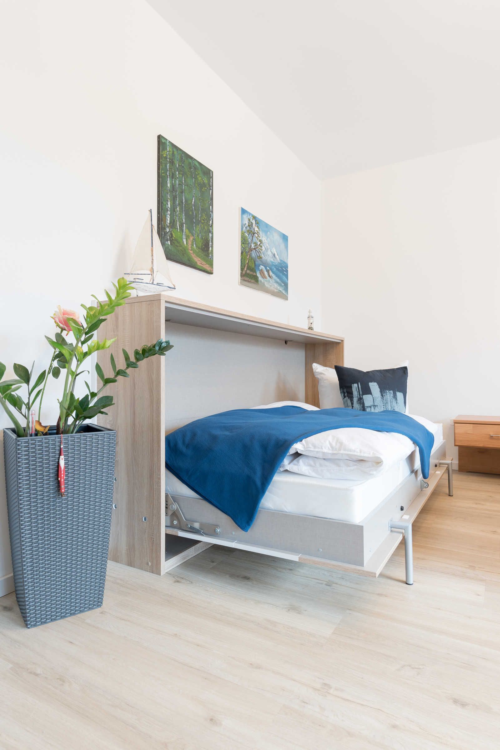 Ein geräumiges Schlafzimmer, Bett (180 x 200 cm) mit zwei Einzel- Federkernmatratzen und einem Klappbett (0,90x200 cm). Ein geräumiger Kleiderschrank, in dem ein Staubsauger und ein kl. Bügelbrett mit Bügeleisen unter gebracht sind. Das Bad ist mit einer ebenerdigen, offenen Dusche, einem Handtuchheizkörper und Fön ausgestattet. Alle Türen sind 1 m breit, alle Räume ohne Schwellen.