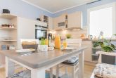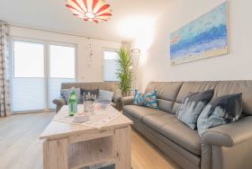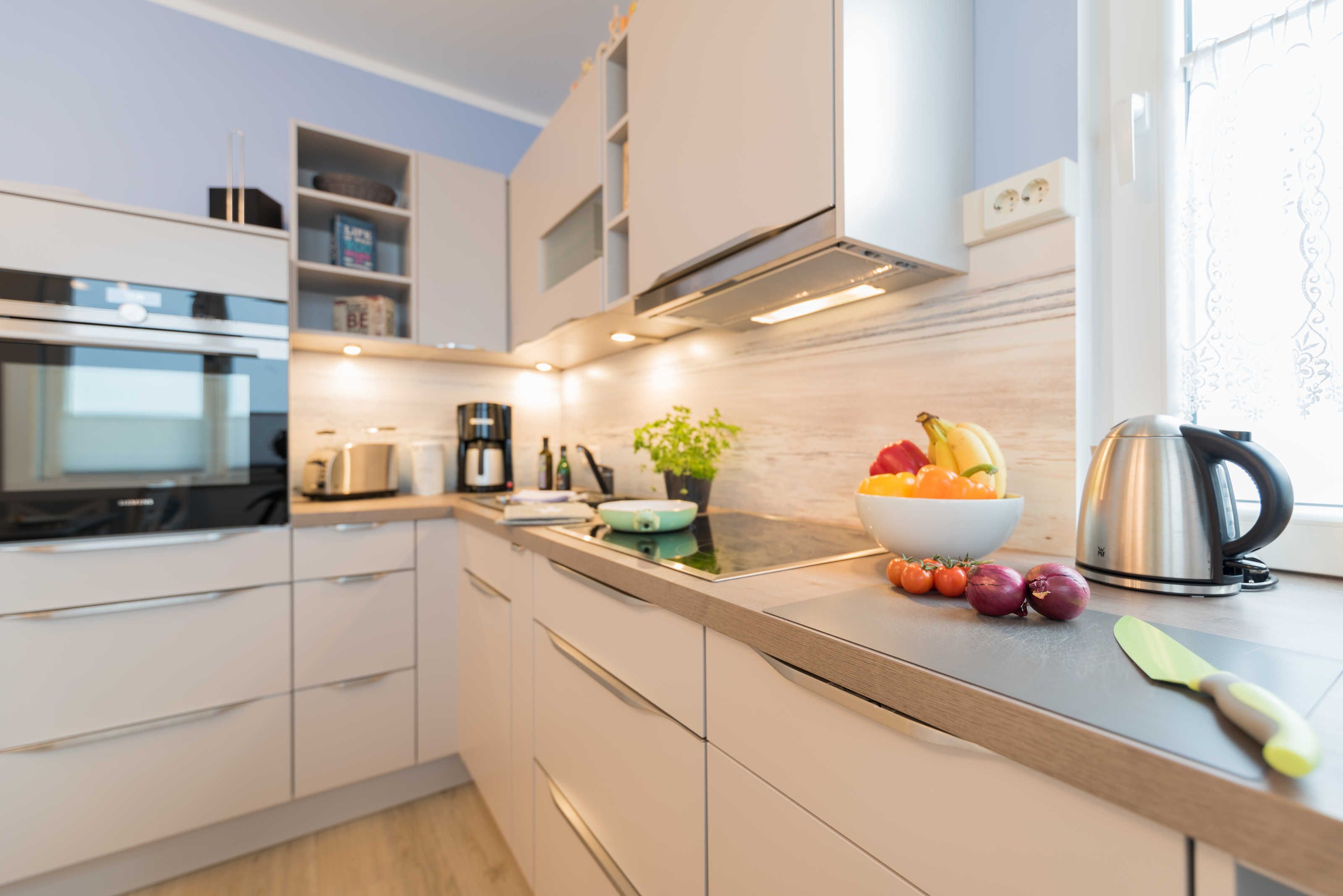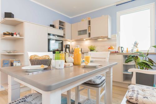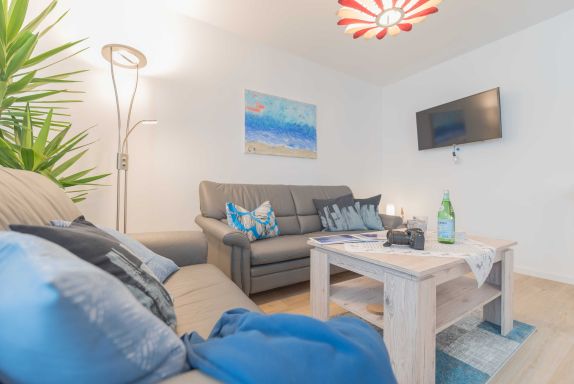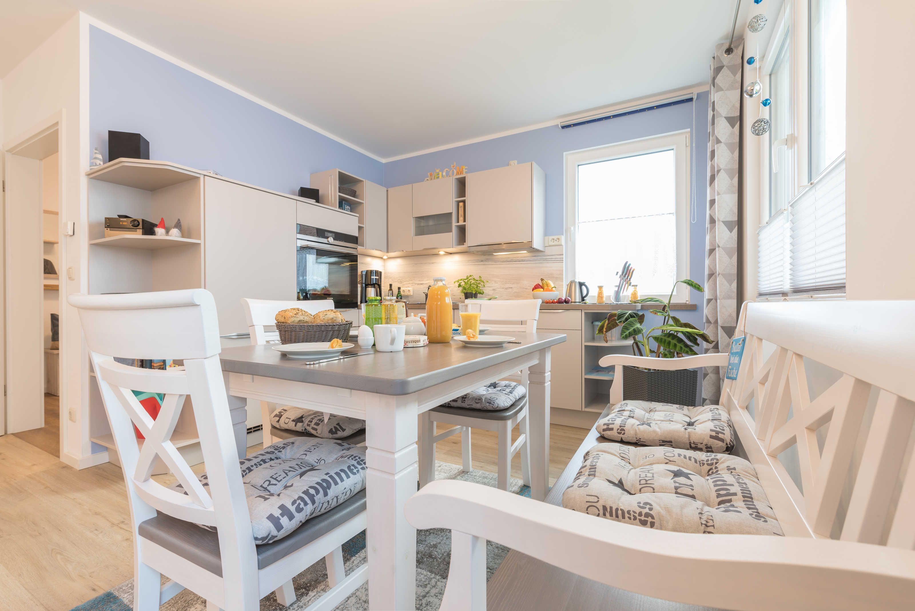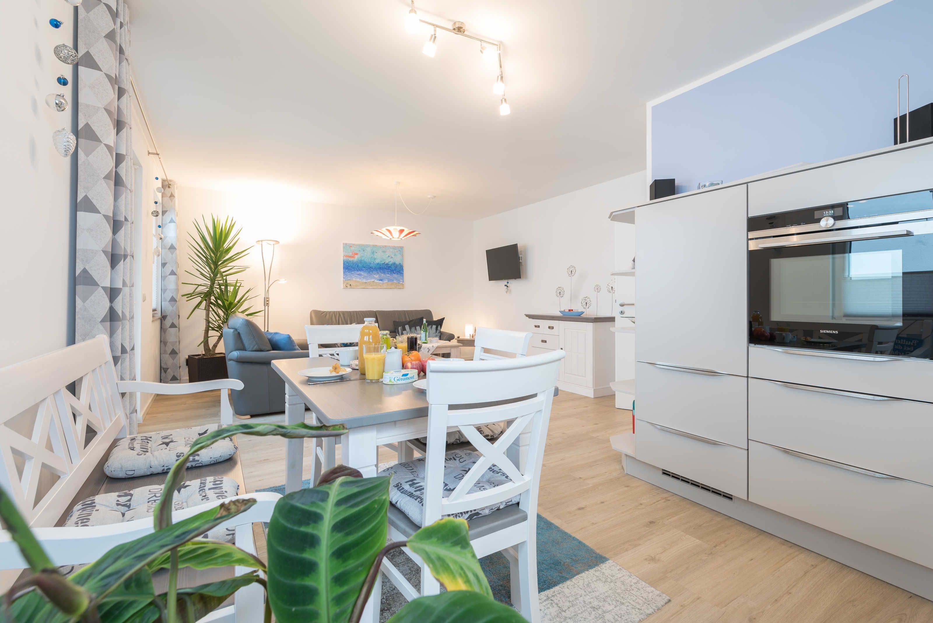 Sie verfügt über ein Wohn-Essbereich inklusive offener Einbauküche, ausgestattet mit einem Kühlschrank mit Tiefkühlfach, Cerankochfeld, Backofen,-Mikrowellenkombi, Kaffeemaschine, Wasserkocher, Toaster, Eierkocher, und einer gemütlichen Essecke. Geschirr und Gläser sind in ausreichender Zahl vorhanden. Der Wohnbereich ist mit einer Sitzgruppe, TV und Musikanlage, Bücher und Spiele ausgestattet.
