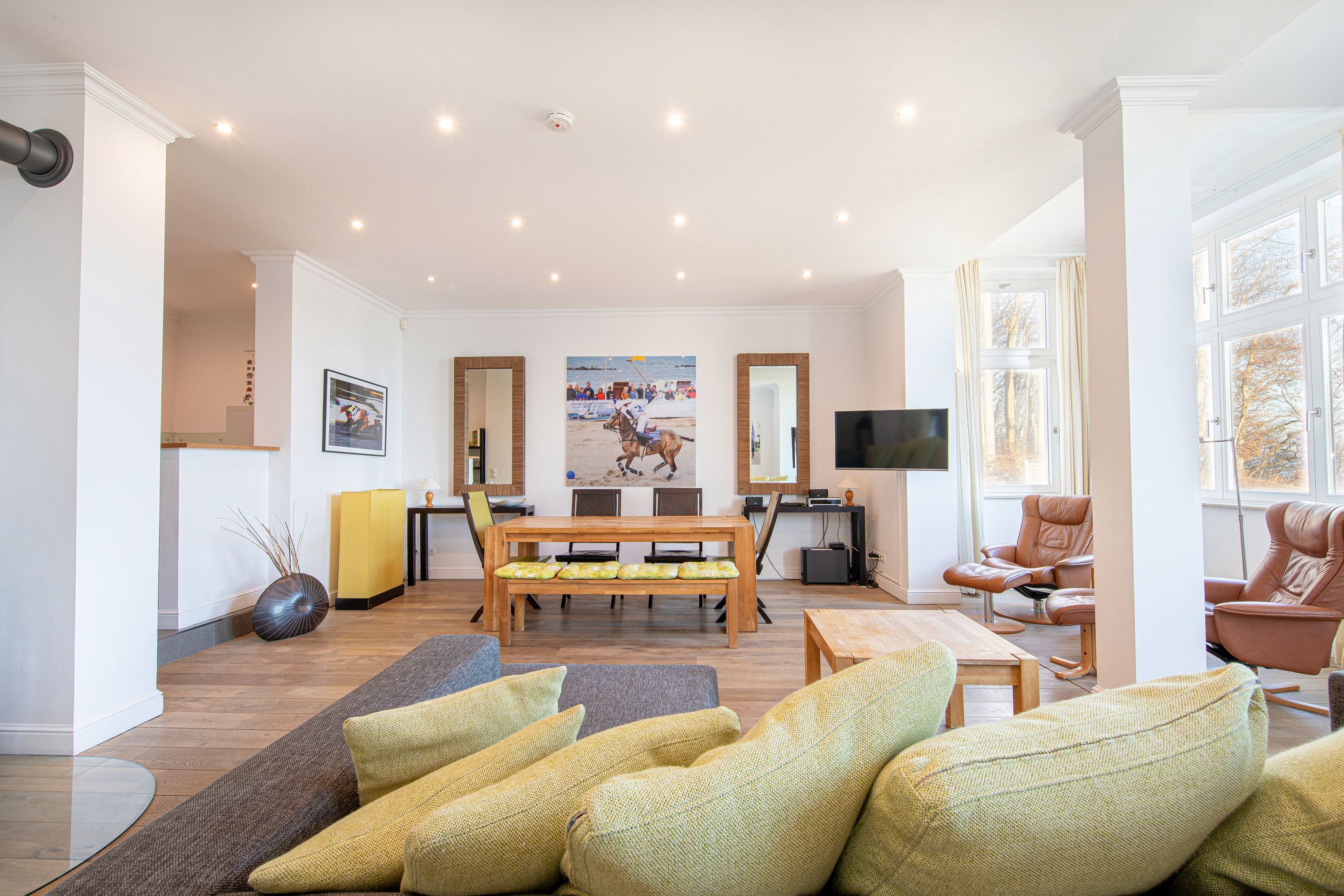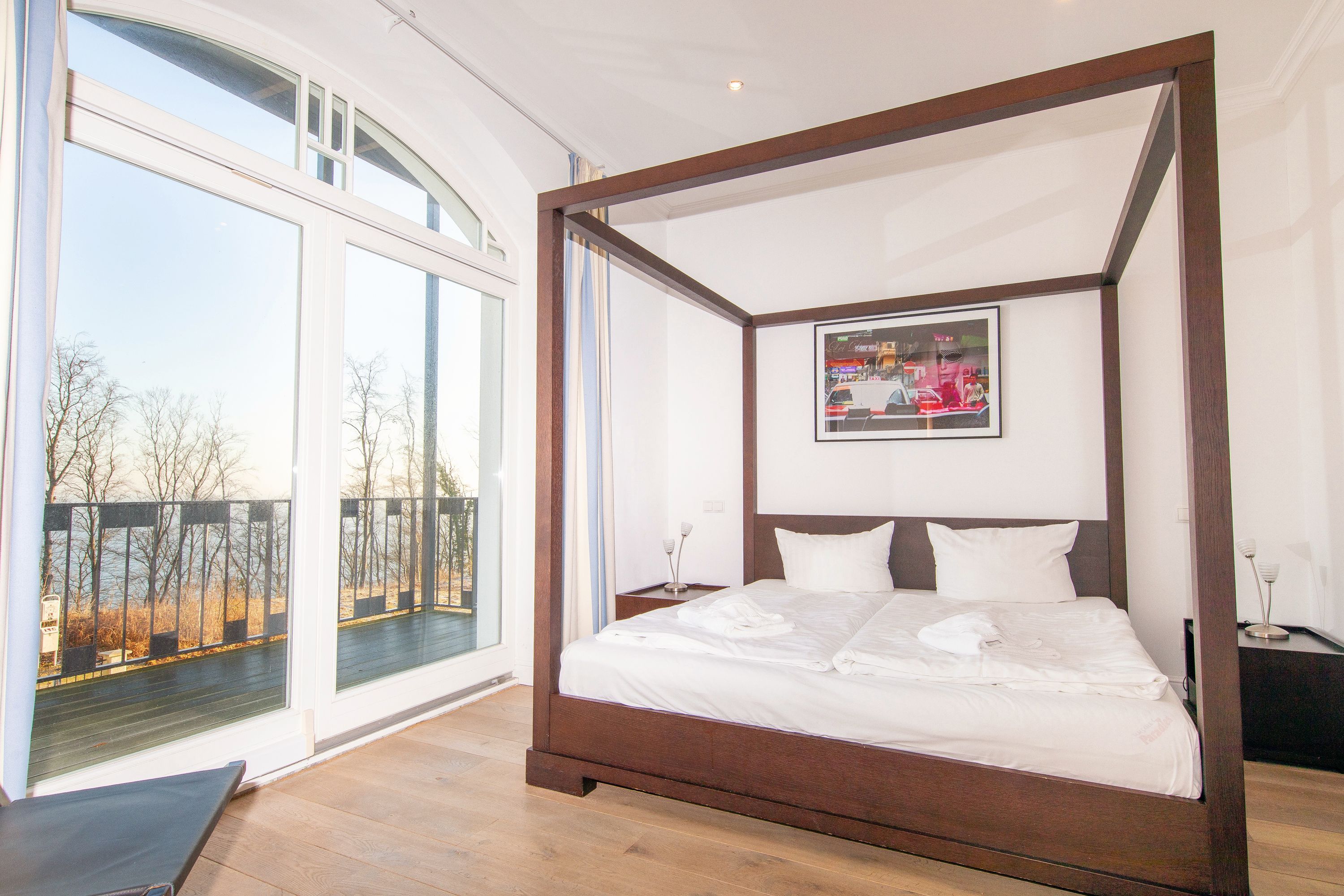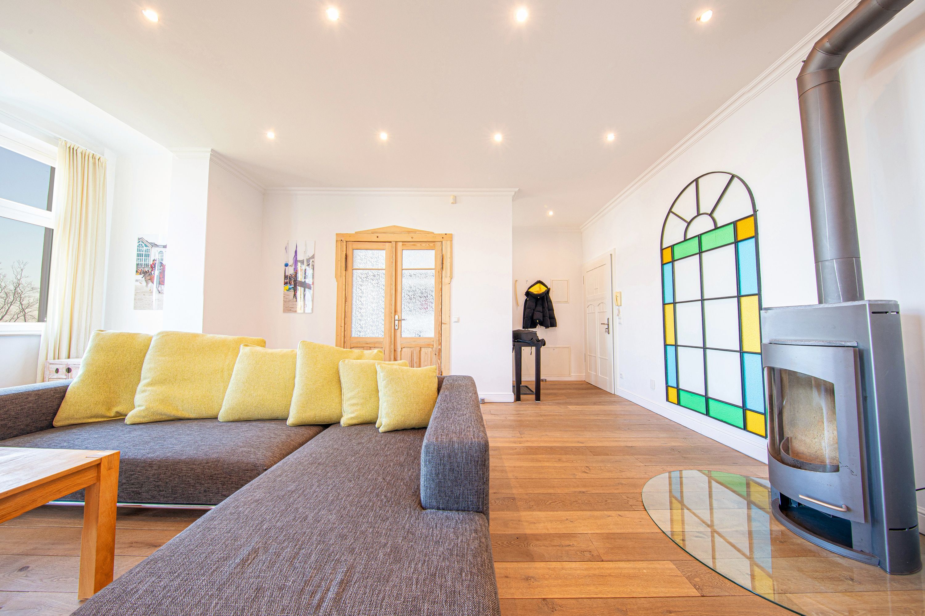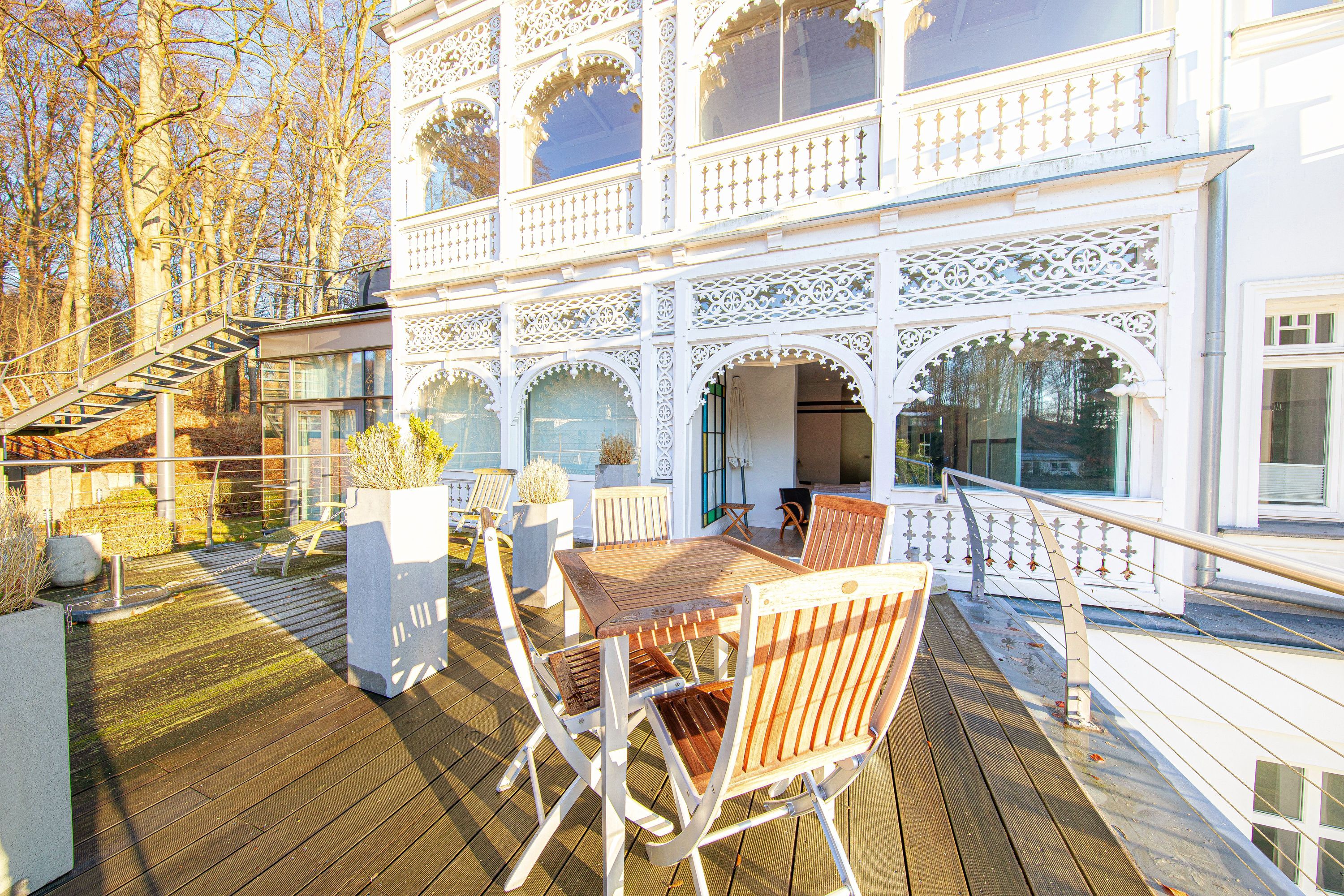 In Hochpaterre befindet sich der Eingang zu Ihrem rund 110m2 großen Traumdomizil. Aus dem Wohnbereich und dem daran angrenzenden Schlafzimmer 1, lässt sich ein fantastischer und unverbaubarer Meerblick genießen. Den Blick entlang der Ostseeküste weit auf das Meer schweifen zu lassen, lässt einem fast den Atem stocken -wirklich atemberaubend-. Neben dem großzügigen Wohnbereich, welcher mit exklusiven Möbeln eingerichtet wurde, befinden sich in dieser mondänen Wohnung auch 2 Schlafzimmer mit Bad en Suite, sowie auch eine hochwertige und sehr gut ausgestattete Küche. Hier lässt sich für die gesamte Familie kochen und private Zeit genießen. Die Wohnung verfügt zudem über 2 Balkone/Terrassen welche sich durch die Ausrichtung sowohl für ein sommerliches Frühstück draußen, als auch für einen Sundowner am Abend nutzen lassen. Als kleines Highligt der Wohnung fällt sofort der alte Holzfussboden aus massiver Eiche auf, welcher durch die Jahre der Nutzung eine einmalige Patina aufweist und so seine ganz eigene Geschichte erzählt. Der Boden verleiht der Wohnung den Charakter, der sich über die gesamte Villa darstellt. So herrscht hier eine tolle Symbiose aus Alt und Neu.