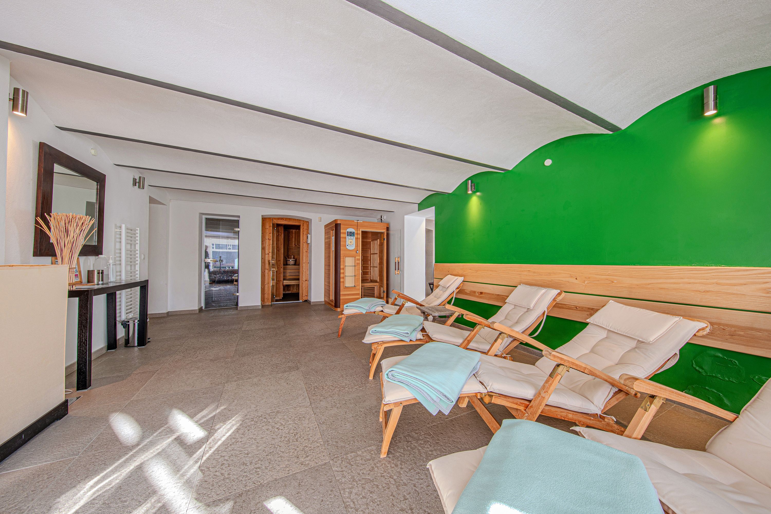 Neben Ihrem reservierten PKW - Stellplatz steht Ihnen im Erdgeschoss des Hauses ein großer und kostenfrei nutzbarer Wellnesbereich zur Verfügung. Neben einer Sauna, einem Dampfbad und einer Wärmekabine, steht hier auch ein Ruheraum mit einigen Liegen zur Verfügung. Zusätzlich dazu ist im angelegten Außenbereich des Hauses saisonal (in den Sommermonaten) ein großer Pool kostenfrei nutzbar.