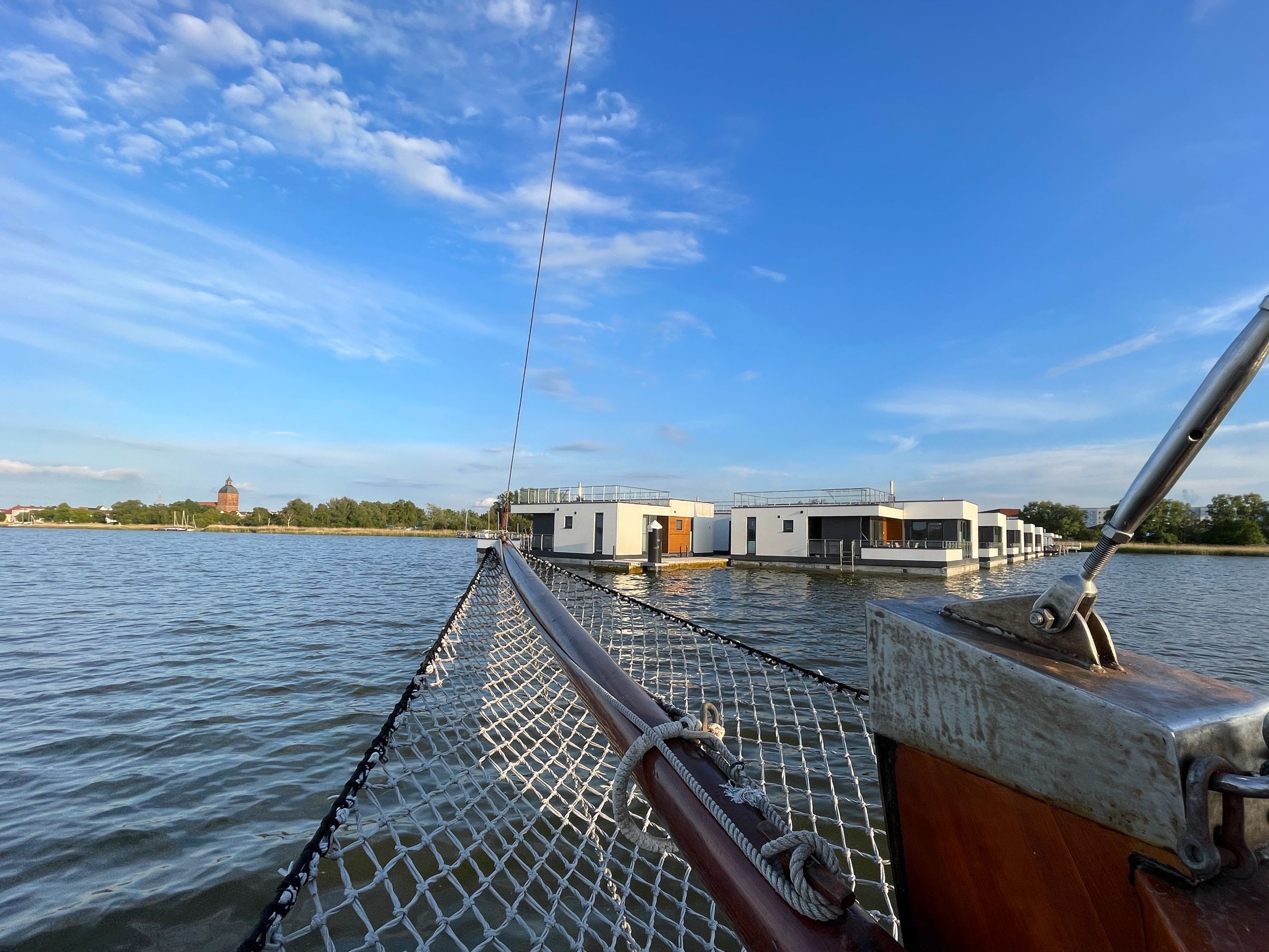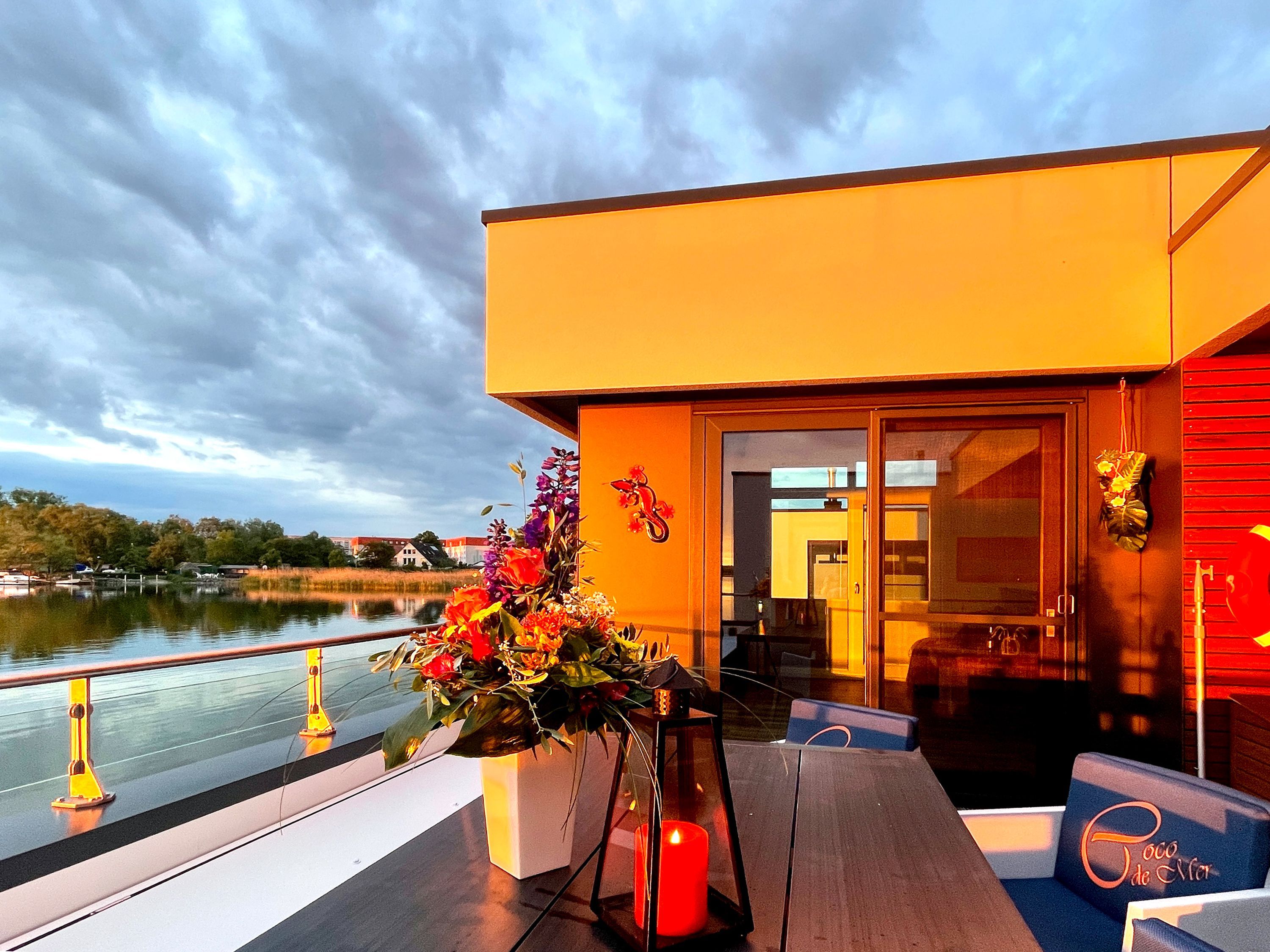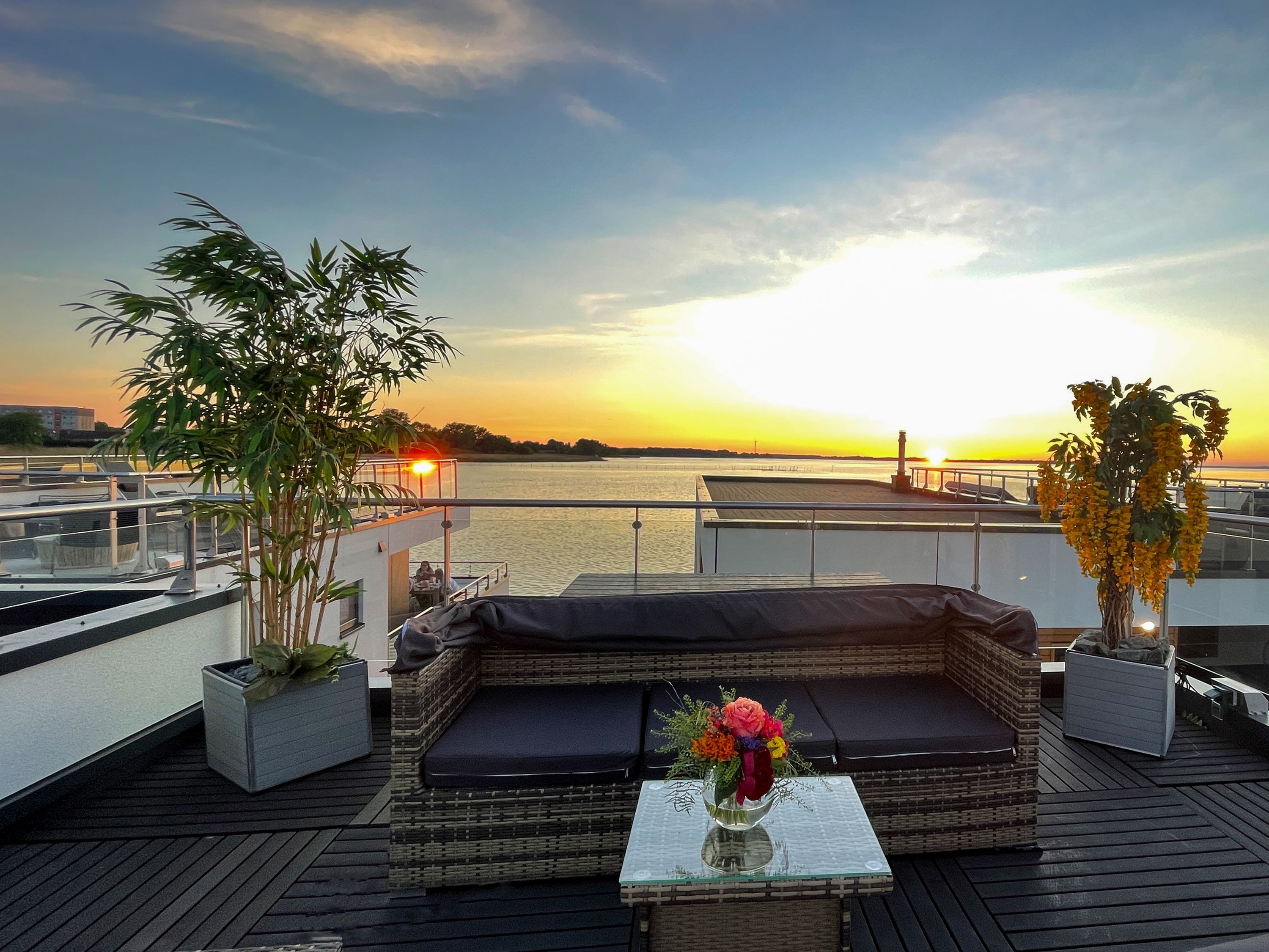 Floating Hideaway Coco de Mer ist dein schwimmendes Zuhause auf Zeit, gelegen nahe dem malerischen Hafen von Ribnitz-Damgarten. Mit 85 m² Wohnfläche bietet das luxuriöse Hausboot Platz für bis zu 6 Personen und kombiniert modernes Design mit einer einzigartigen Lage direkt auf dem Wasser. Zwei gemütliche Schlafzimmer laden zum Träumen ein und die zwei Badezimmer sorgen dafür, dass es auch bei voller Belegung entspannt bleibt. Als besonderes Extra erwartet dich eine private Sauna, in der du die Seele baumeln lassen kannst - ein Luxus, der auf dem Wasser seinesgleichen sucht. Das Highlight des Coco de Mer sind die großzügigen Außenbereiche: Auf der Bugterrasse kannst du die ersten Sonnenstrahlen genießen und die Dachterrasse lädt zu entspannten Abenden mit herrlichem Blick über den Hafen ein. Für pure Entspannung kannst du eine Wellnessmassage zubuchen, die Masseurin kommt direkt zu dir auf das Hausboot, damit du dich in privater Atmosphäre verwöhnen lassen kannst. Wer es aktiver mag, kann die Umgebung mit SUP-Boards erkunden, die gegen Gebühr zur Verfügung stehen. Auch dein Hund ist hier herzlich willkommen und darf gegen eine Gebühr mit an Bord kommen.