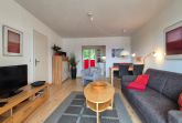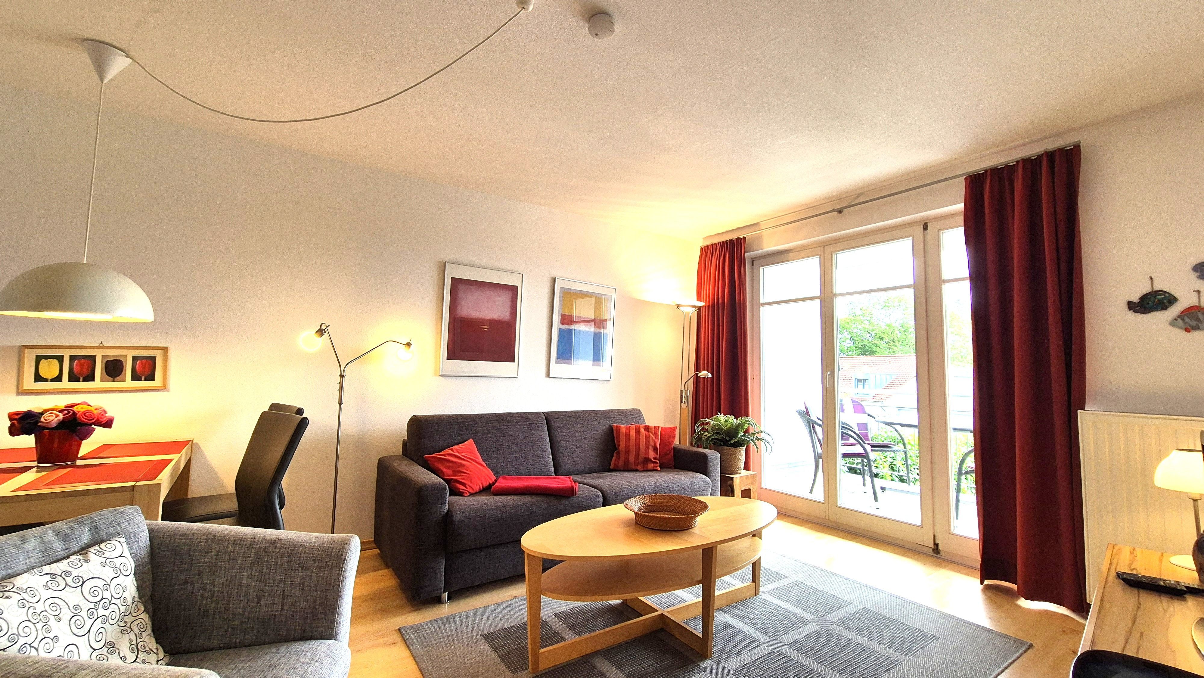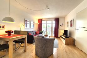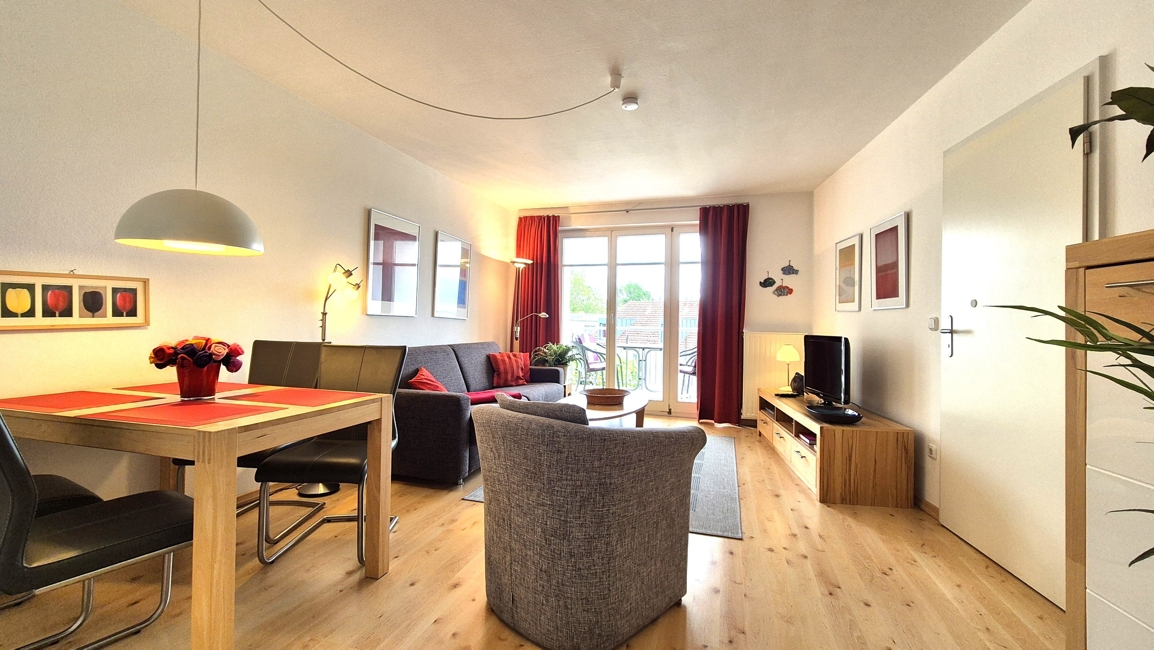 Ferienwohnung (Nr. 12) für bis zu 4 Personen (ca. 56 m²) im 1.OG mit Wohn- und Esszimmer mit offener Küche, 1 Schlafzimmer, 1 Bad und 1 überdachter Balkon.