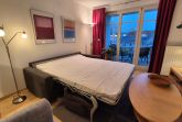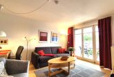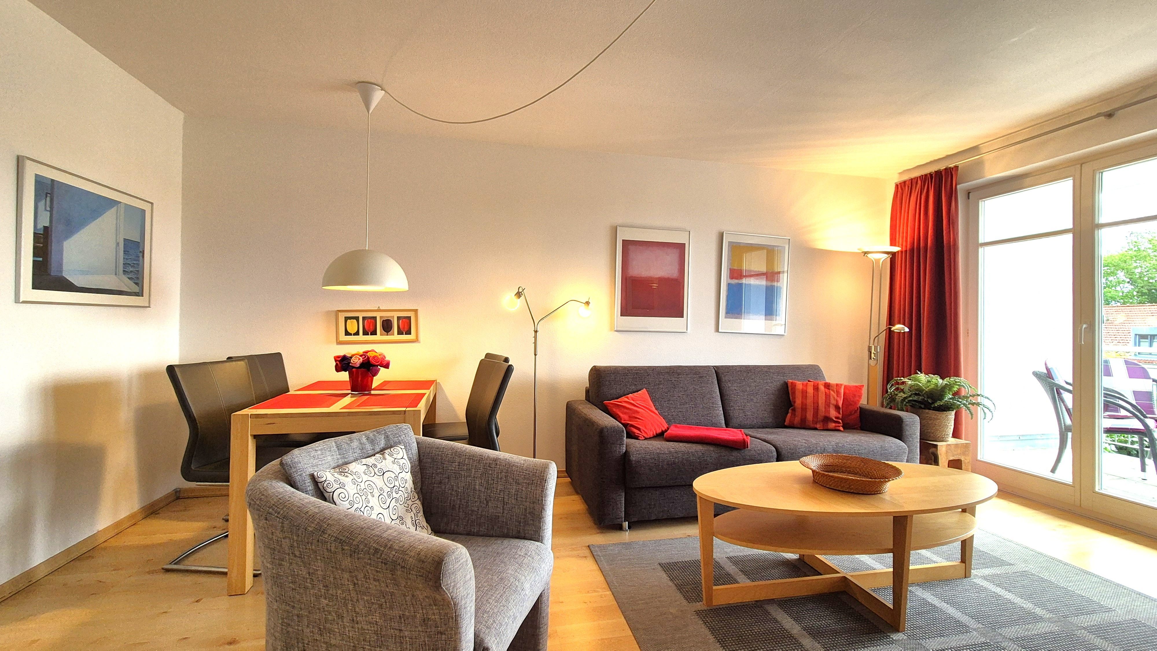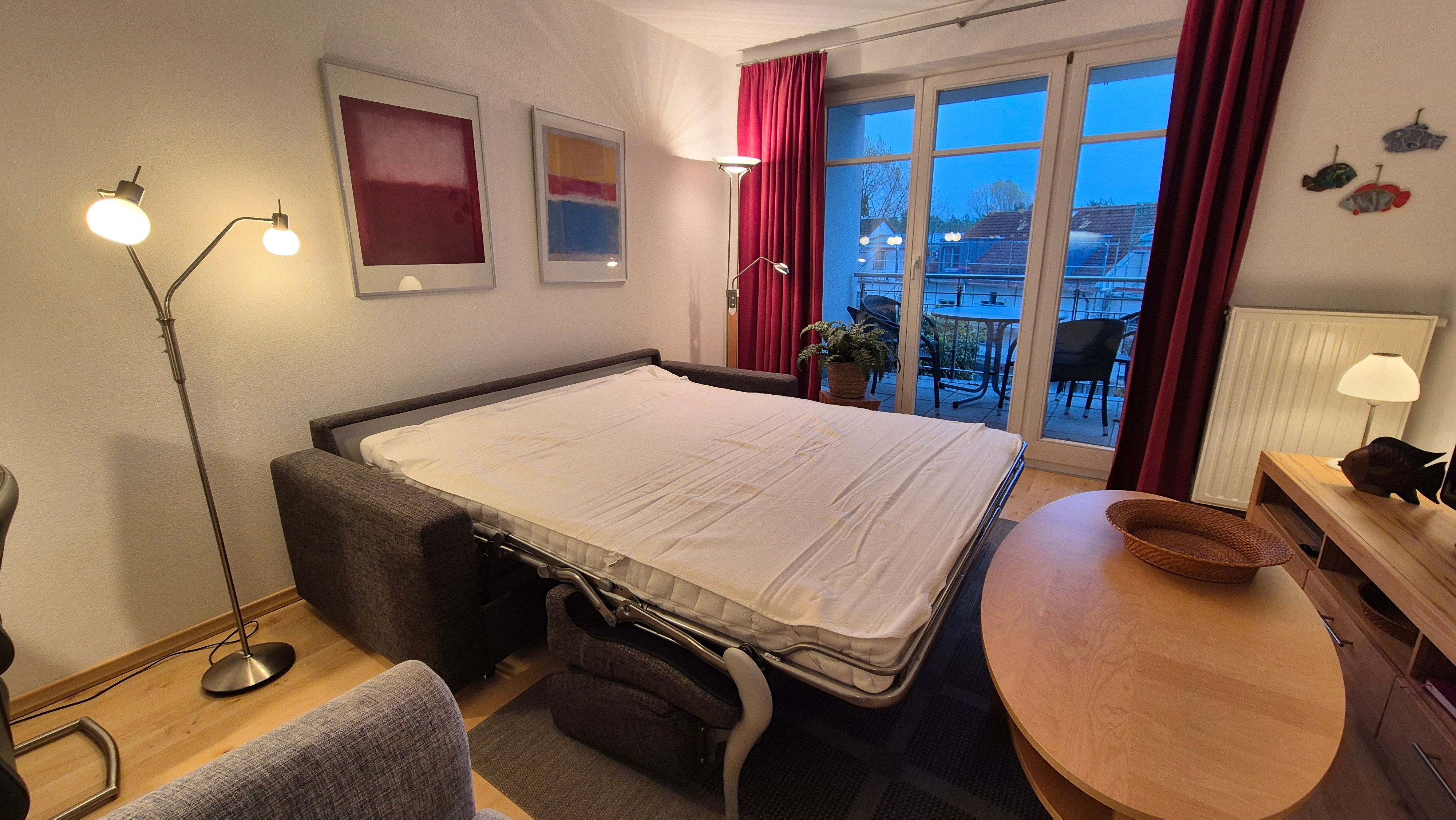• Wohn- und Esszimmer eingerichtet mit einem hochwertigem bequemen Schlafsofa (Liegefläche 1,60 x 2,00 cm), einem modernem Sessel, einem Couchtisch, einer Kommode sowie ein Esstisch mit vier Stühlen und einem Hochschrank.