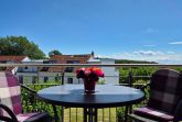 • Überdachter und windgeschützter Sonnenbalkon (Süd-Ost) mit einem Tisch und vier Stühlen sowie einer Sonnenliege und einem Sonnenschirm.