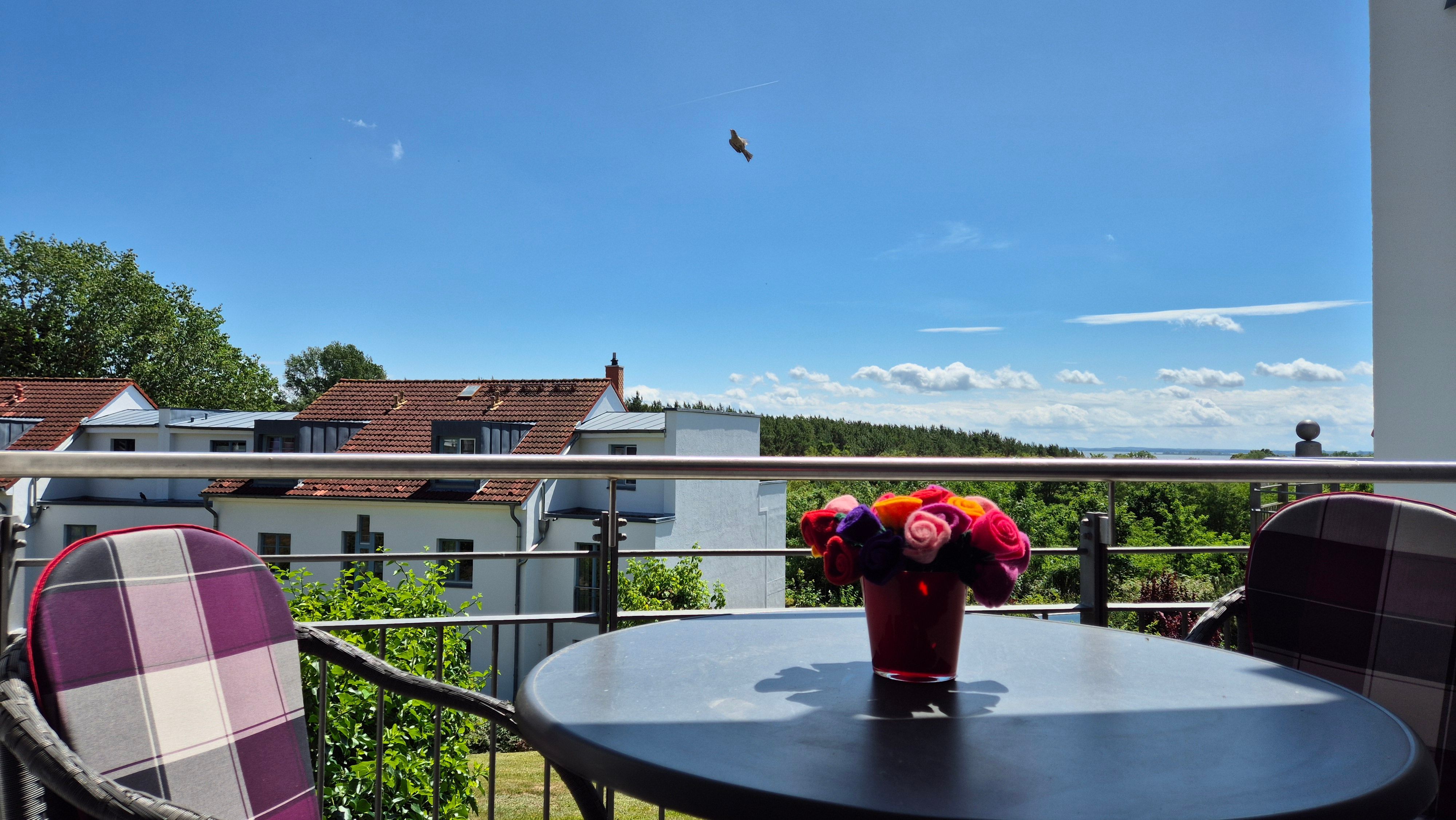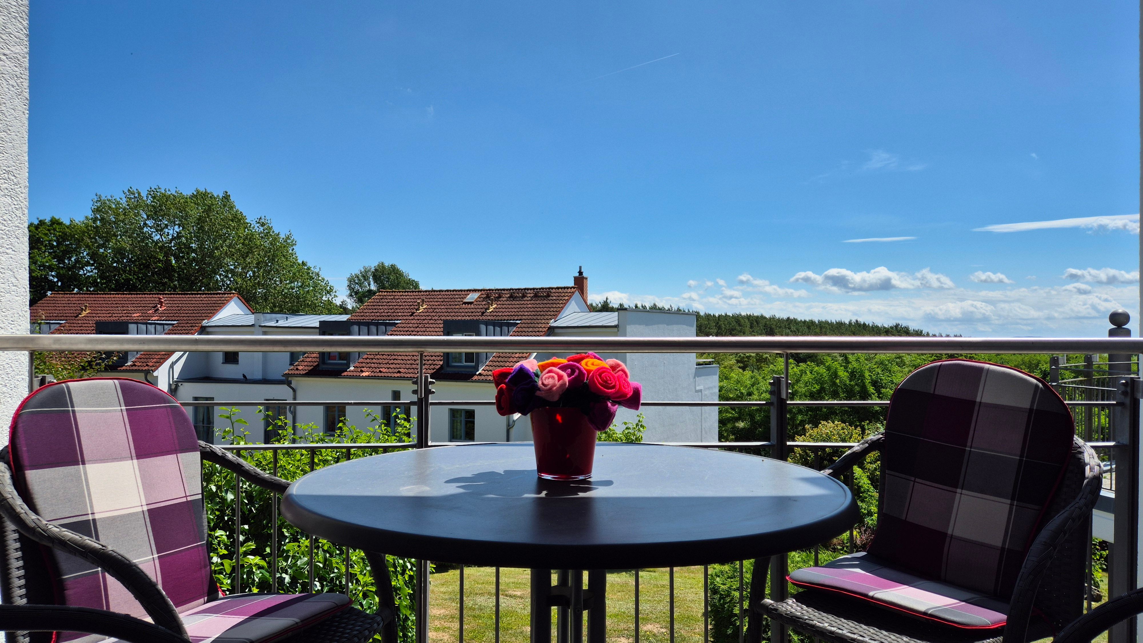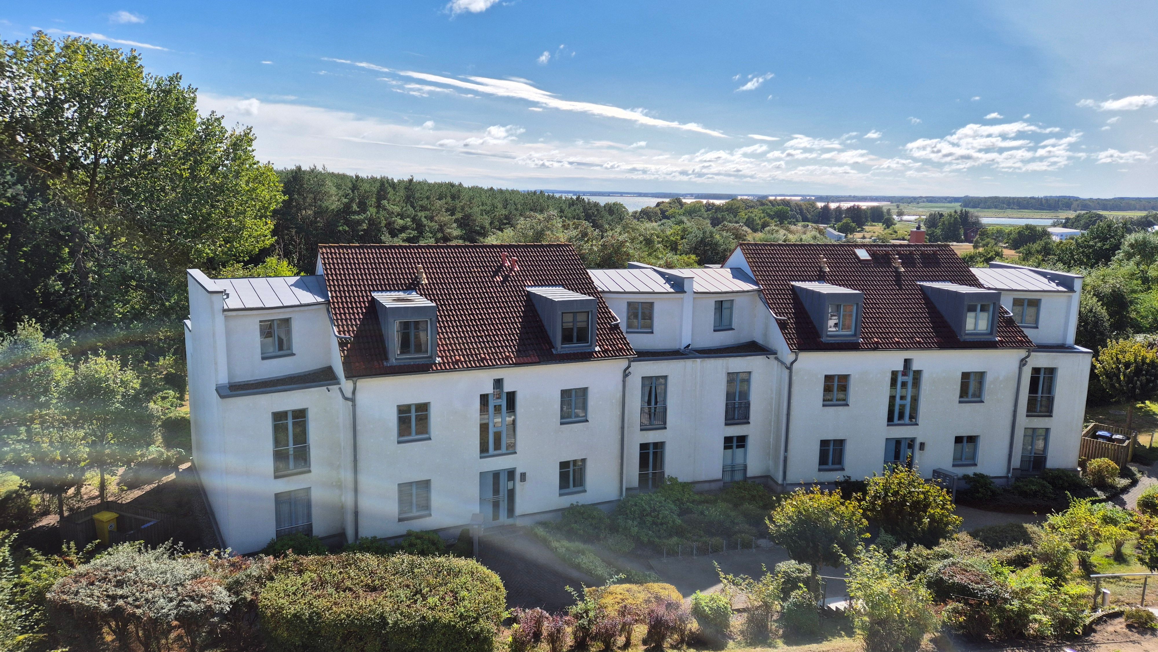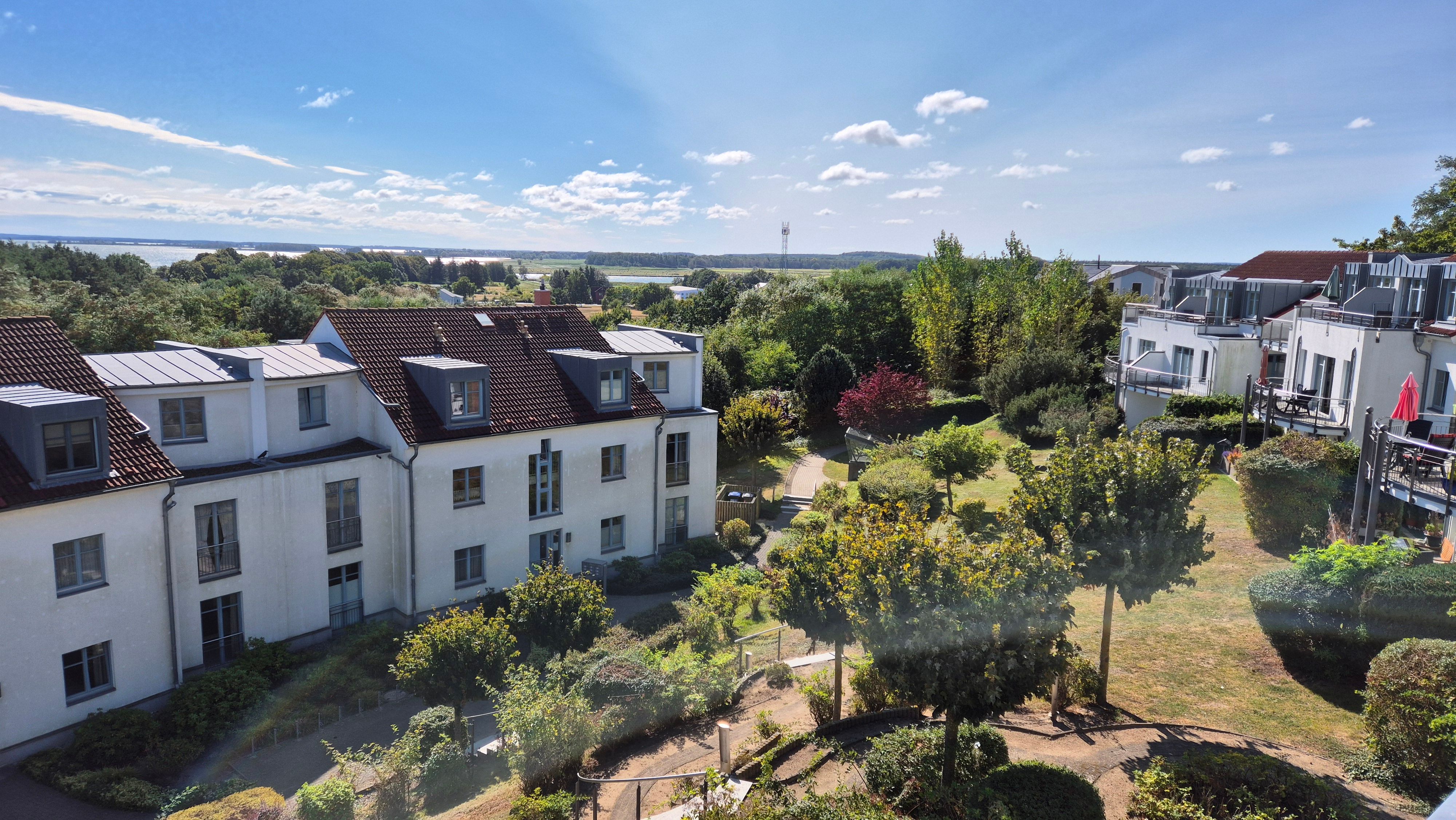 Diese 2-Zimmer-Ferienwohnung (Wohnung 12) befindet sich im 1. Obergeschoß in der Residenz Bellevue in 17454 Zinnowitz, Heimweg 8 und bietet einen schönen Blicke auf das Umfeld und die Landschaft, mit Wald und Achterwasser.