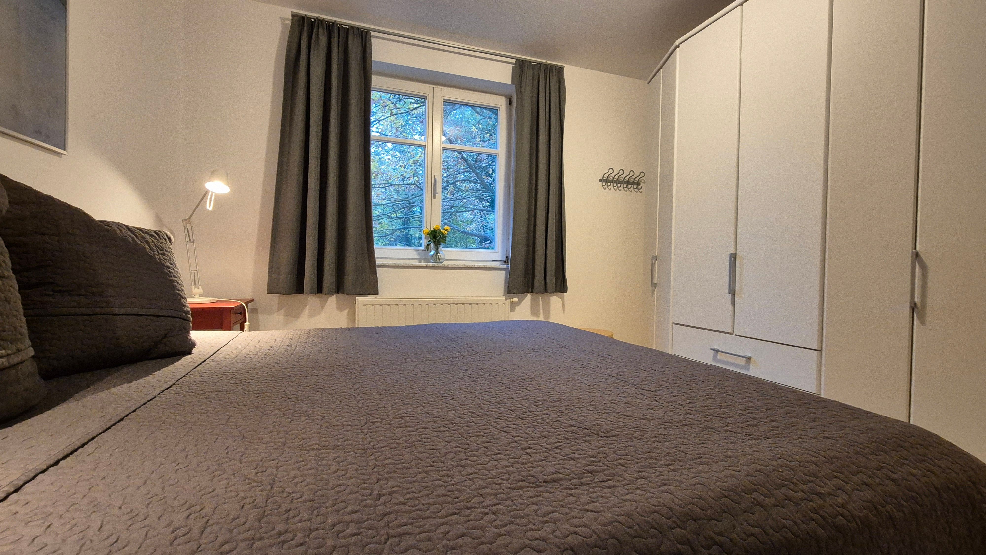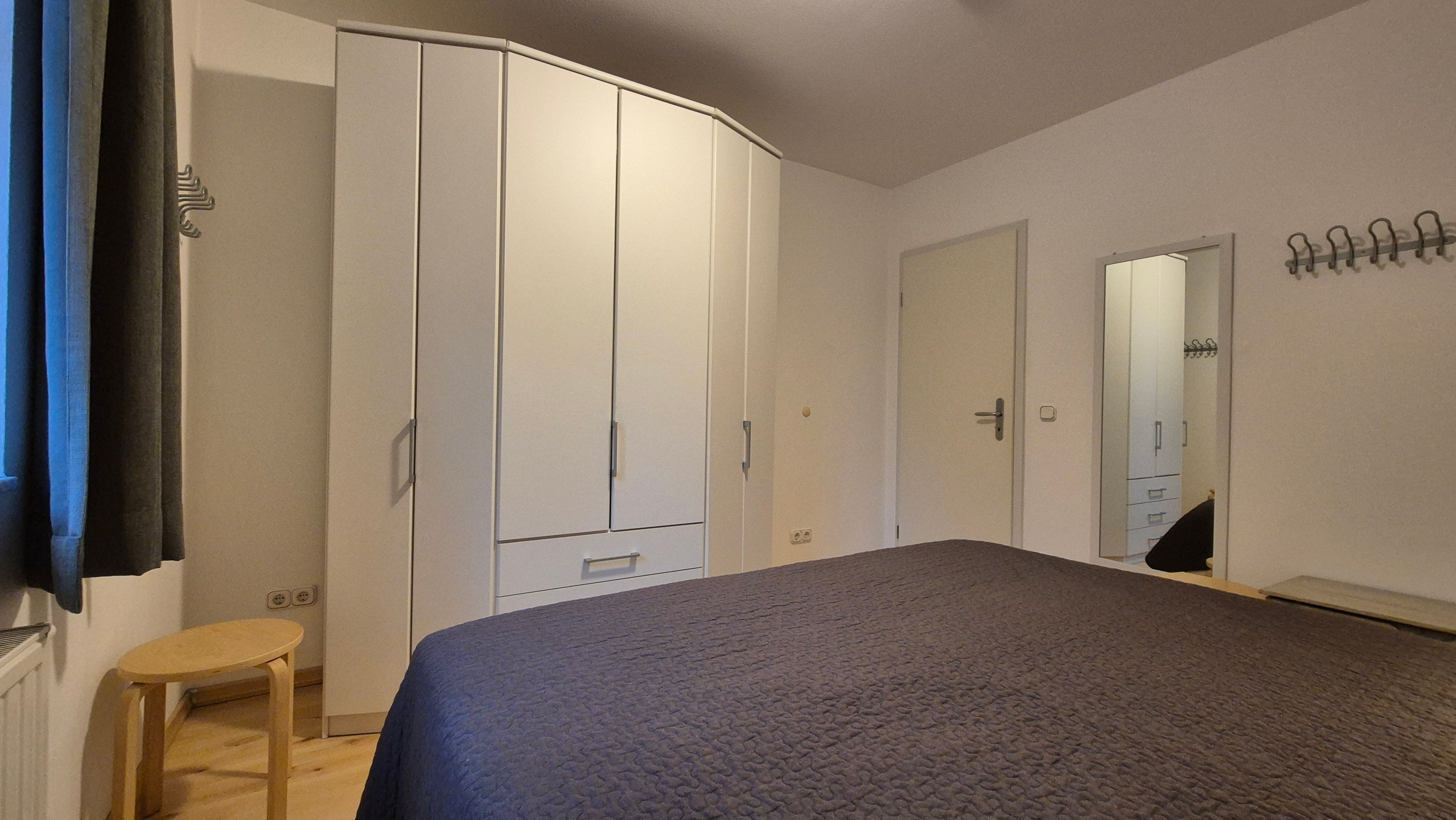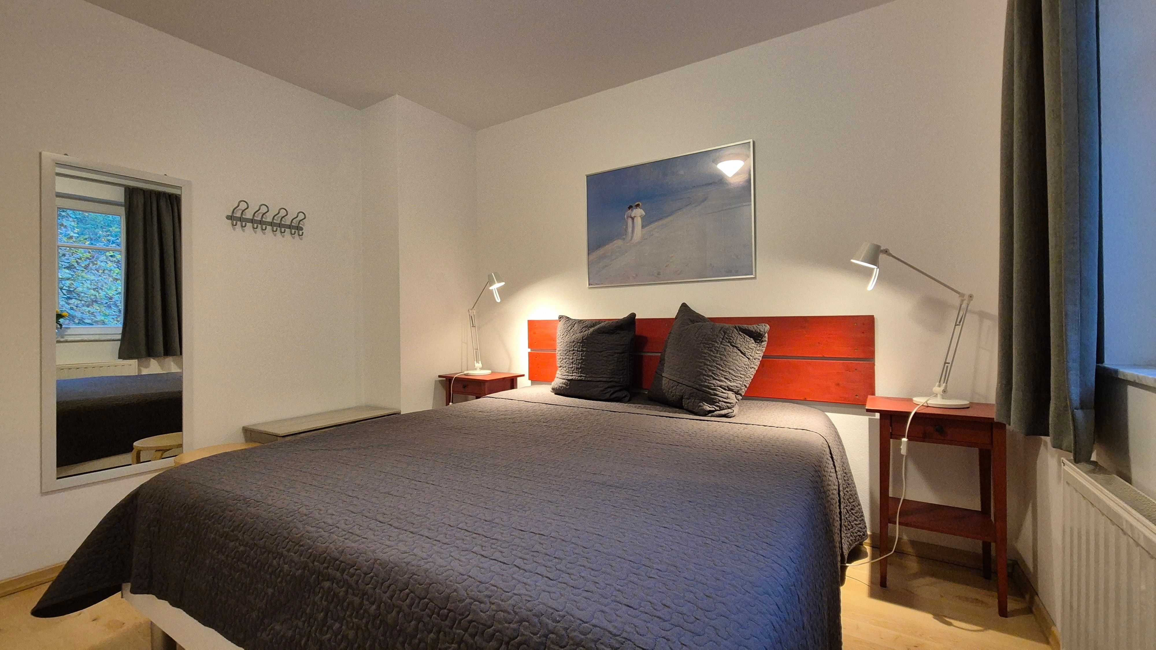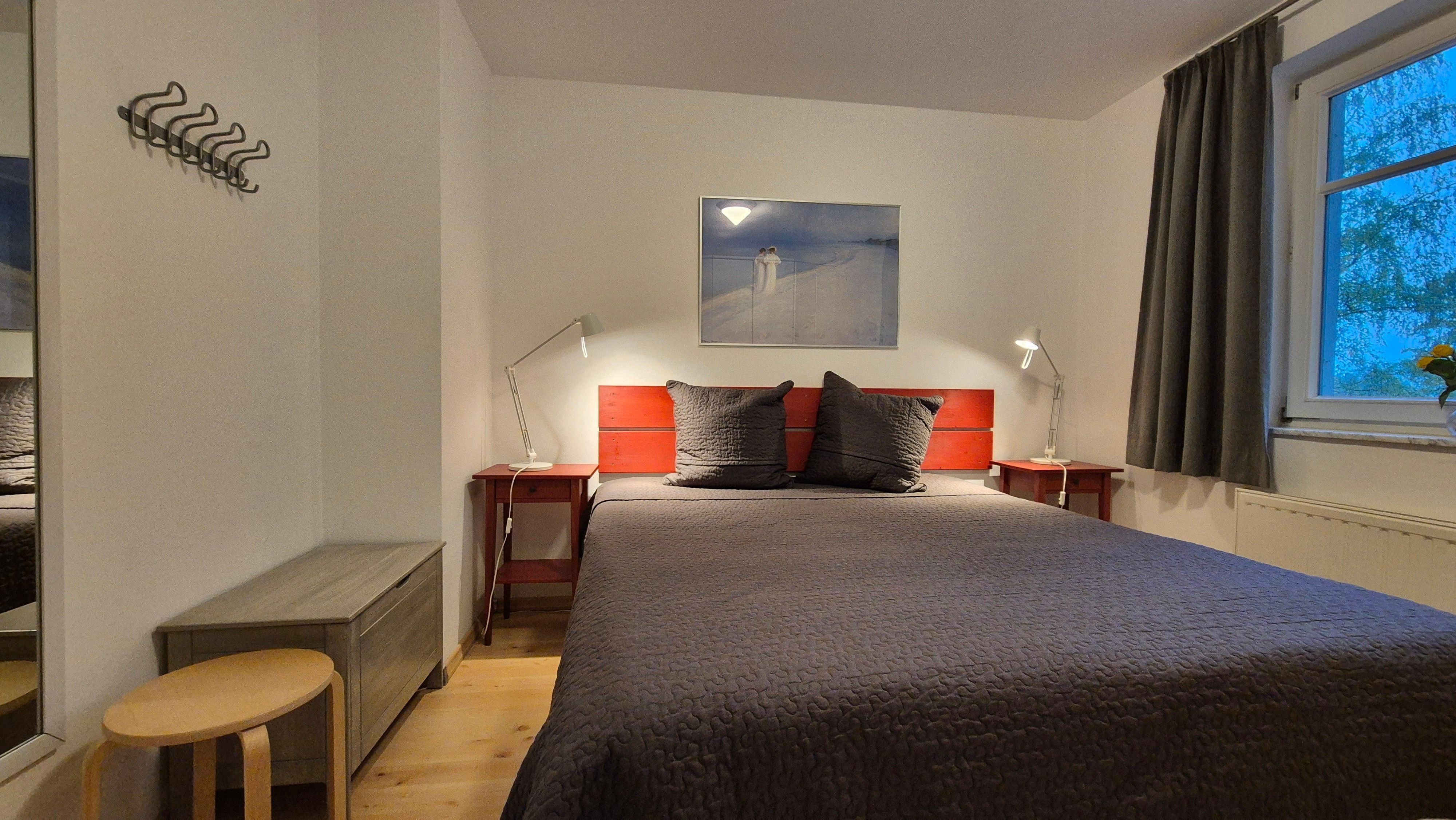 • Schlafzimmer mit Doppelbett (Liegefläche 1,80 x 2,00 cm), einem Kleiderschrank, zwei Nachtischen mit Nachtischlampen, zwei Hockern, zwei Garderoben und einem großen Spiegel.