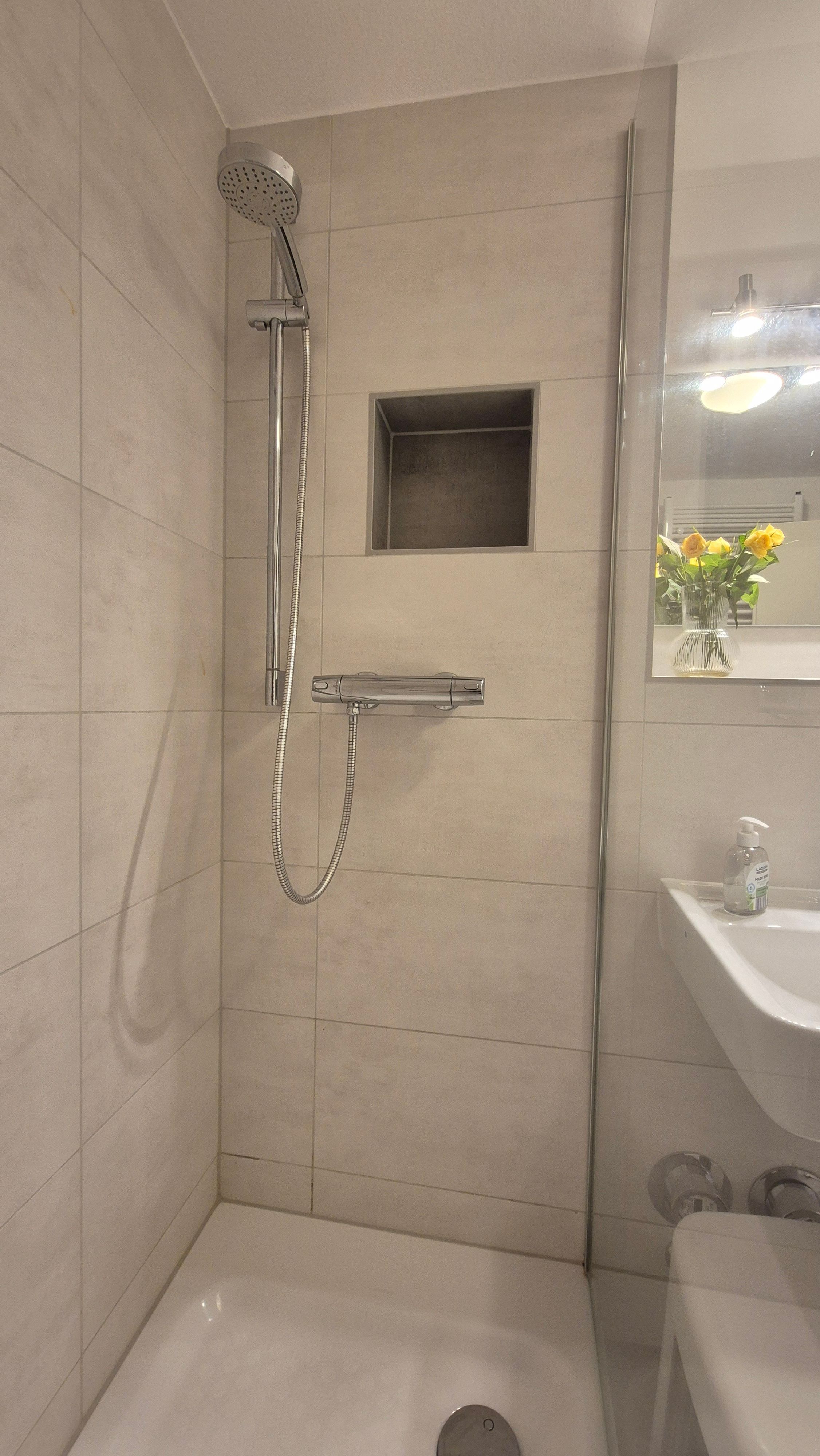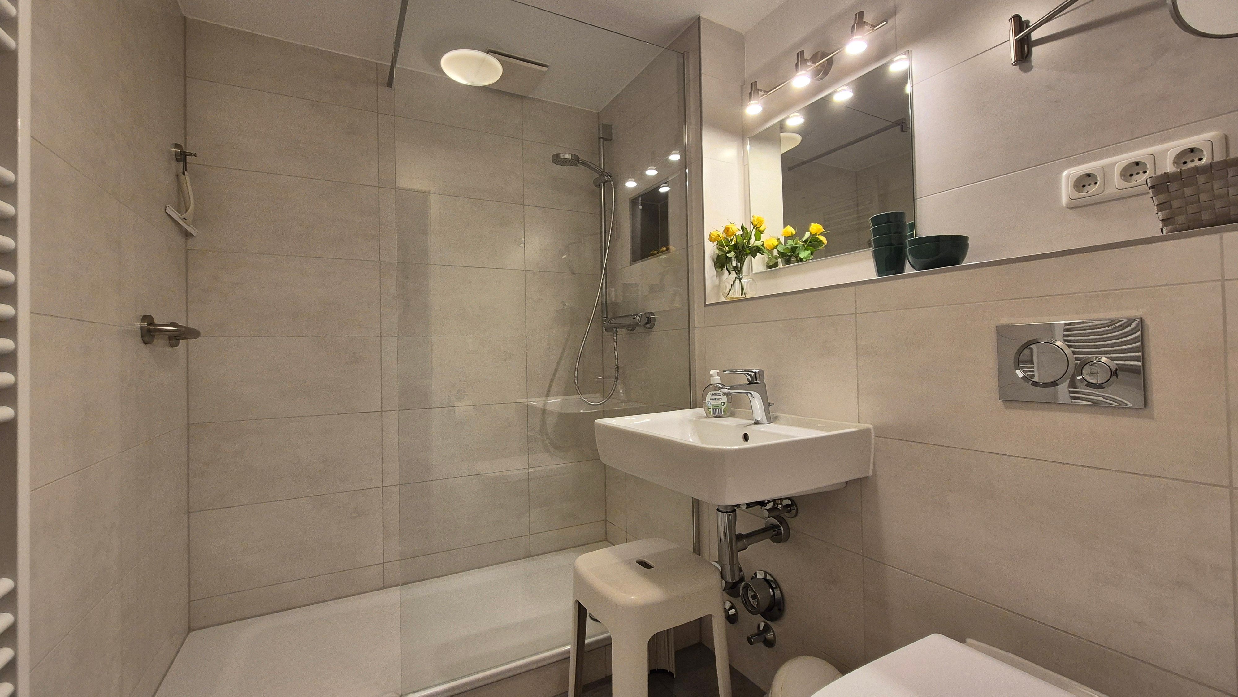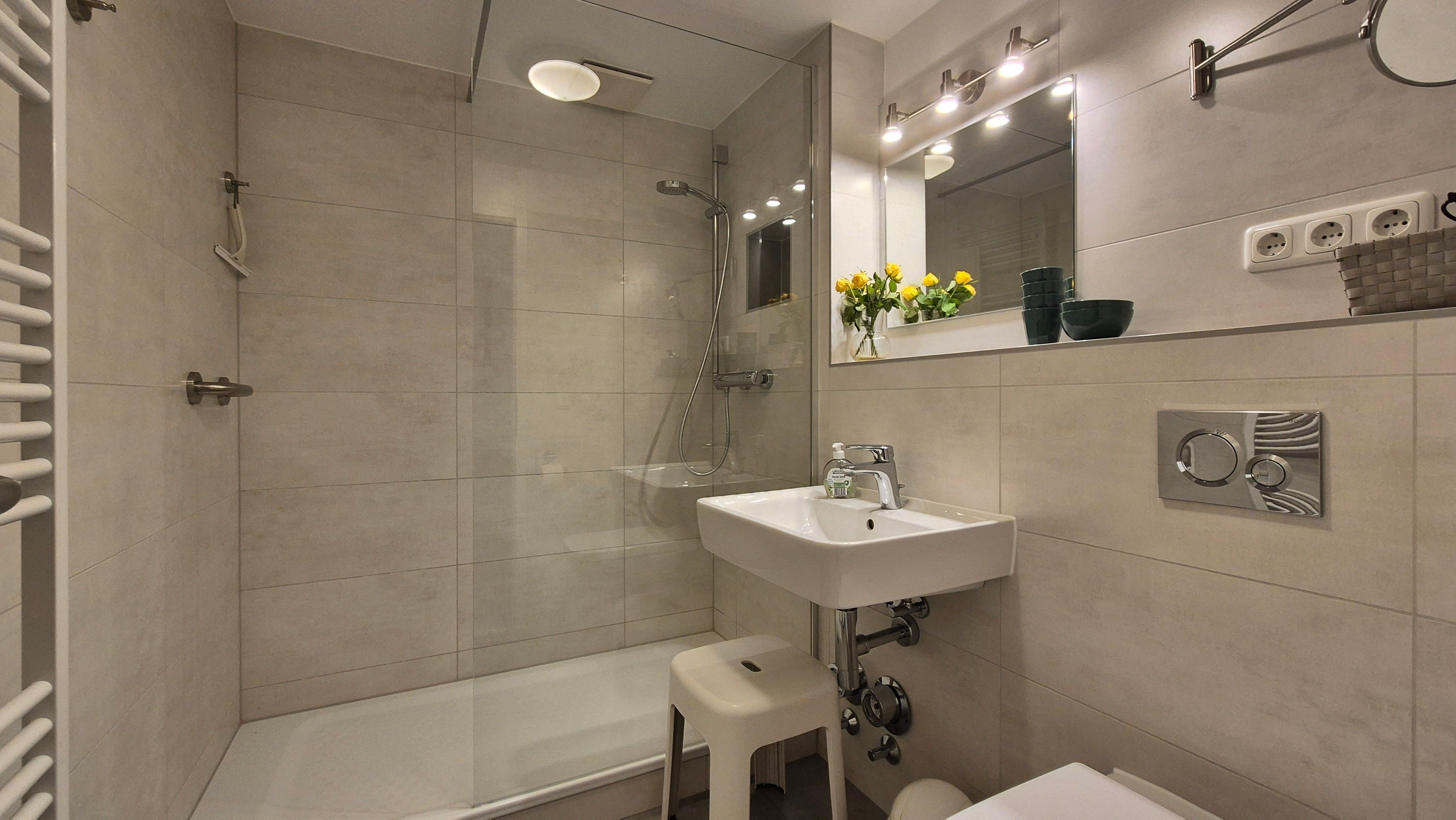 • Badezimmer (renoviert) mit großer ebenerdiger (Walk In Dusche) Dusche, einem Waschbecken, einem Spiegel, einem Kosmetikspiegel und einem WC.