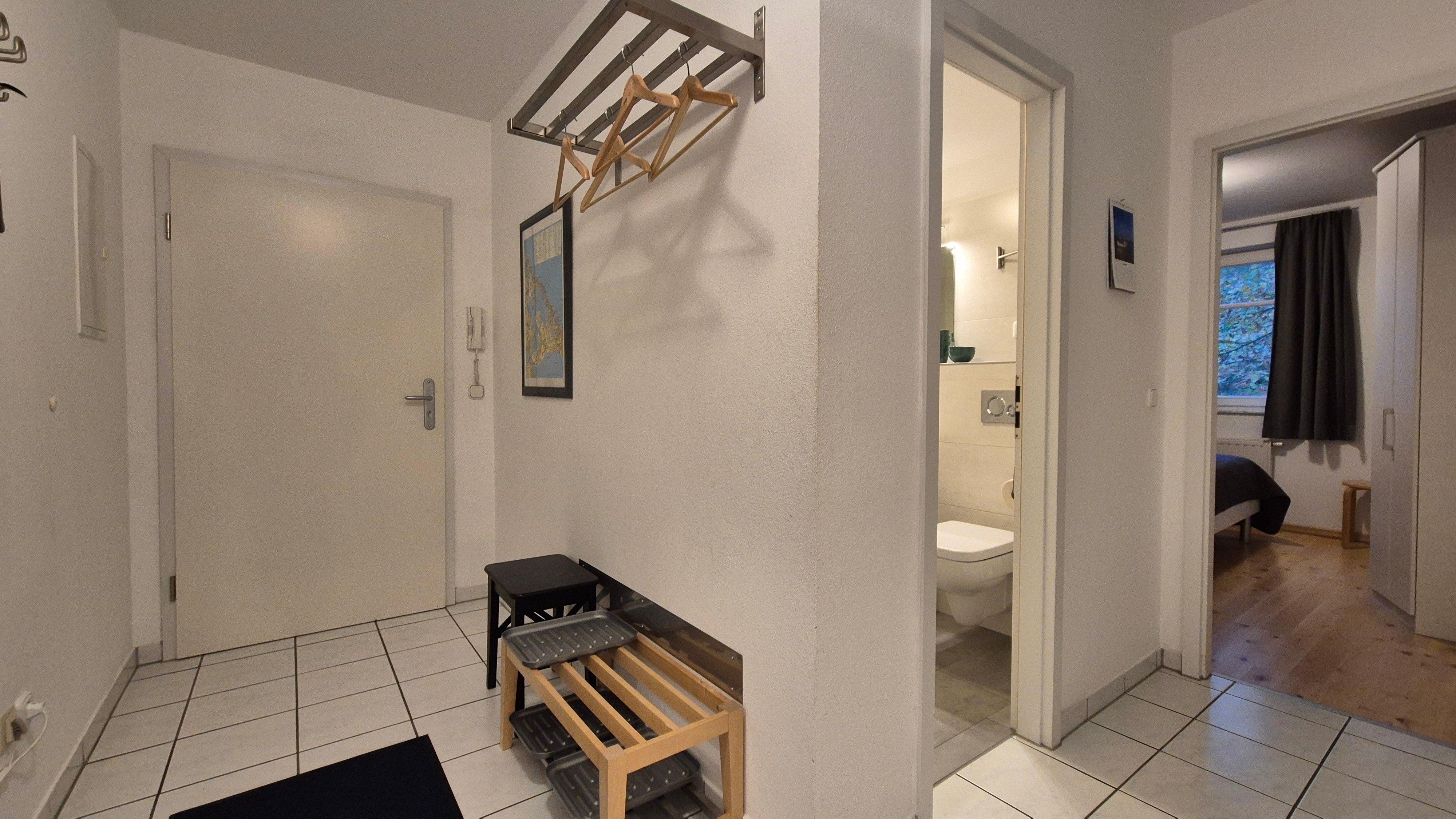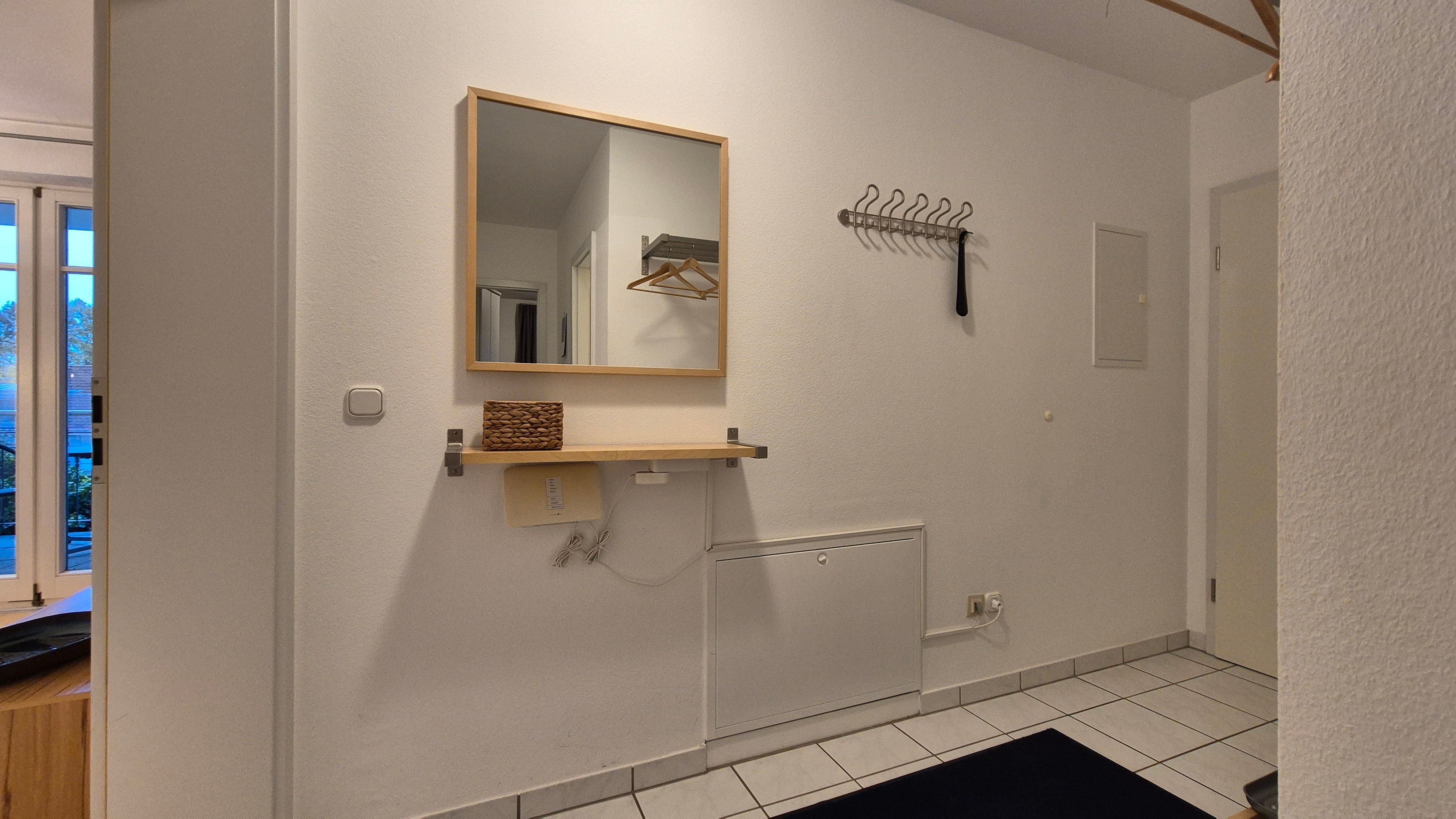 • Der Flur ist ausgestattet mit einer Garderobe, einem Spiegel und einer Ablage.