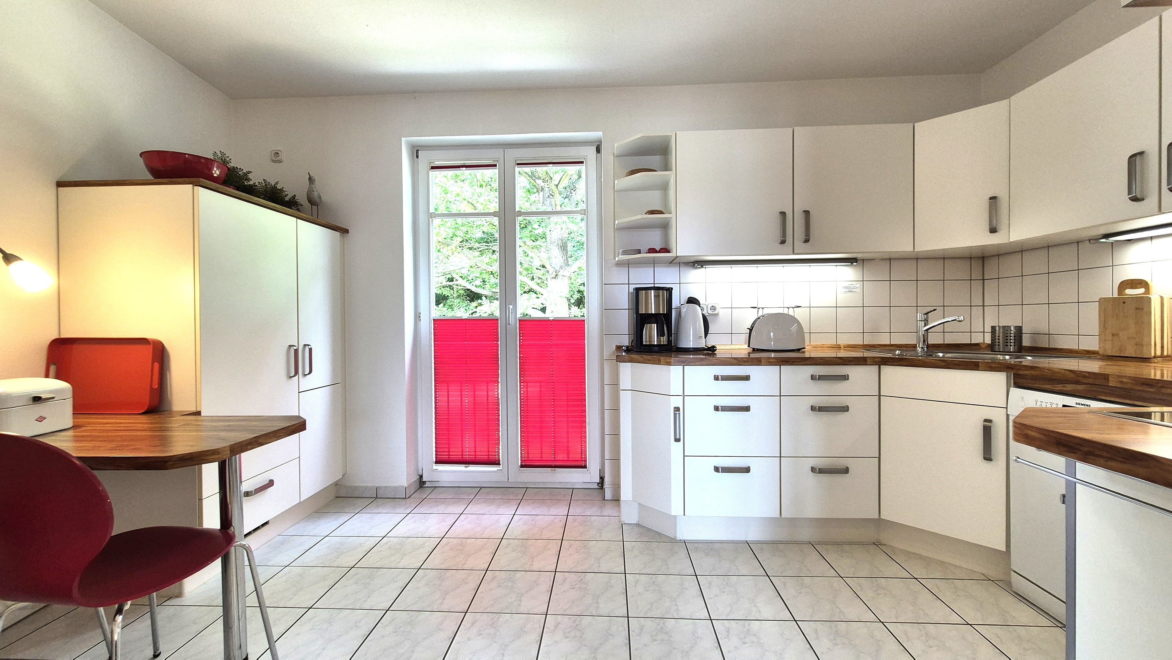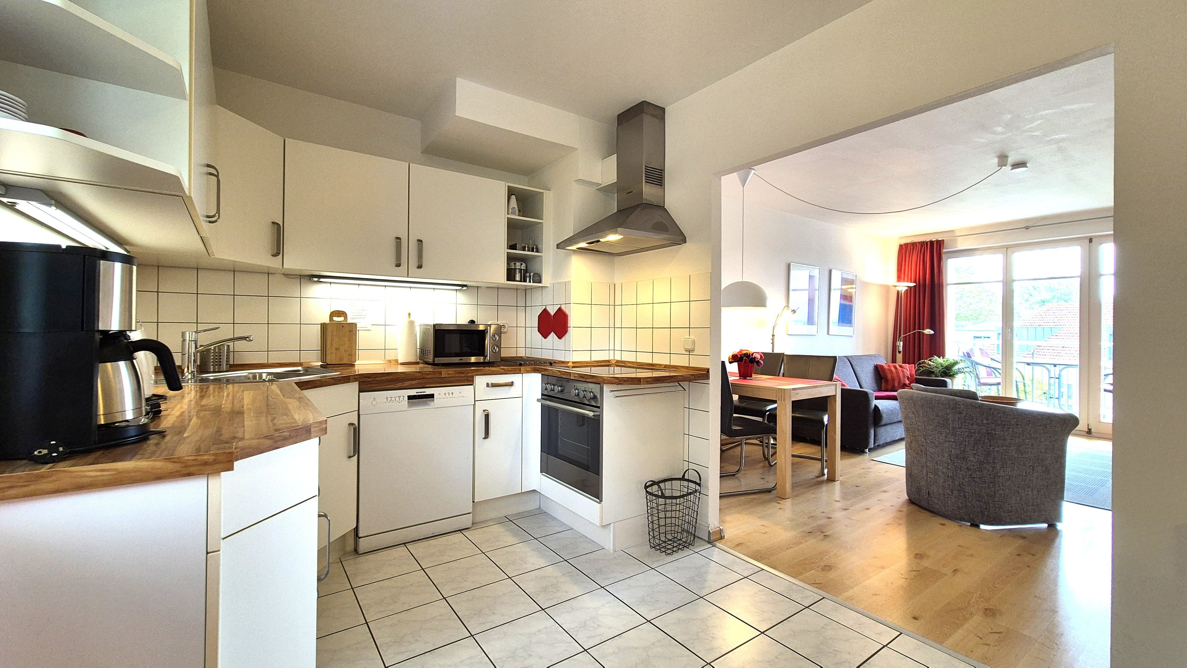 • Küche (mit kleiner Sitzgelegenheit), Spülmasche, Elektroherd, Backofen, Mikrowelle, Kaffeemaschine, Espresso-Kaffepad-Maschine, Kühlschrank mit kleinem Eisfach, sowie einem Wasserkocher und einen Toaster.