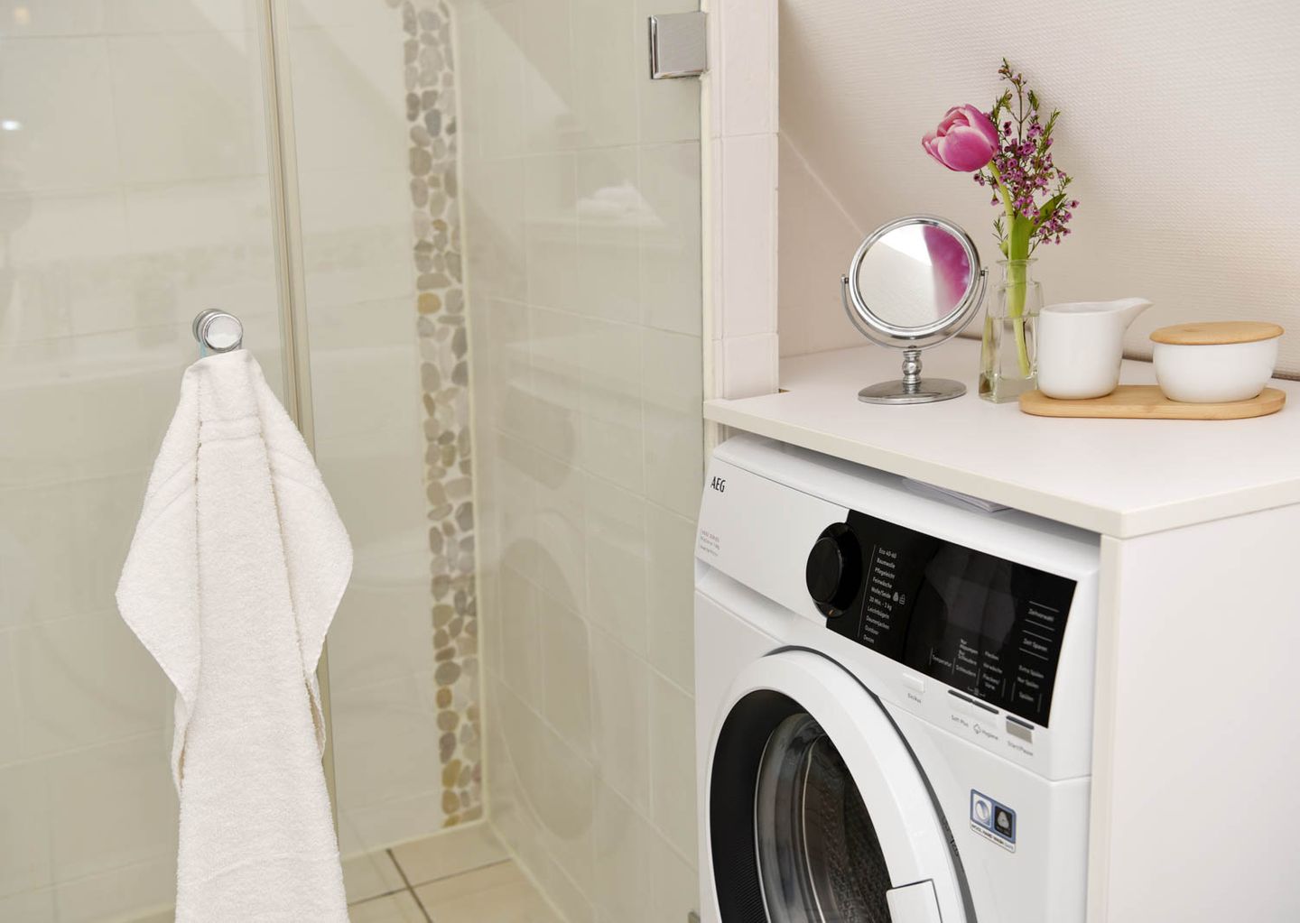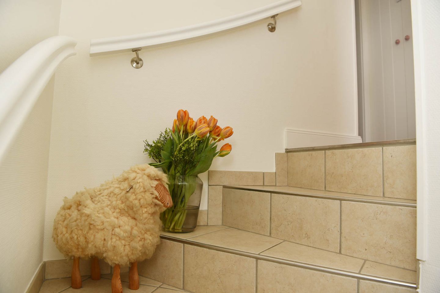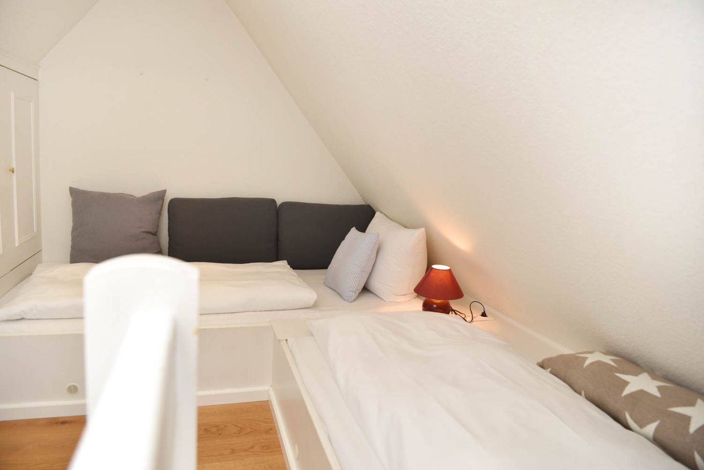 befindet sich im ausgebauten Spitzboden, den Sie über eine bequeme Holztreppe vom Flur aus erreichen.