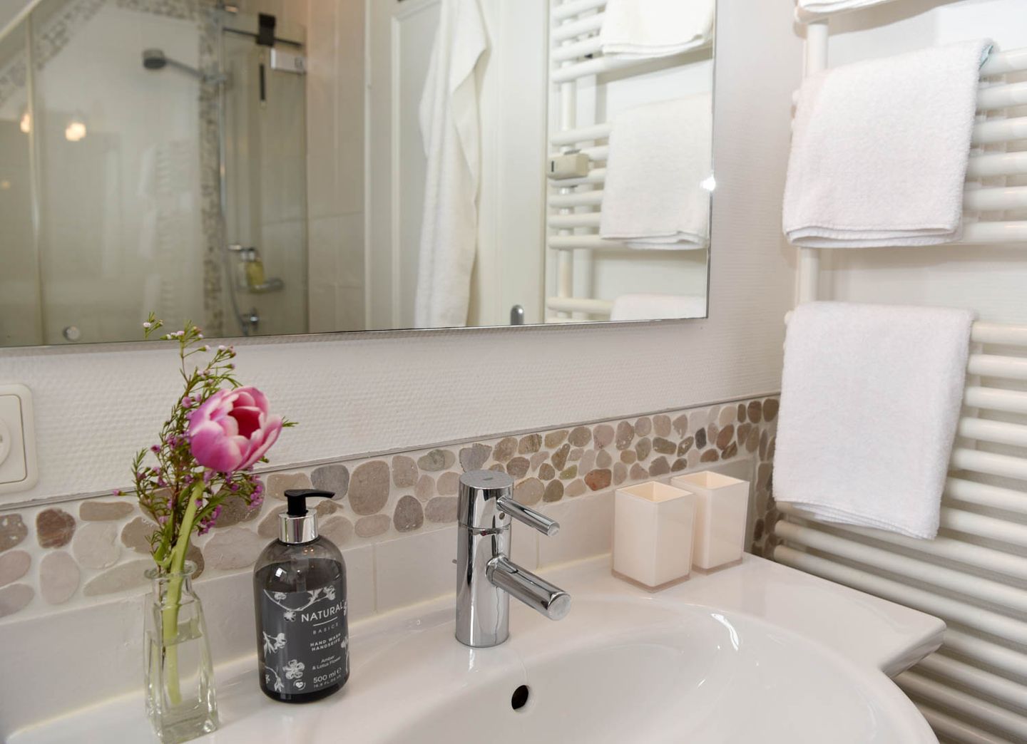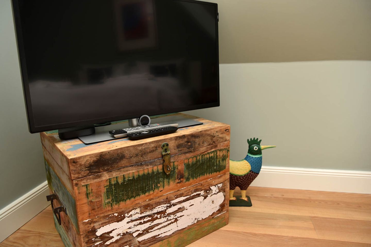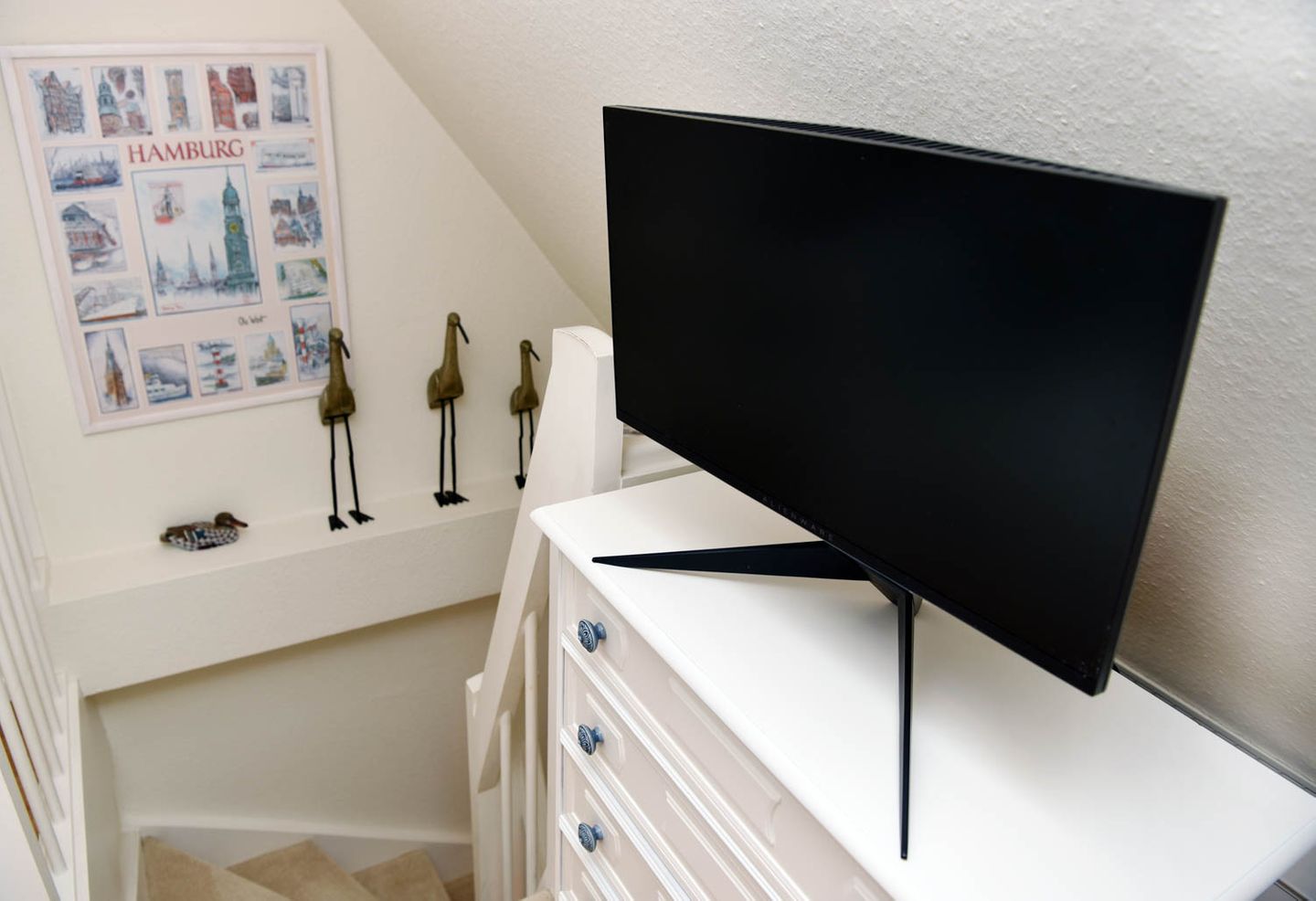 befindet sich im ausgebauten Spitzboden, den Sie über eine bequeme Holztreppe vom Flur aus erreichen.