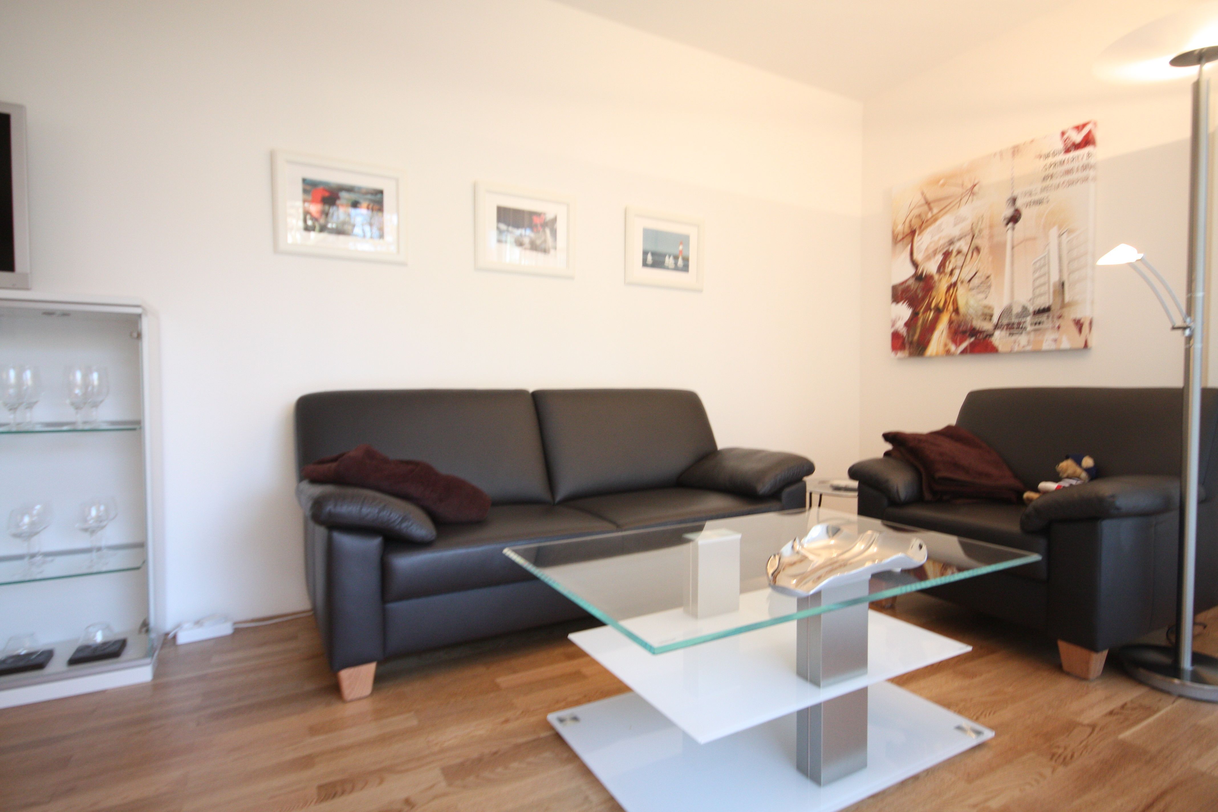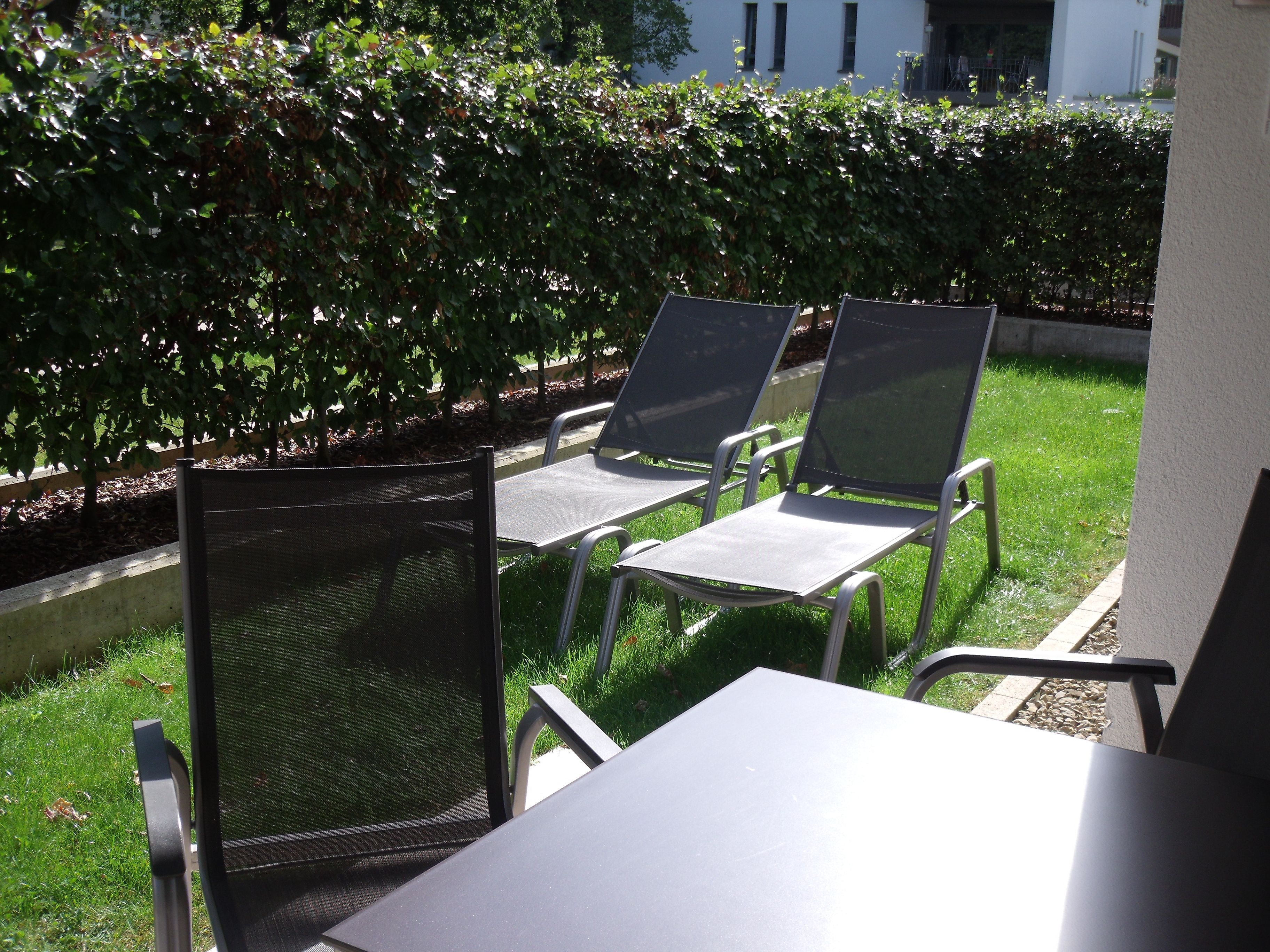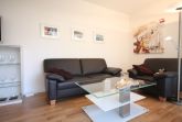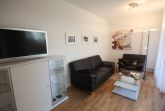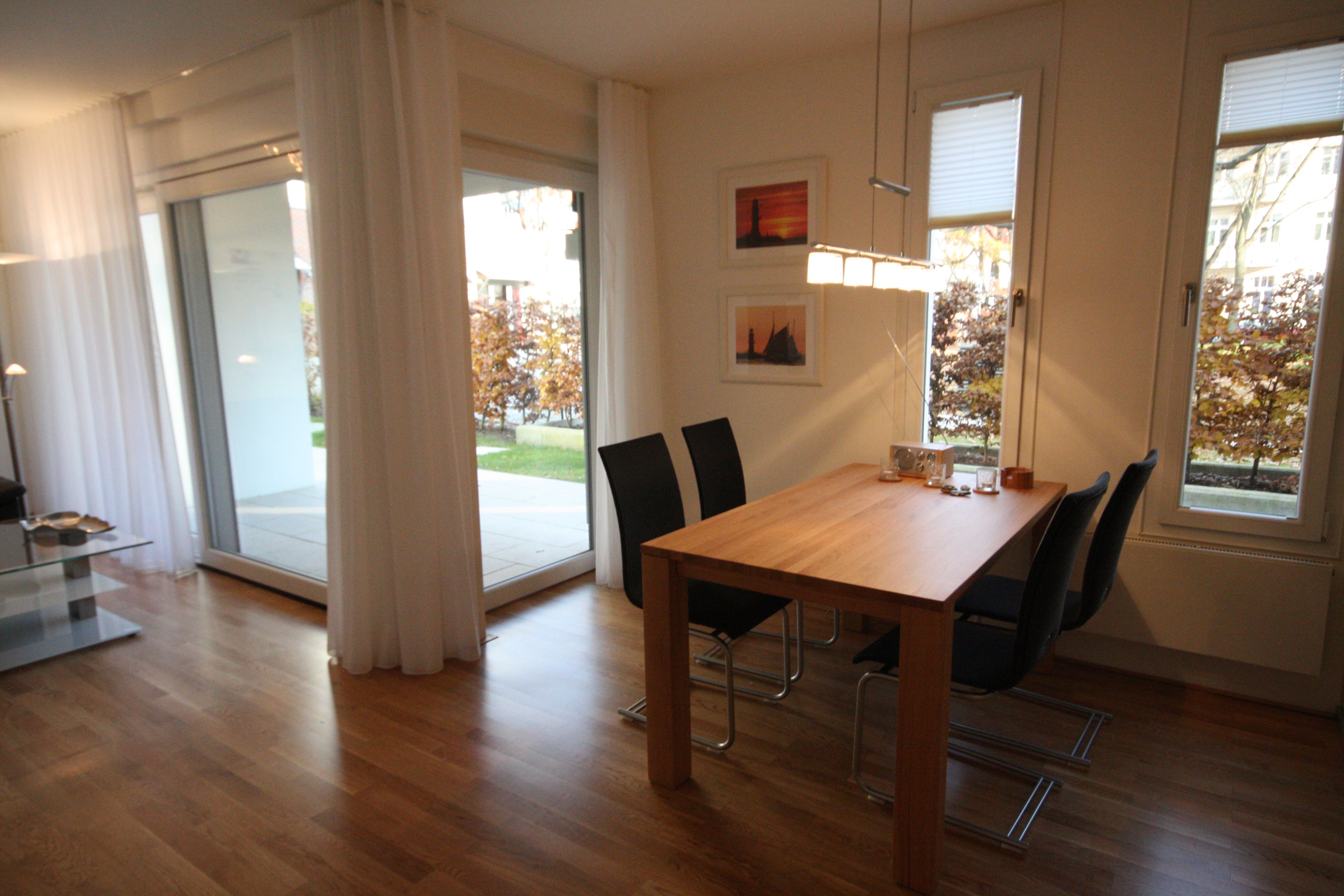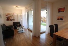 Sie ist hell und modern eingerichtet. Bodentiefe Fenster im Wohnzimmer geben ein exklusives Ambiente. Vom Sofa können Sie auf die Terrasse und den herrlich grün angelegten Vorgarten der Residenz schauen.
