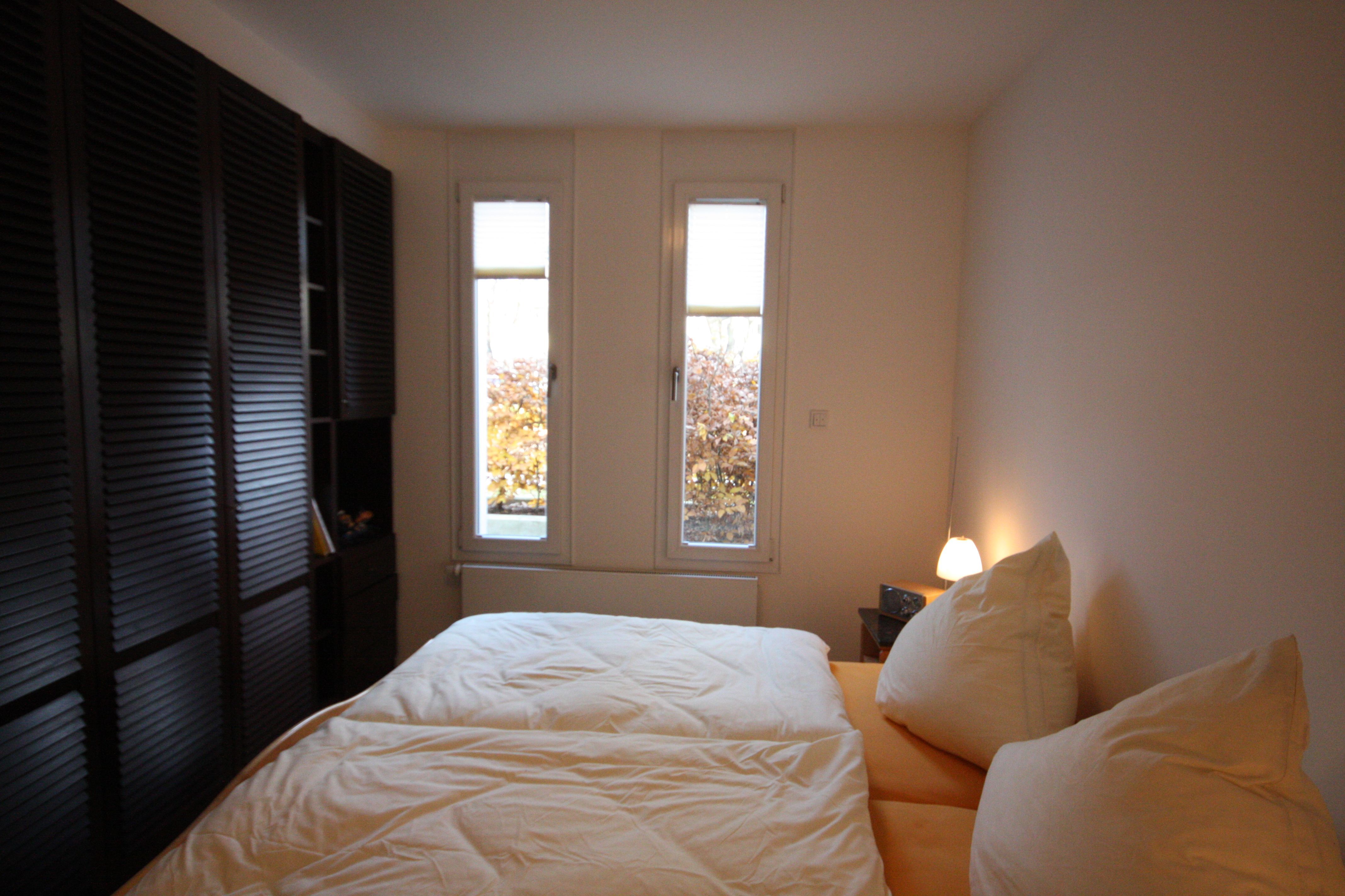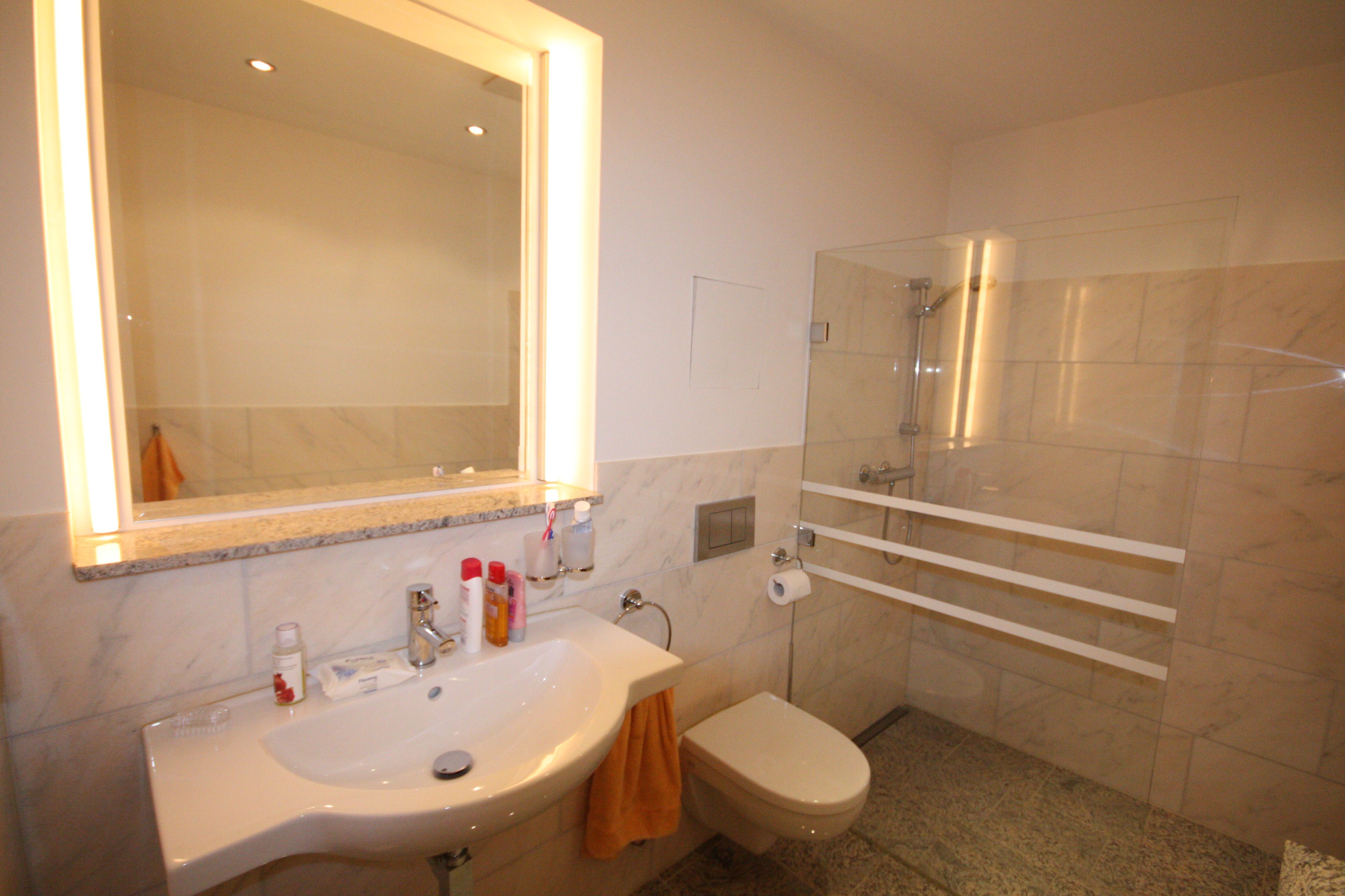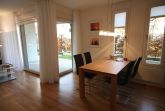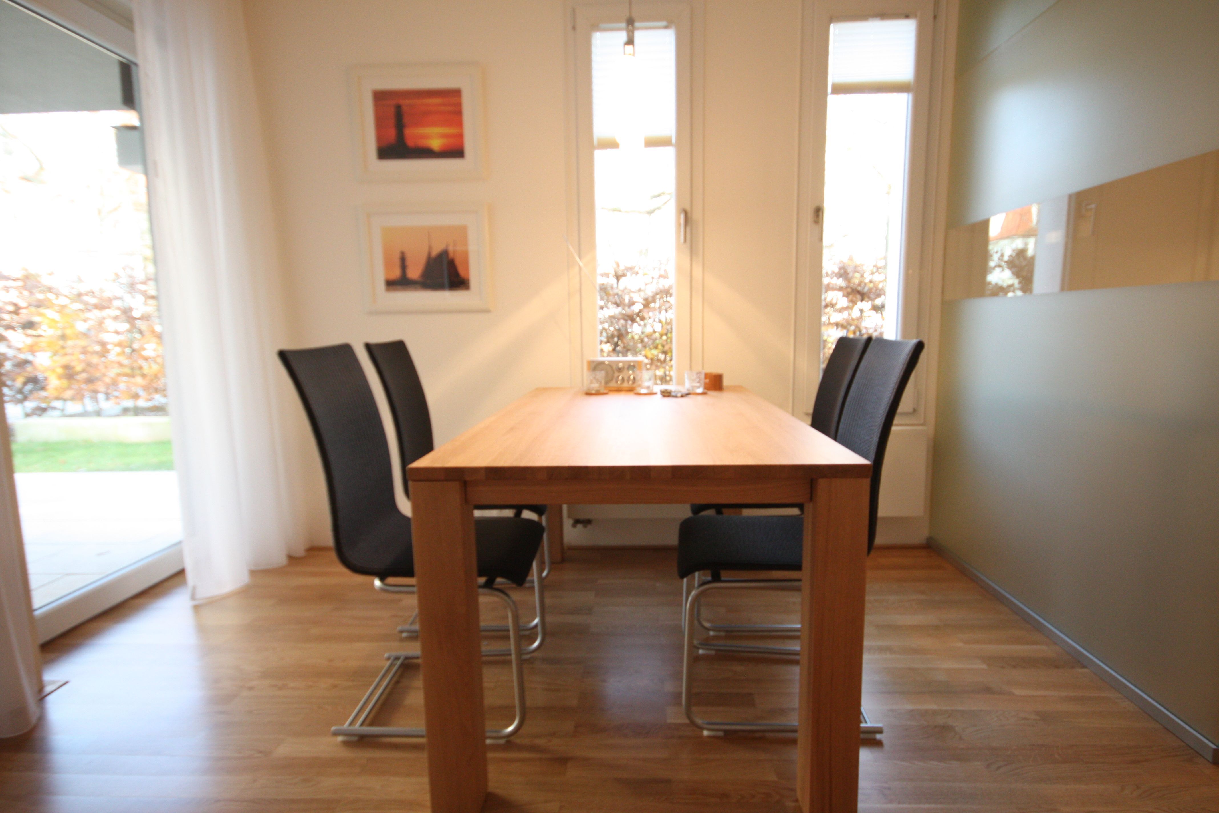 Sie ist hell und modern eingerichtet. Bodentiefe Fenster im Wohnzimmer geben ein exklusives Ambiente. Vom Sofa können Sie auf die Terrasse und den herrlich grün angelegten Vorgarten der Residenz schauen.
