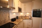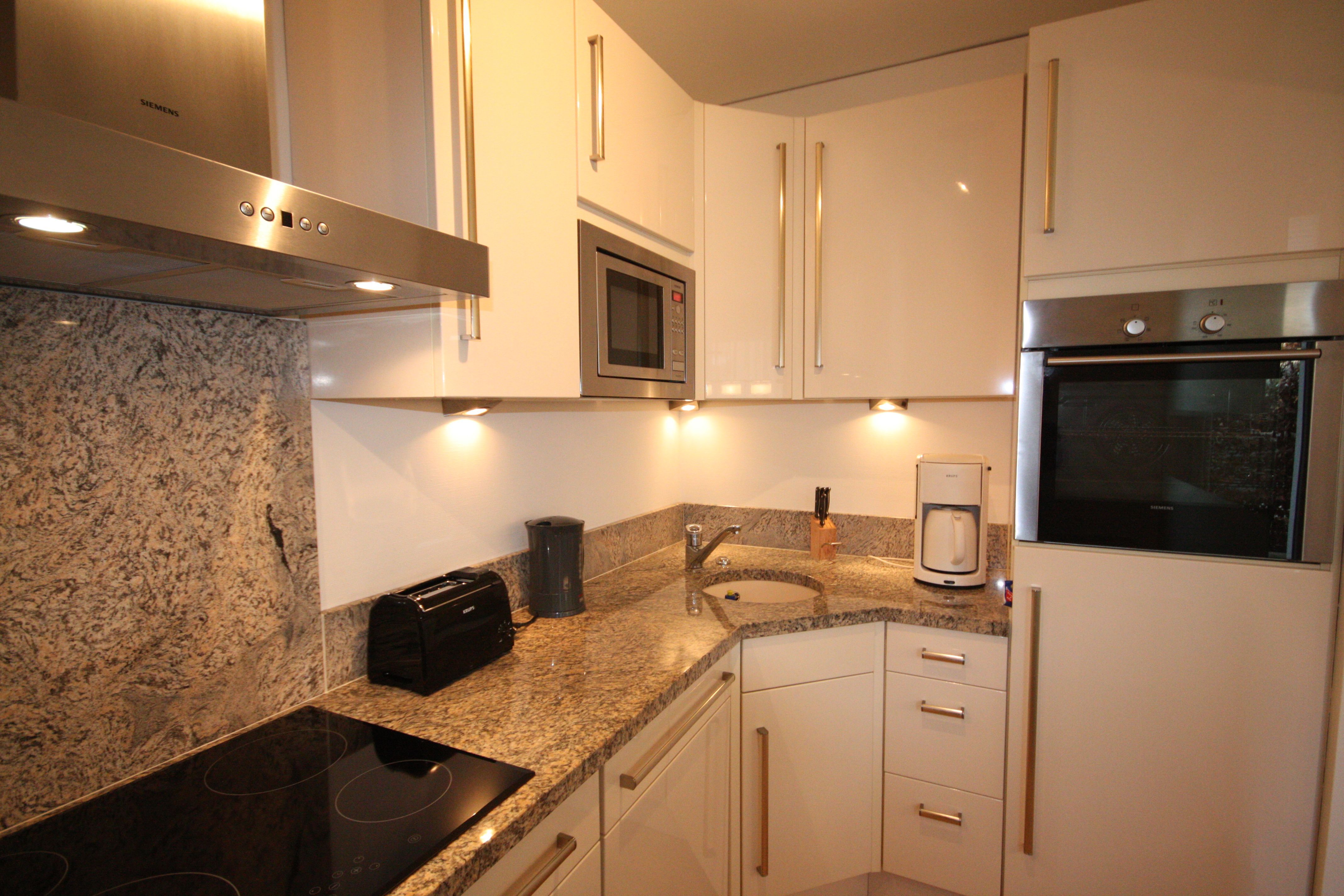 Die sehr gut ausgestattete Küche ist mit einer mattierten edlen Glaswand optisch vom Wohnraum getrennt. Das Schlafzimmer ist mit Doppelbett und einem großen Schrank ausgestattet. Das Badezimmer verfügt über eine begehbare Dusche.