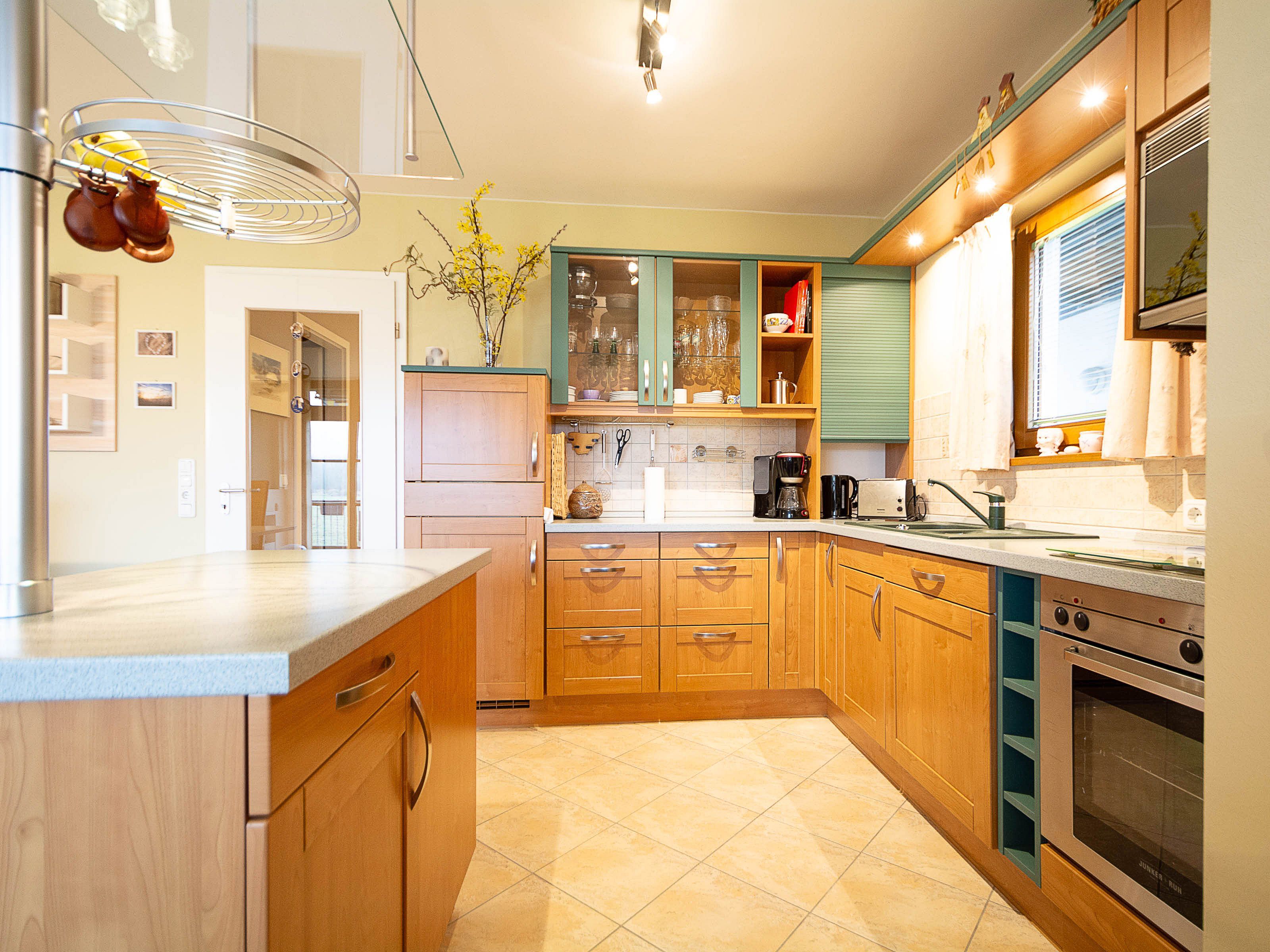 Die angrenzende, voll ausgestattete Wohnküche lässt keine Wünsche offen: Geschirrspüler, Backofen mit Ceranfeld, Kühlschrank, Gefrierschrank, Mikrowelle, Kaffeemaschine, Toaster, Wasserkocher und notwendige Küchenutensilien stehen Ihnen zur Verfügung - damit Sie sich während Ihres Urlaubs rundum wohlfühlen.